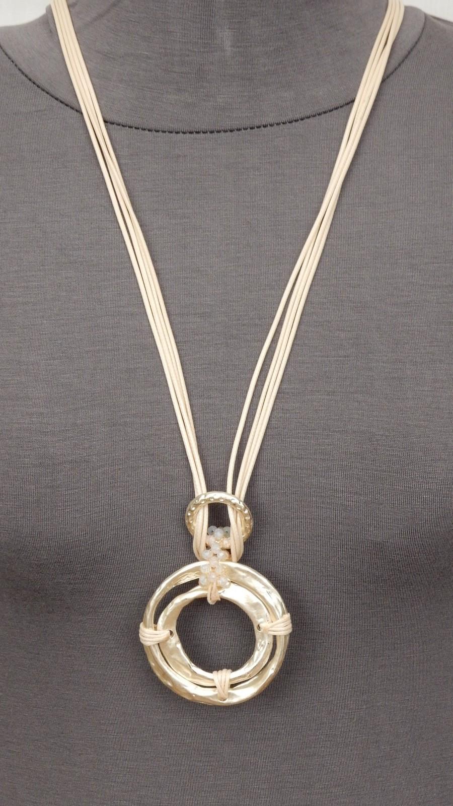 Достаточно массивный кулон на шнурках бежевого цвета.