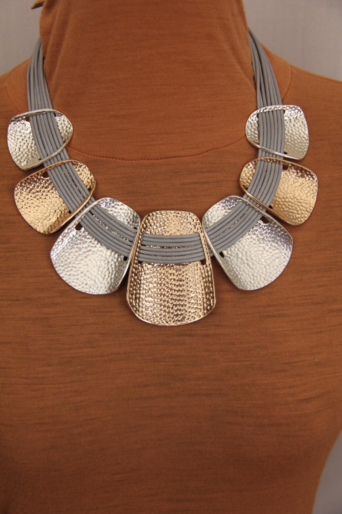 Колье из золотых и серебряных элементов.Это аксессуар берёт на себя достаточно большой акцент. Рекомендуем украсить однотонное платье или блузку.