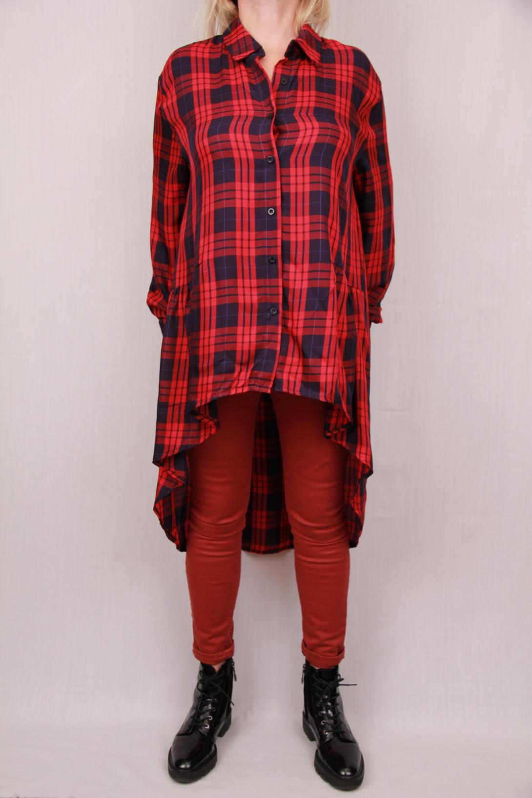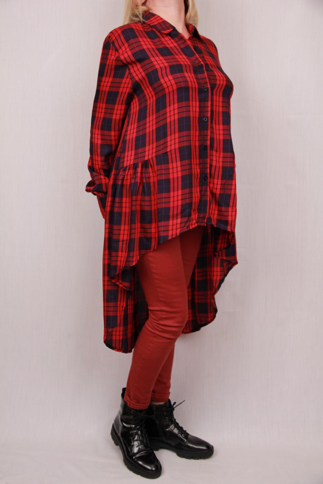 Красная удлинённая рубашка в клетку, да ещё разнополой длинны, сейчас на пике моды. Такую рубашку можно носить нараспах , одев вовнутрь топ или футболку с принтом.