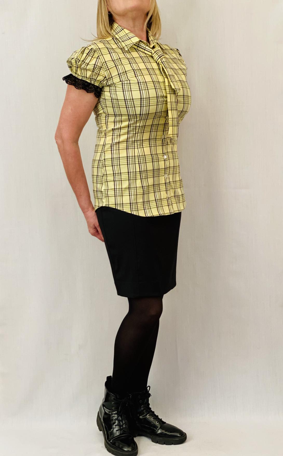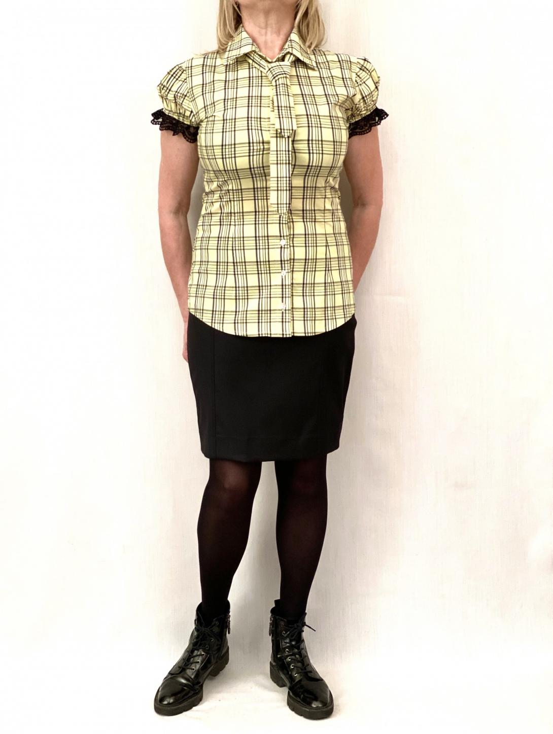 Эффектная итальянская блузка Denny Rose с коротким рукавом,украшен кружевом.В комплекте есть галстук из анналогичной ткани,который можно завязать бантом.