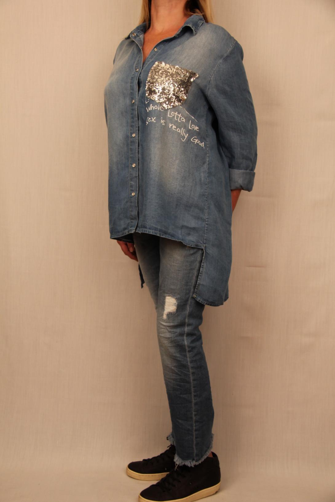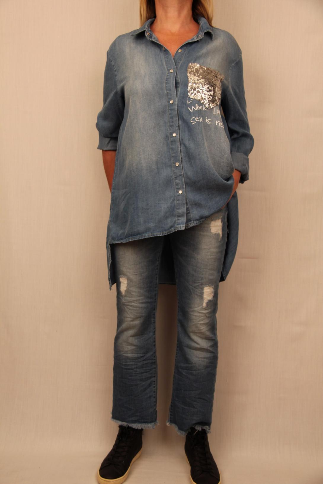 Классная джинсовая рубашка с блестящим карманом. Рубашка свободная,закрывает бёдра.