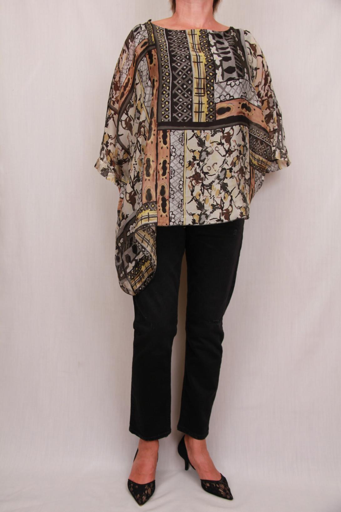 Шёлковая блузка-кимоно с оригинальным принтом в модных в этом сезоне чёрно-горчичных тонах.