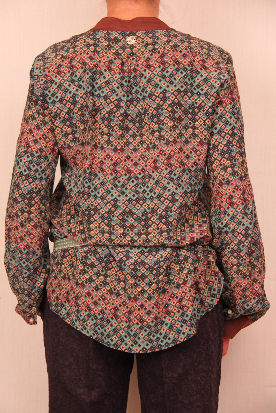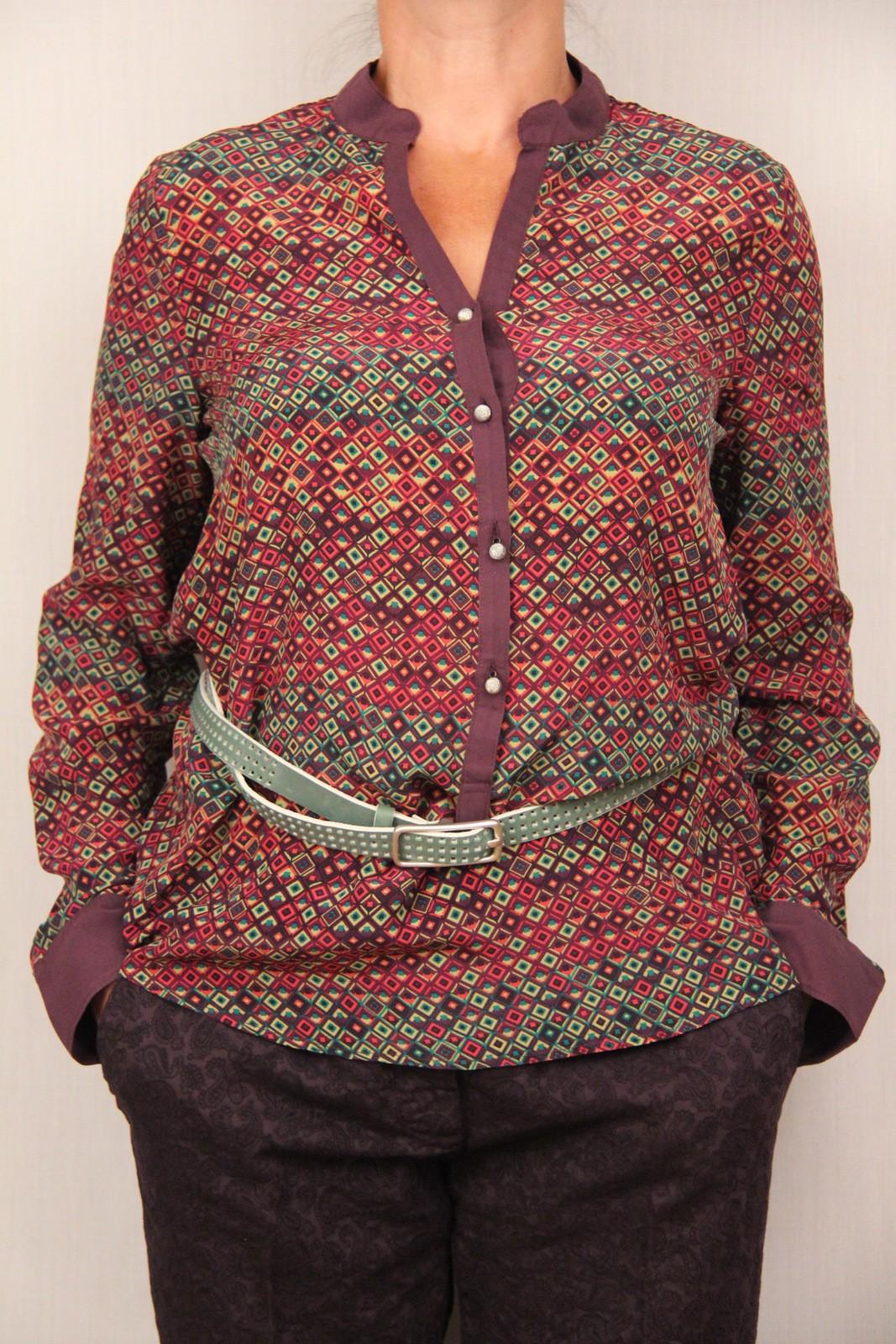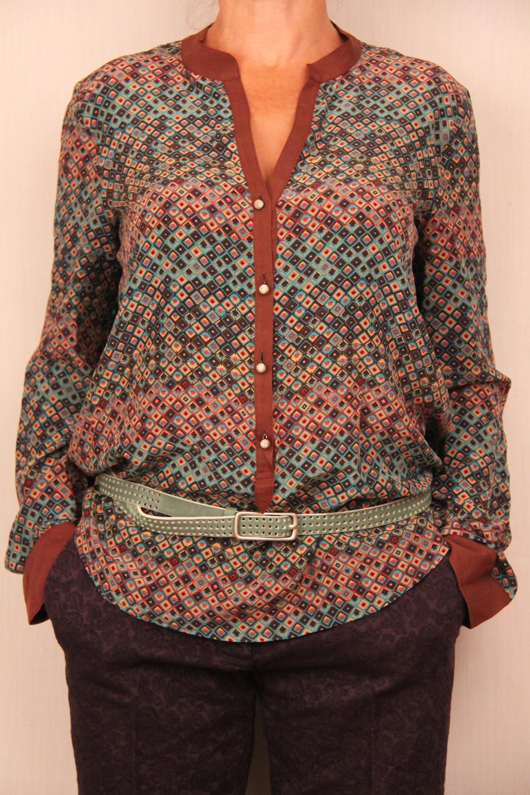 Блузка из шёлка ,прикрывает бёдра, рубашечного кроя. Идеально одевать с ремнём. Отделка ворота однотонным шёлком.Блузка зеленого цвета ( размер 48 ) и винного цвета (размер 46). Комплектуется с брюками винного цвета или конореечного из коллекции Manila Grace.Маркировка размеров итальянская.