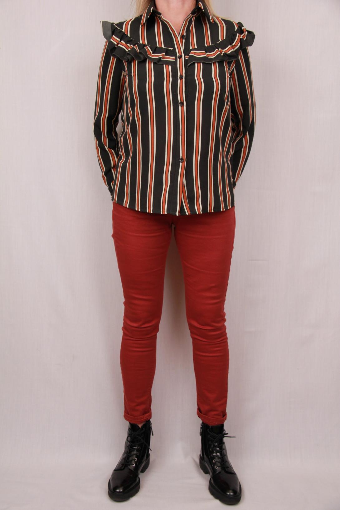 Нарядная блузка цвета хаки с оранжевой полоской.