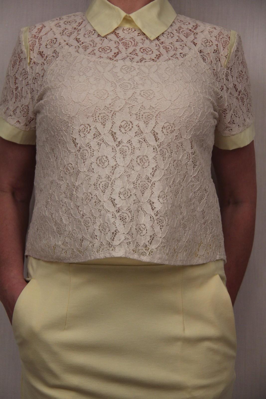 Красивая блузка из кружевного полотна. Блузка укороченная, по спине пуговицы.Блузка имеет строгий воротник бледно жёлтого цвета.