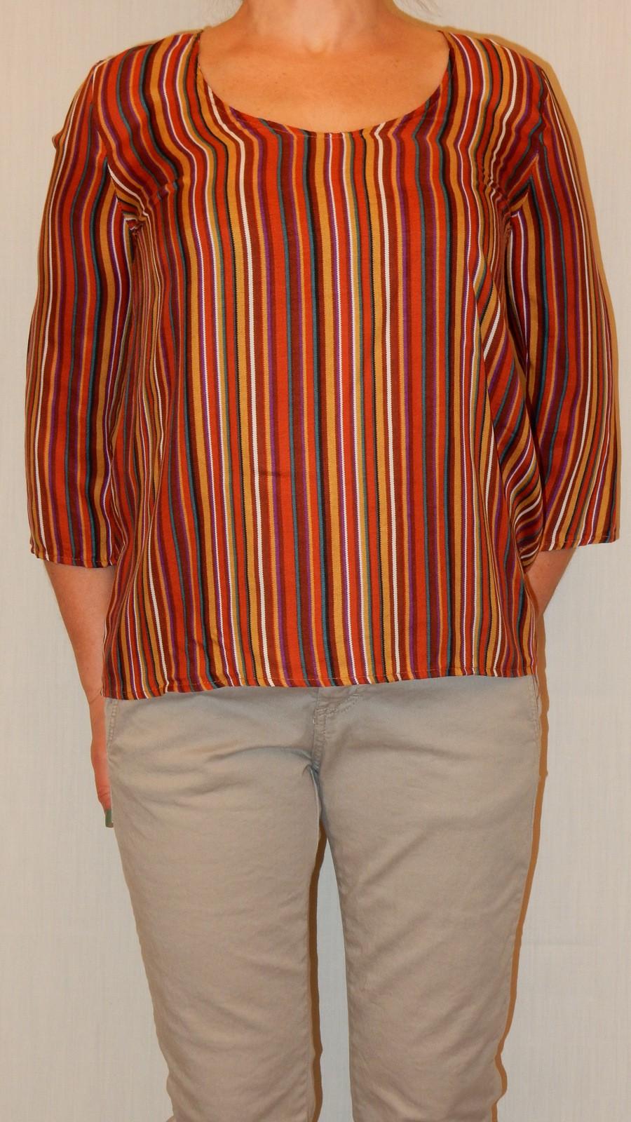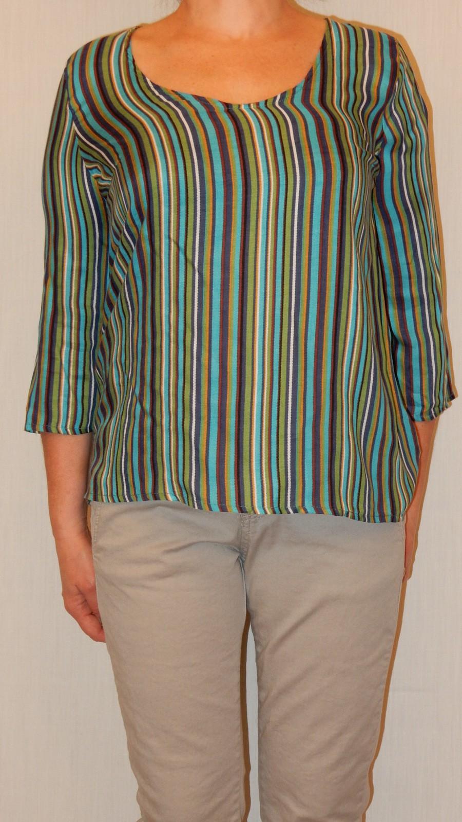 Ярка полосатая блузка. Блузка имеет рукав 3/4 Цвет зелено-синий.