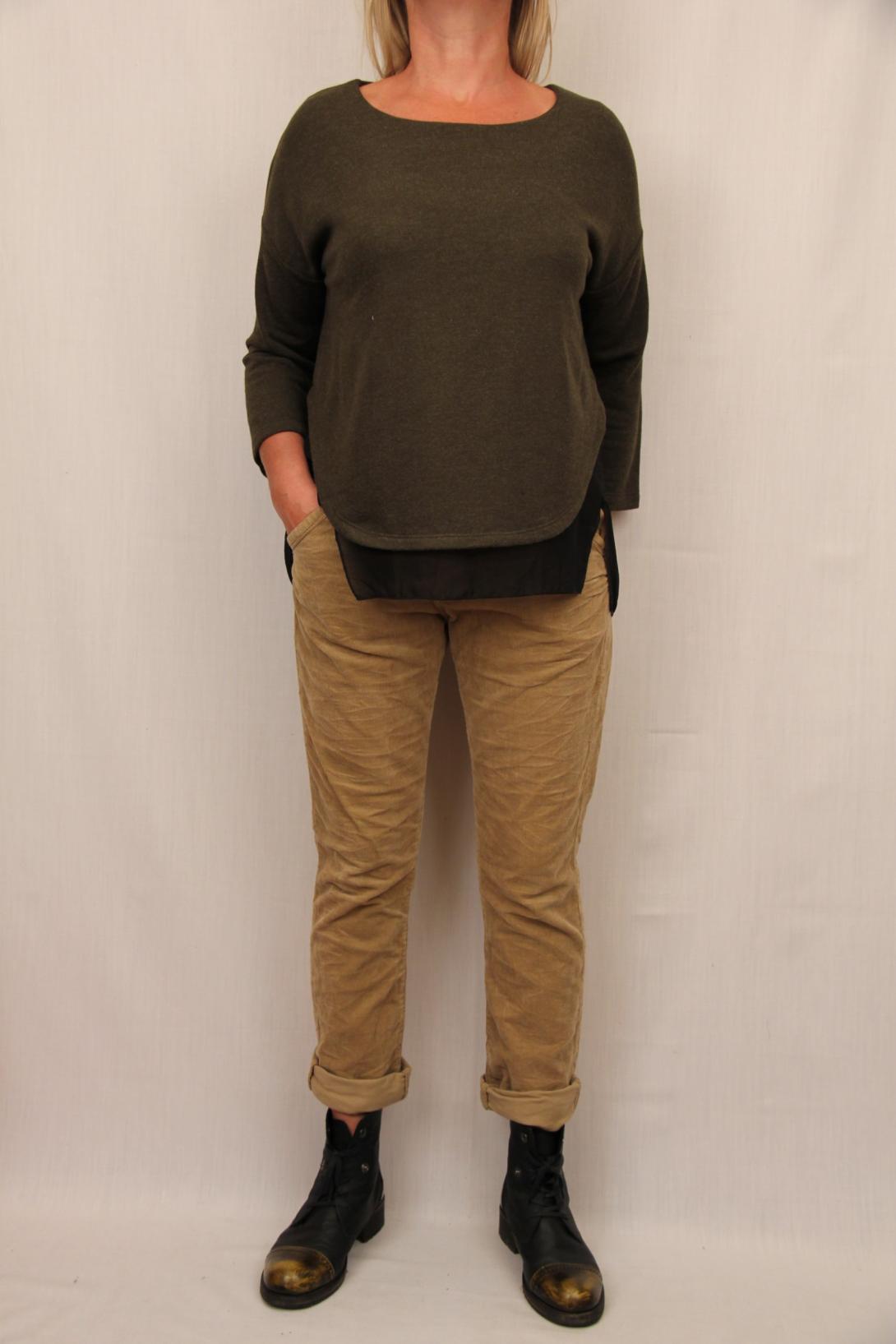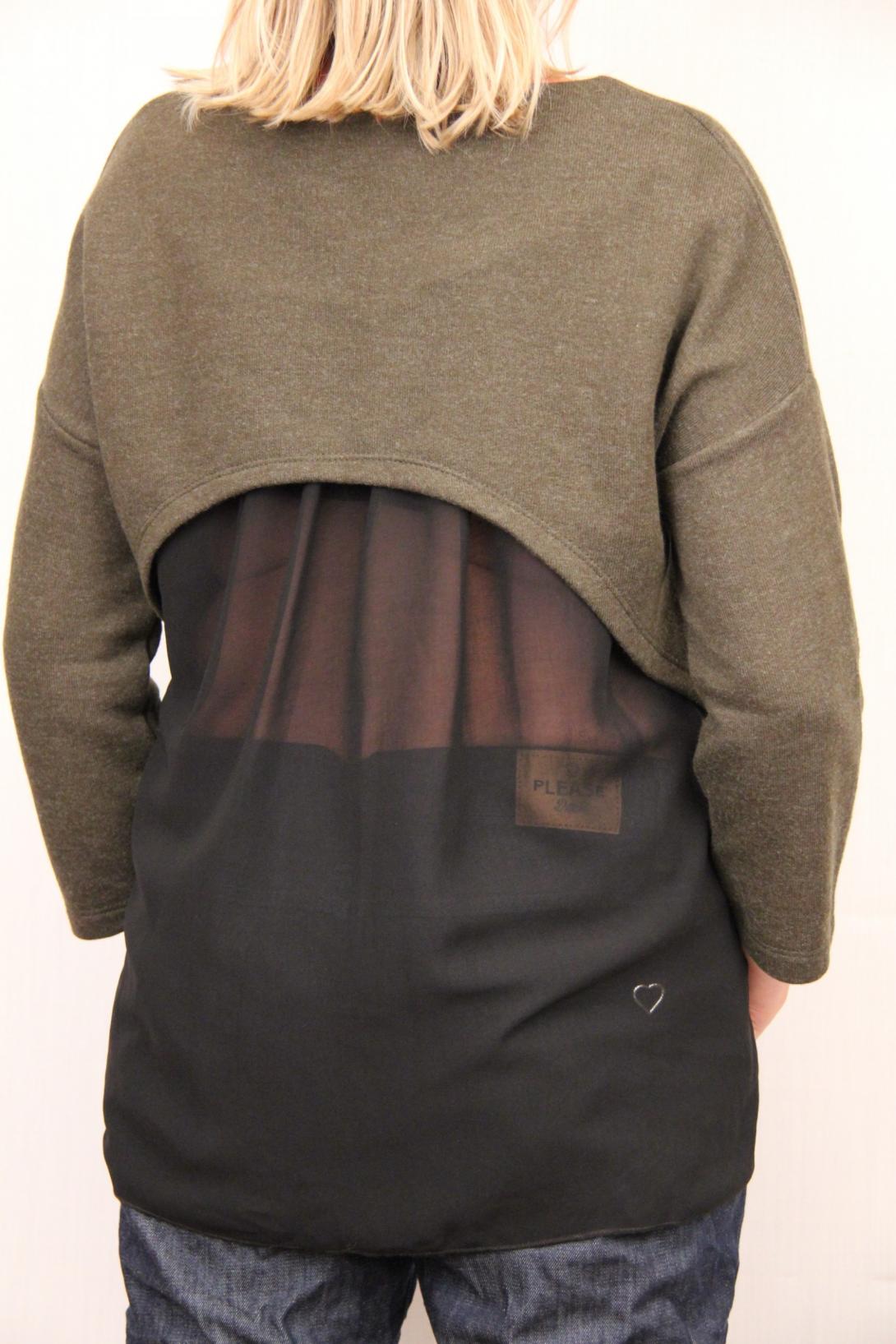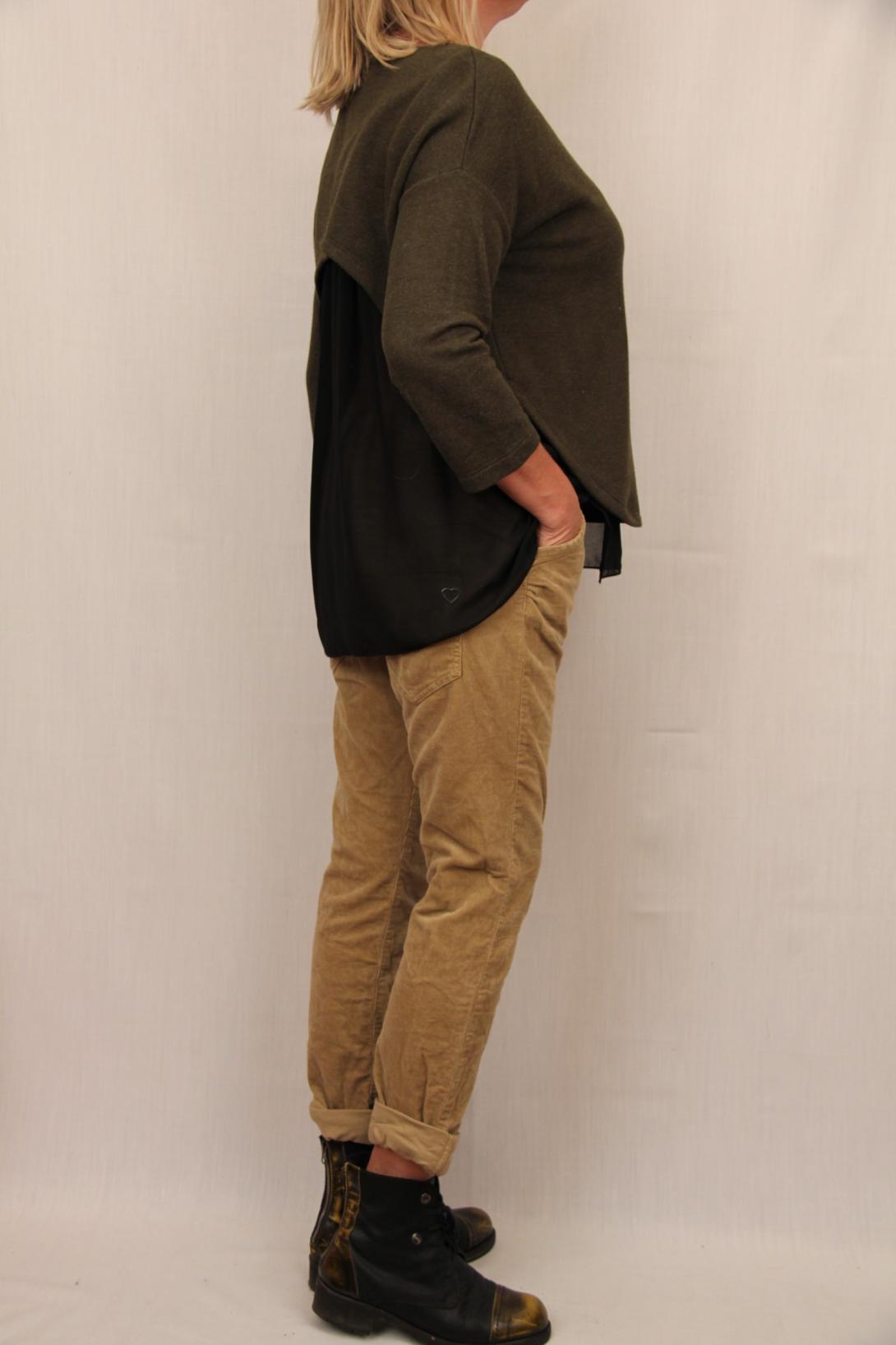 Комбинированный трикотажный блузон в очень модных цветовых решениях- милитари и чёрный.Блузон можно носить самостоятельно, а можно поддевать топ или майку- борцовку.