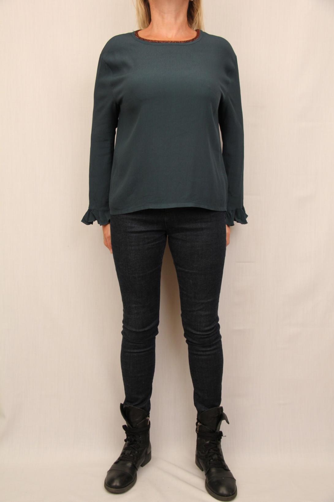 Стильная блузка с длинным рукавом. .Ворот блузки украшен люрексом в свекольных тонах.Цвета-морской волны.