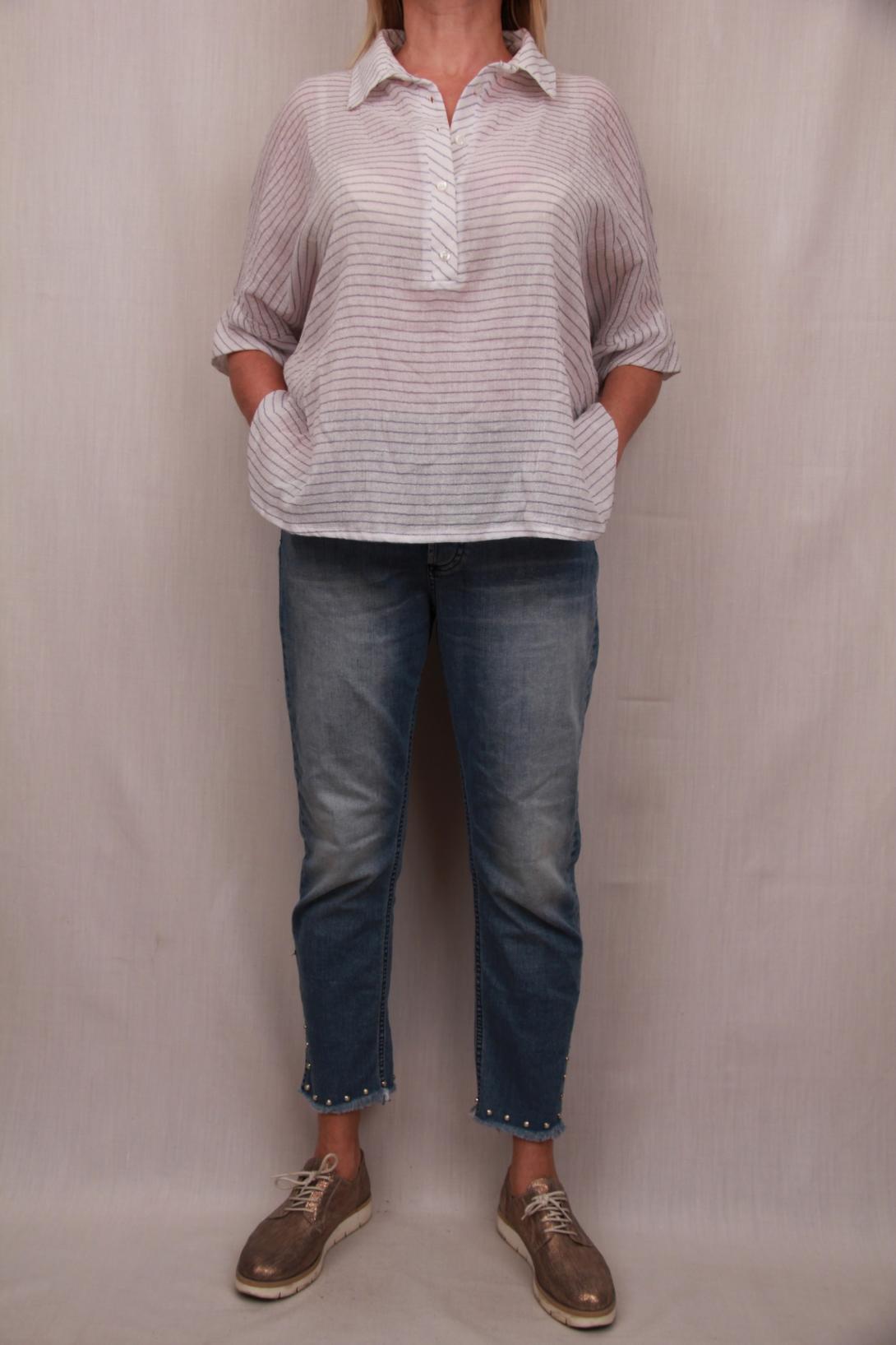 Свободная блузка в стиле кимоно в бледно голубую полоску. Блузка такого плана отлично подходит по цвету к джинсам голубого цвета от ит.бренда please.