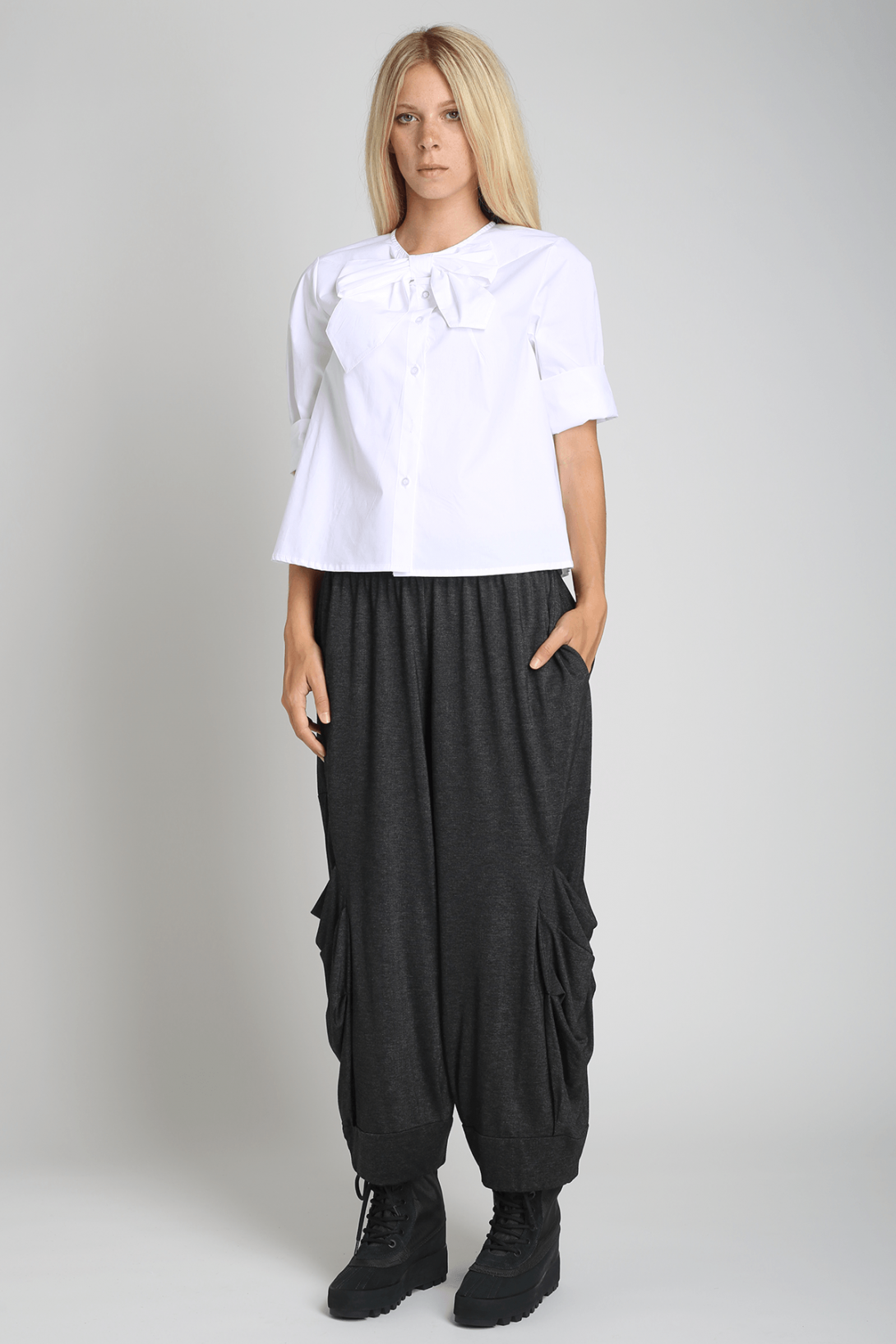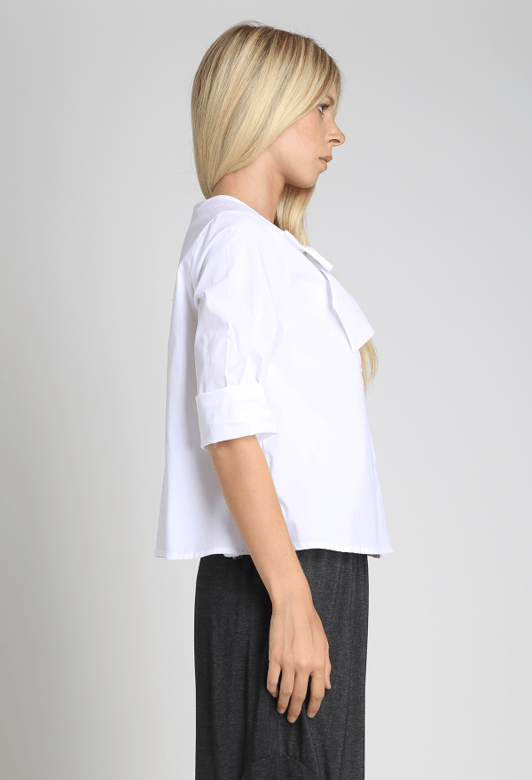 Блузка не стандартная с праздничным бантом.Блузка не длинная, рекомендуем комплектовать с юбкой или брюками с высокой посадкой.Бант легко снимается.Имеются вточные карманы.