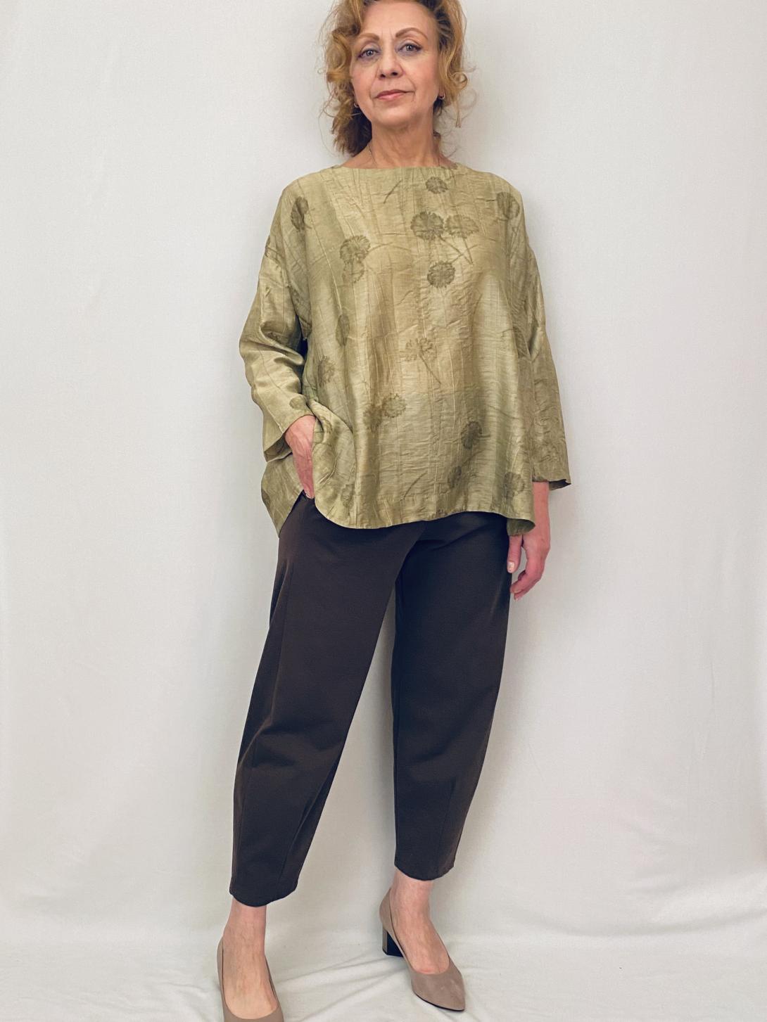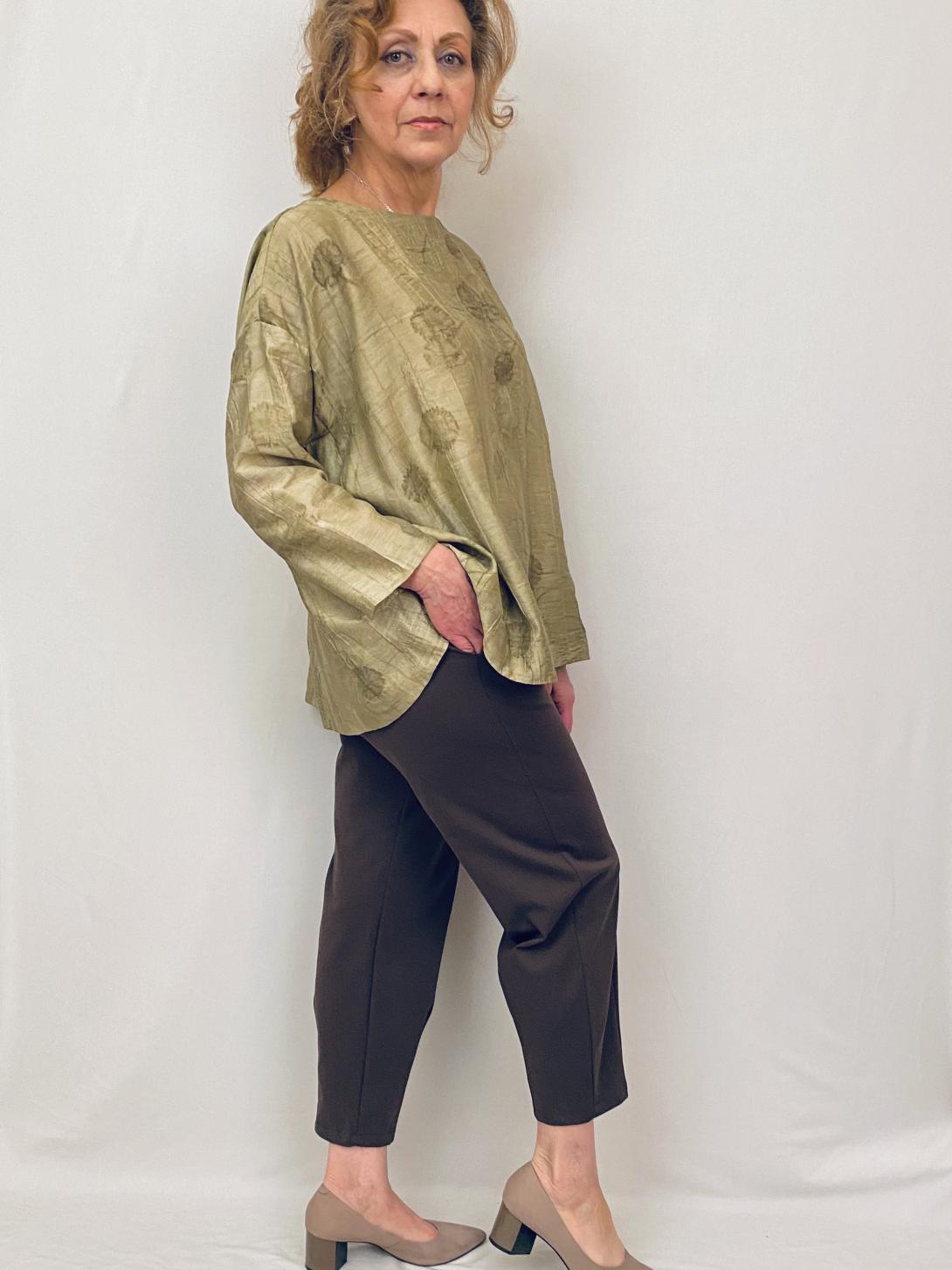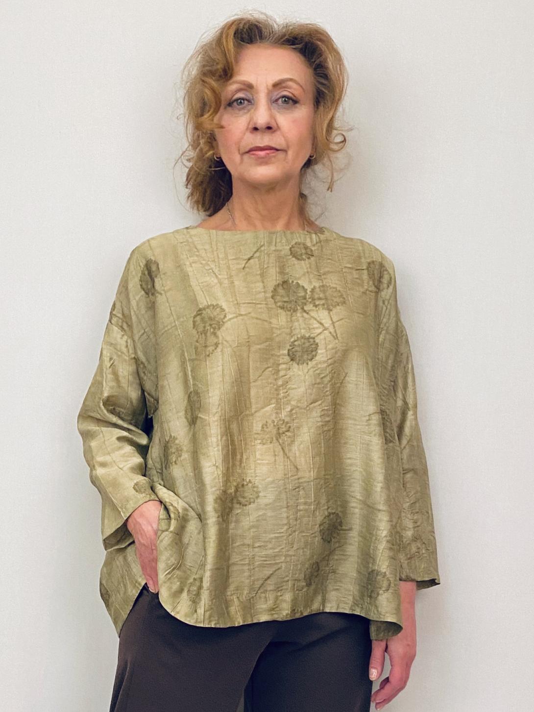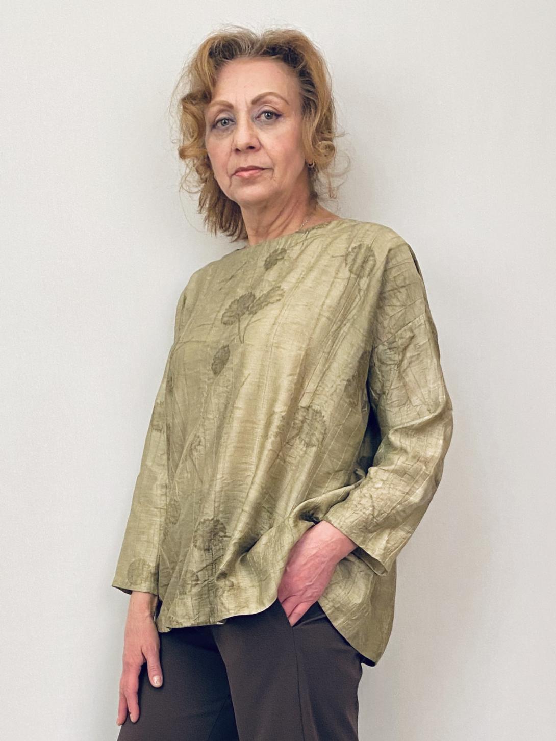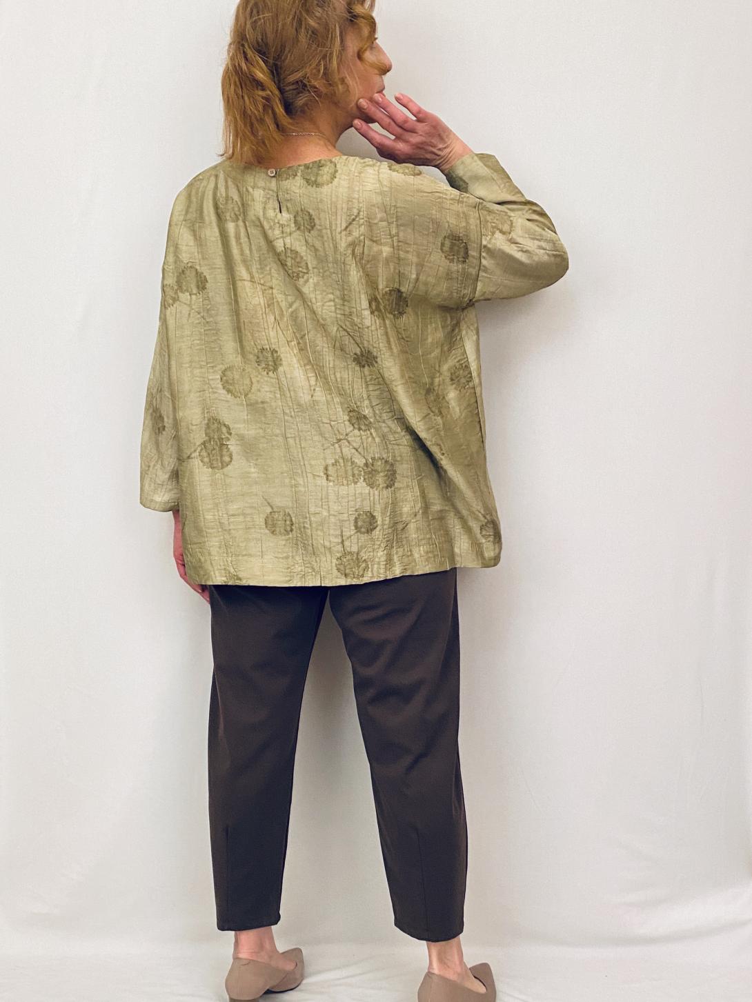 Блузка красивая в золотистом цвете. Застёжка сзади, спущенный рукав, свободный силуэт. Обратите внимание на ширину рукава, если полные руки обратите внимание, что стрейча нет!