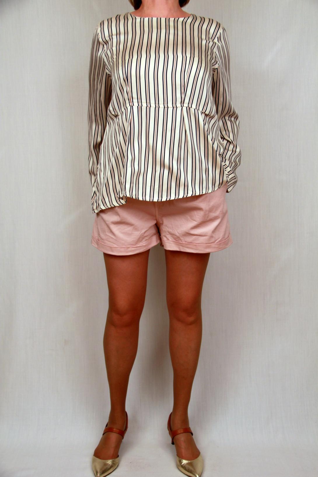 Стильная атласная блузка,производства Италии,в продольную полоску. Оригинальный крой блузки удачно маскирует область живота.