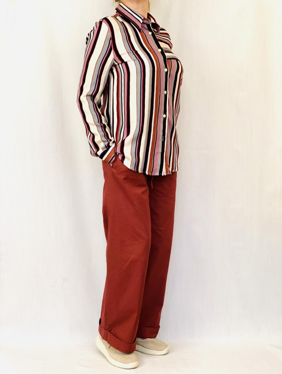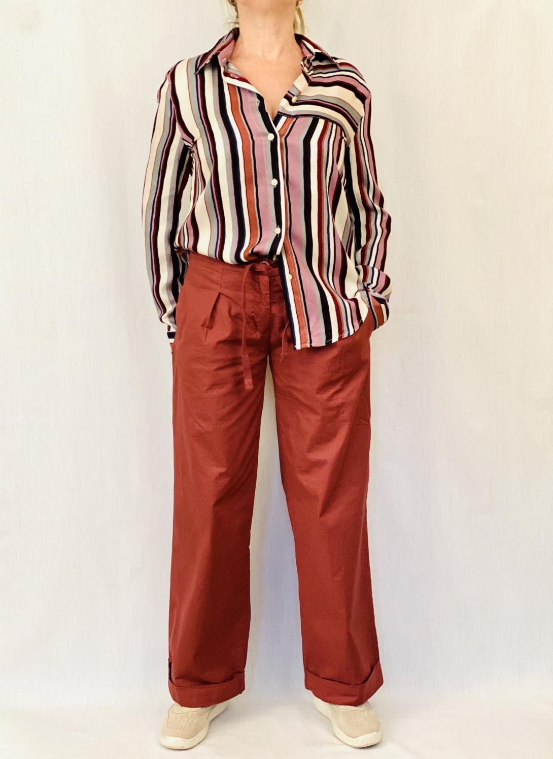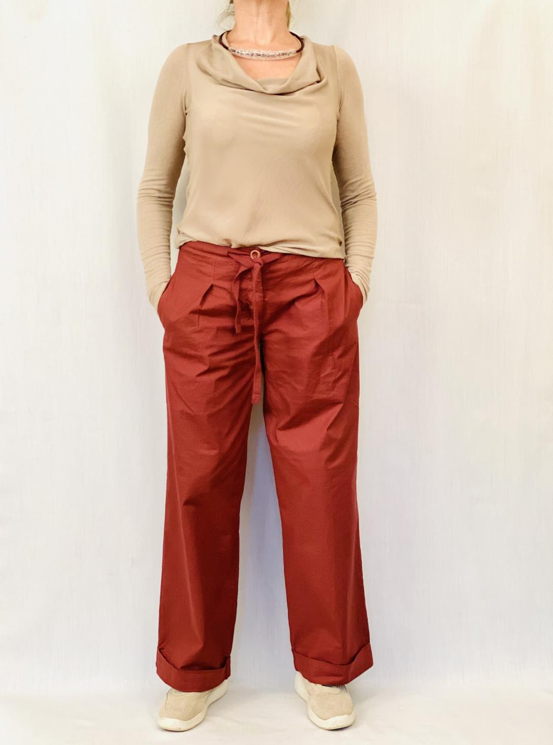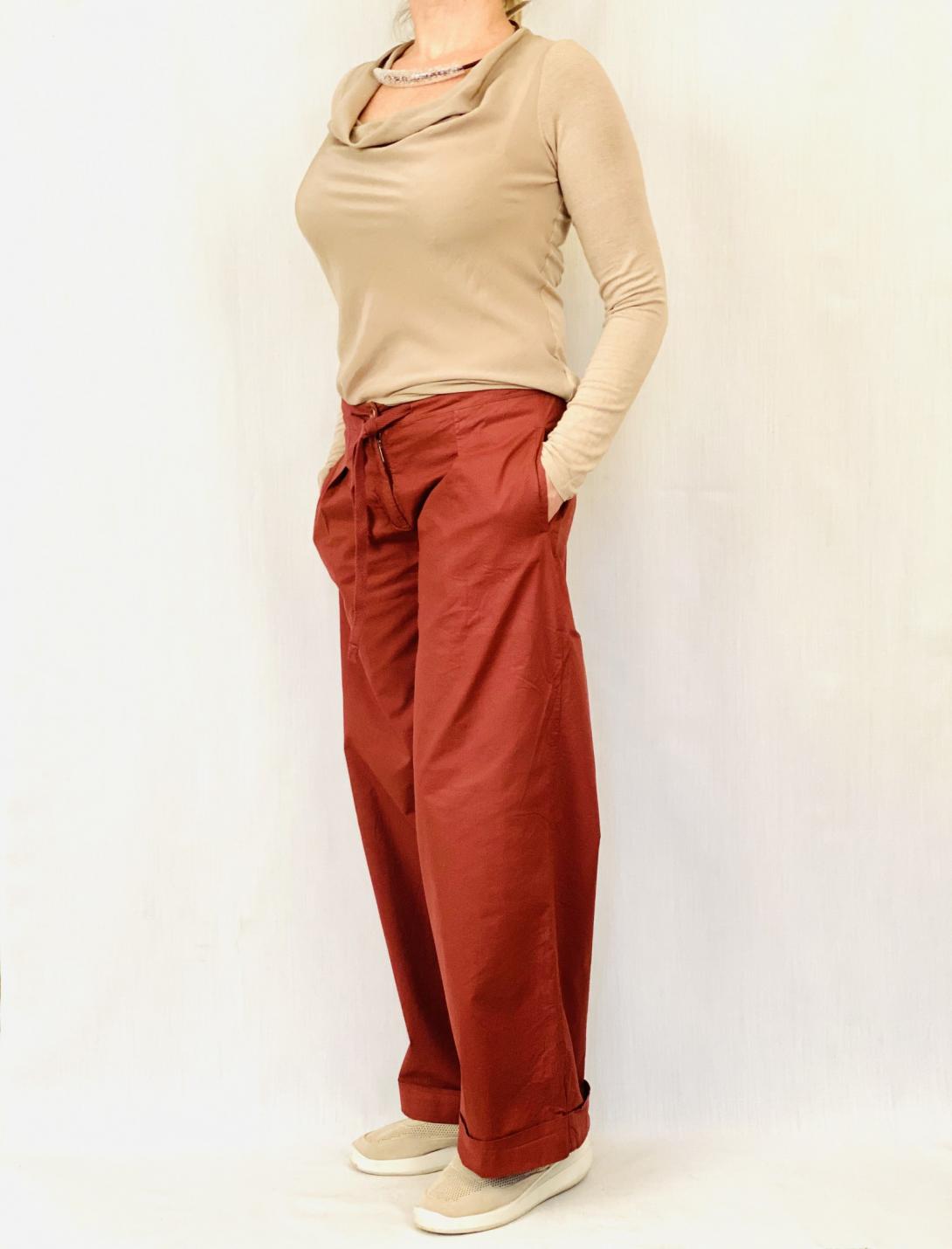 Брюки свободные от бедра,из достаточно плотной ткани. Брюки имеют высокую посадку и плотно облегают бёдра.