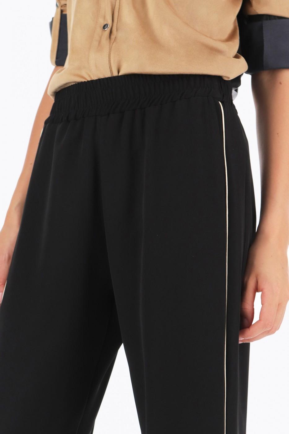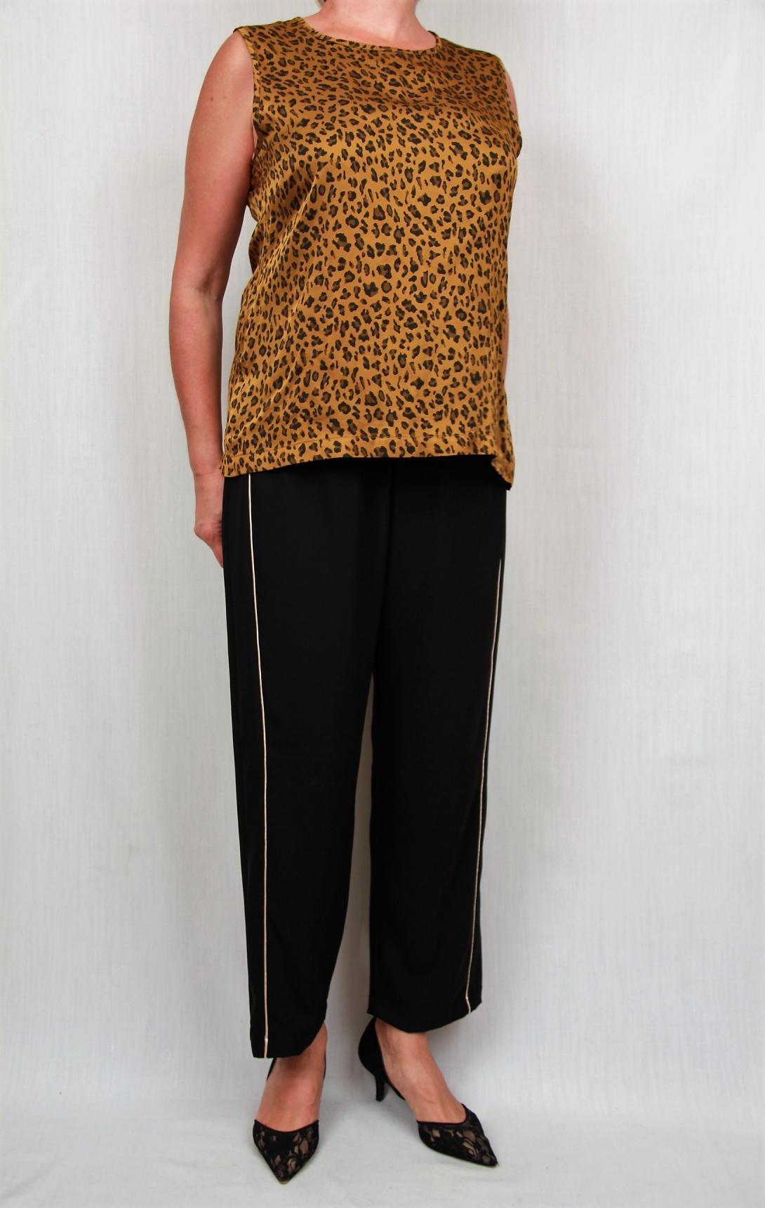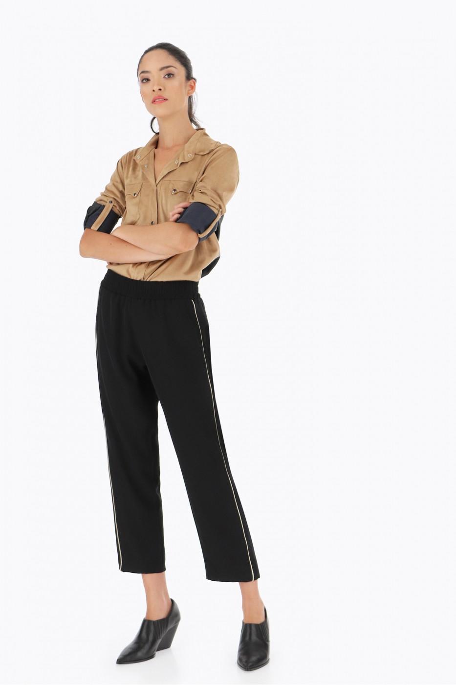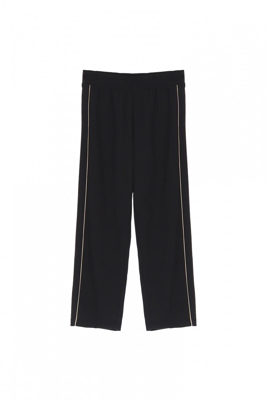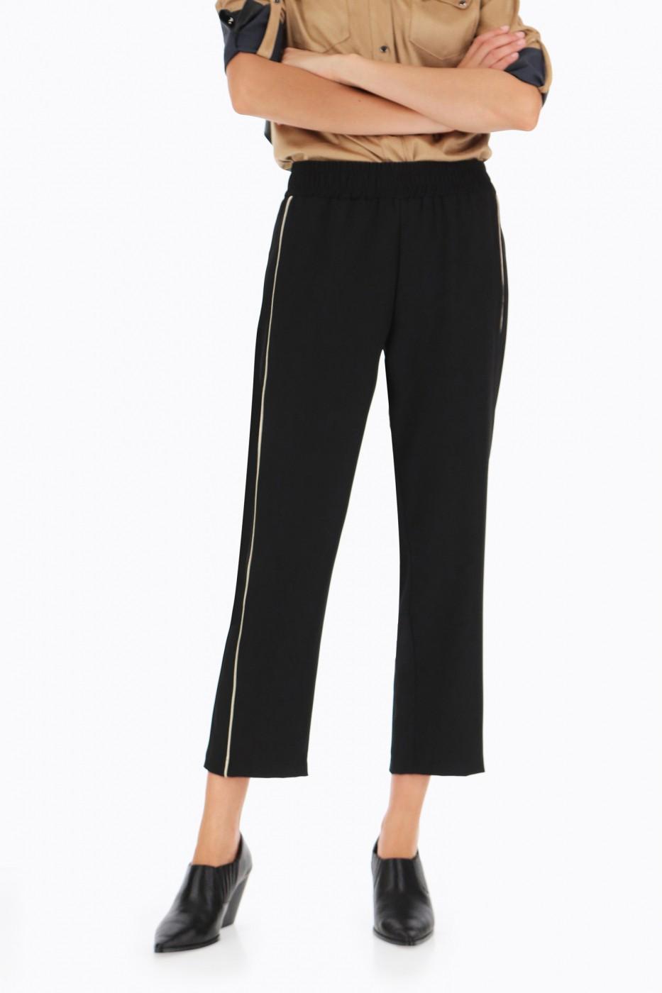 Шикарные слегка укороченные брюки с золотым кантом.Это универсальные брюки ,в которых можно пойти как на торжество.так и на работу. Брюки сидят комфортно, широкие в бёдрах.
