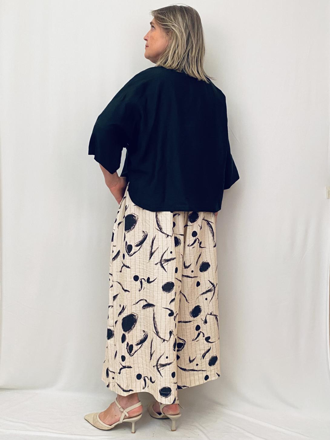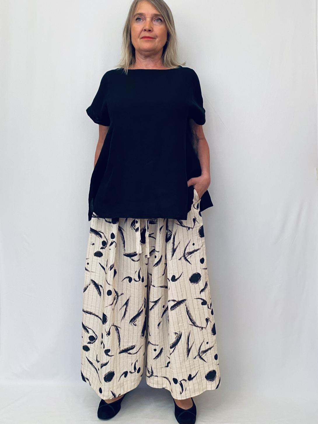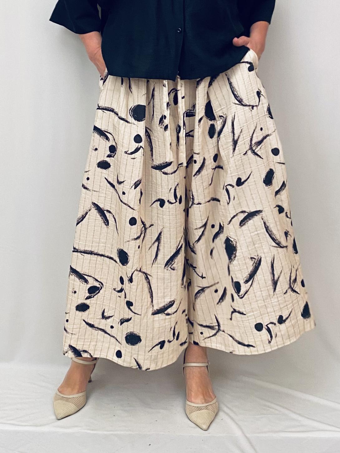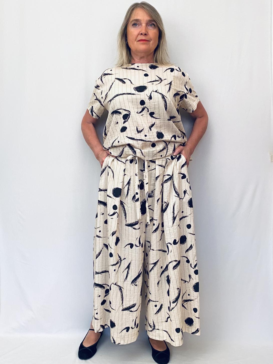 Пояс сзади на резинке, есть матерчатый поясок,карманы.Ширина штанины внизу-45 см. Спереди защипы. Цвет-молочный.