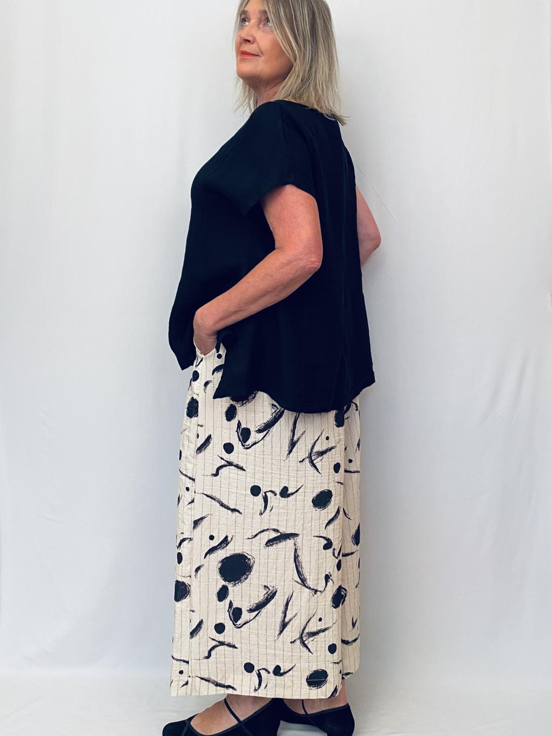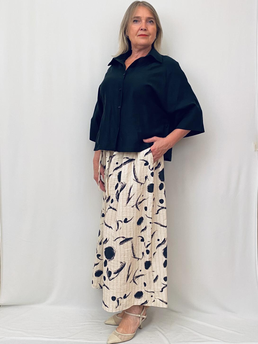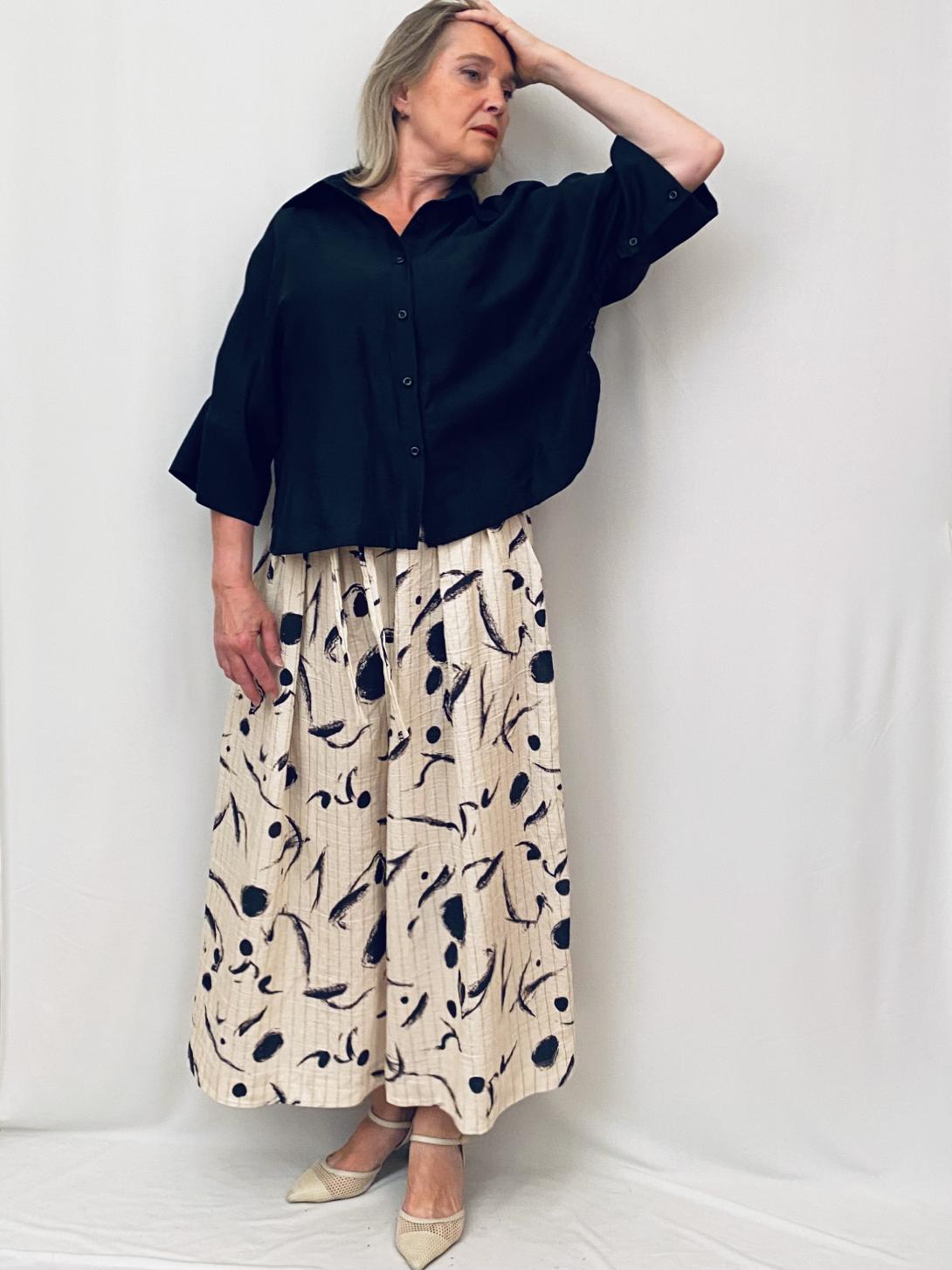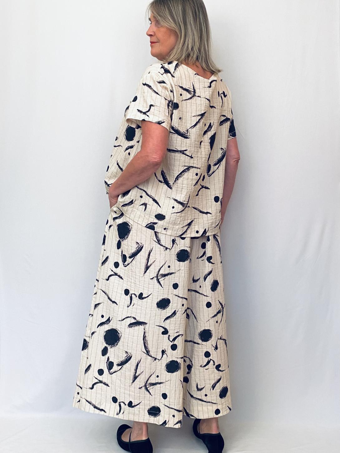 Пояс сзади на резинке, есть матерчатый поясок,карманы.Ширина штанины внизу-45 см. Спереди защипы. Цвет-молочный.