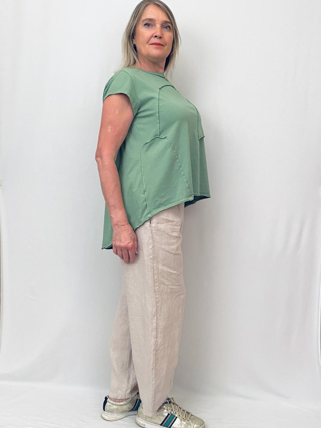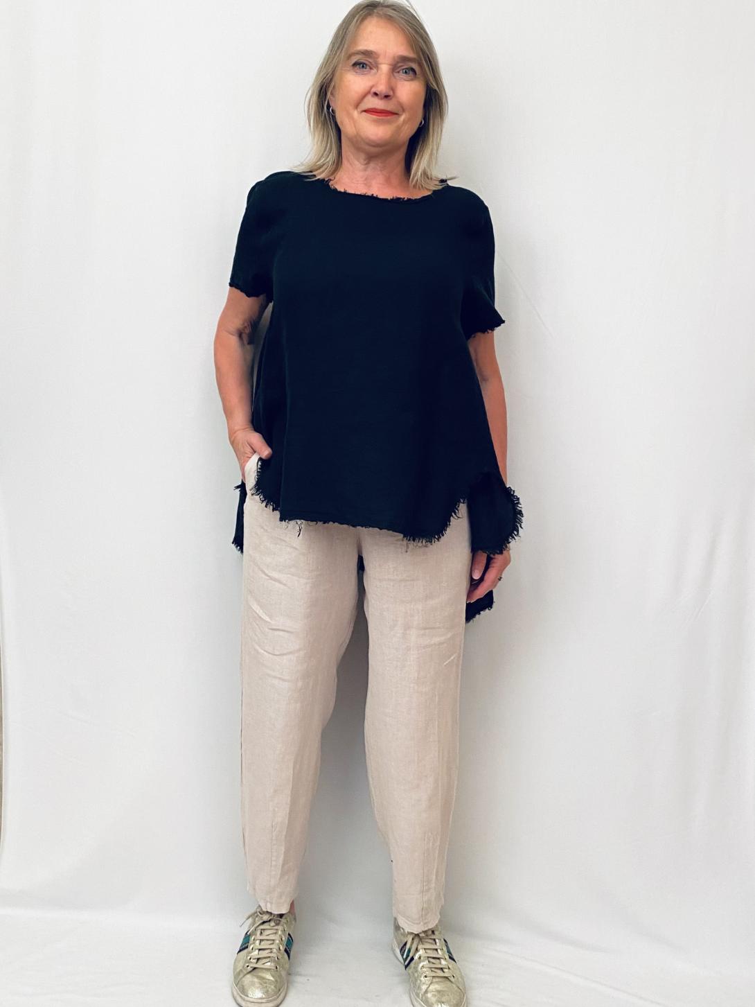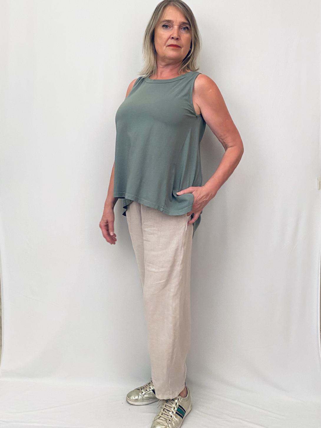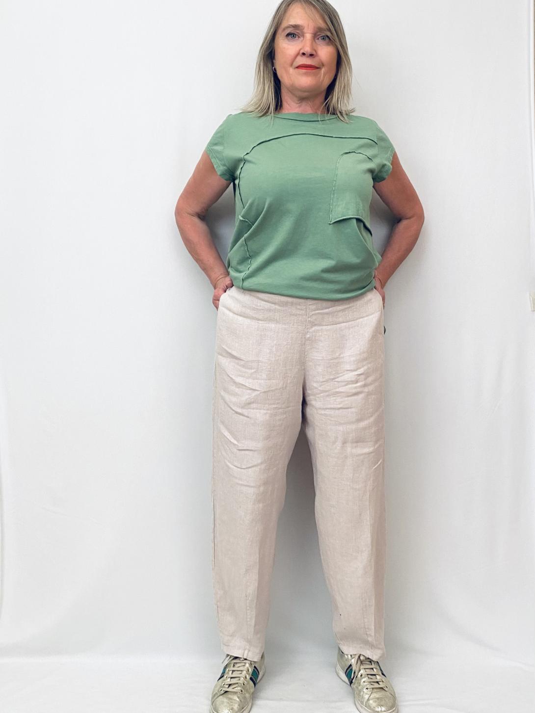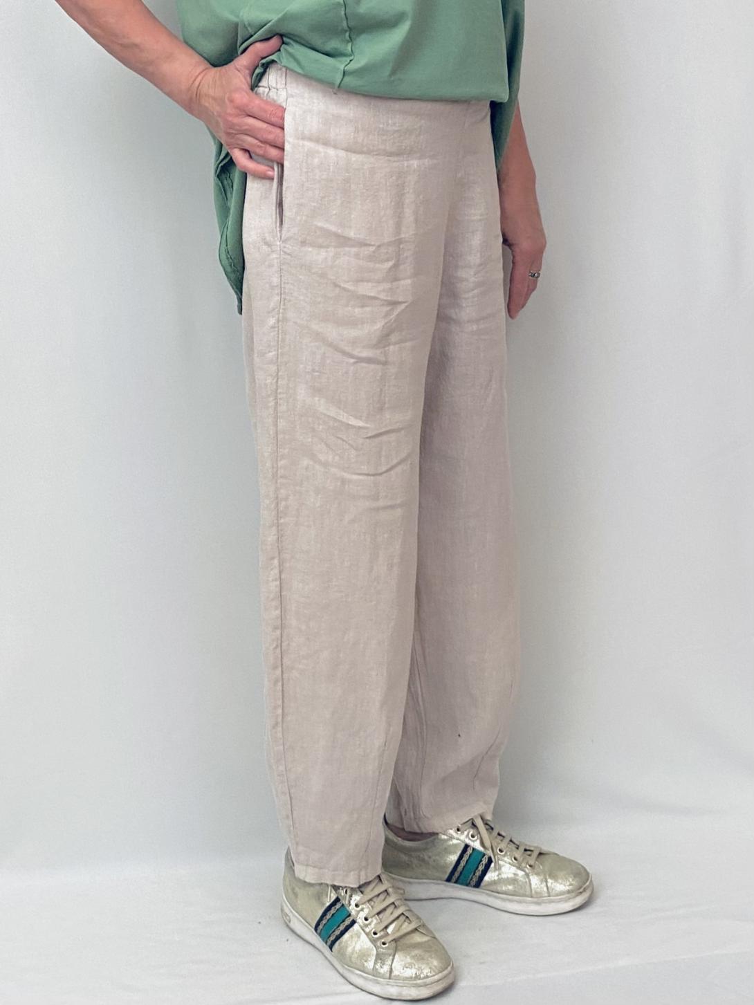Льняные брюки с карманами, пояс на резинке сзади. Полуприлегающий крой.