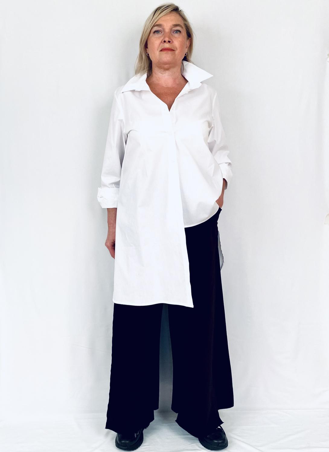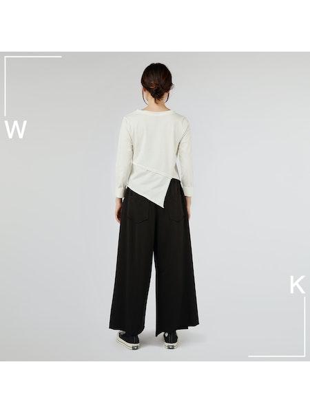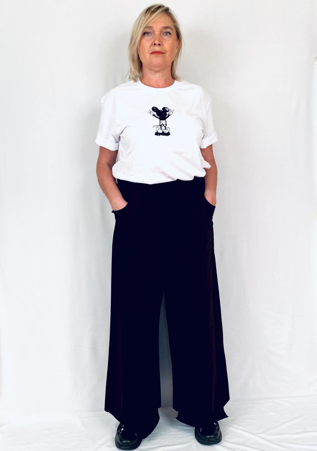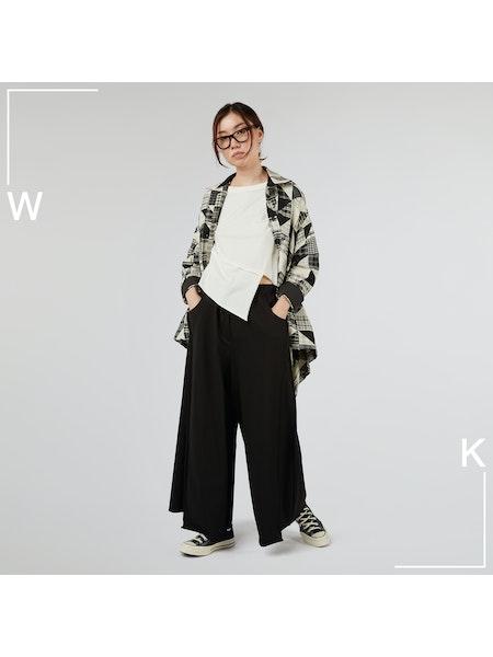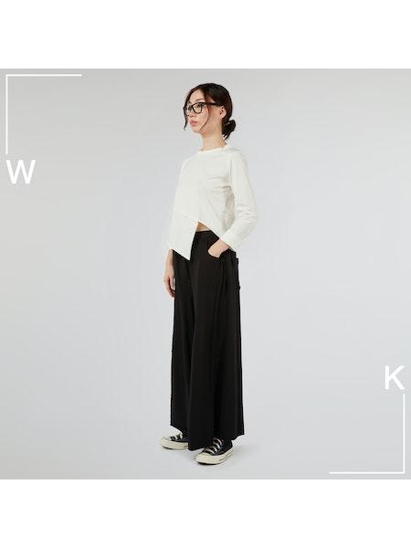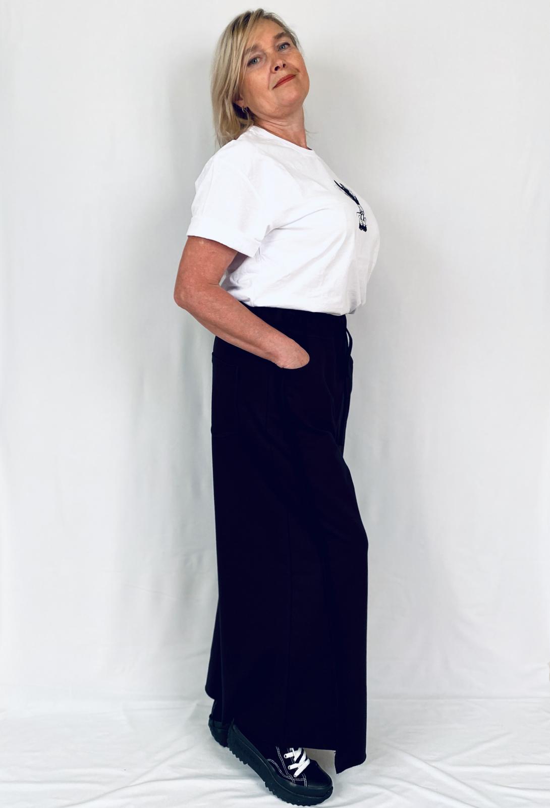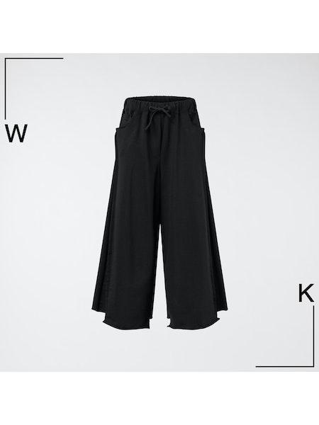 Модные широкие брюки чёрного цвета. Пояс на кулиске, есть карманы, низ брюк разной длины.