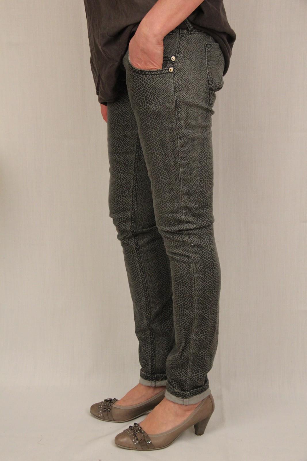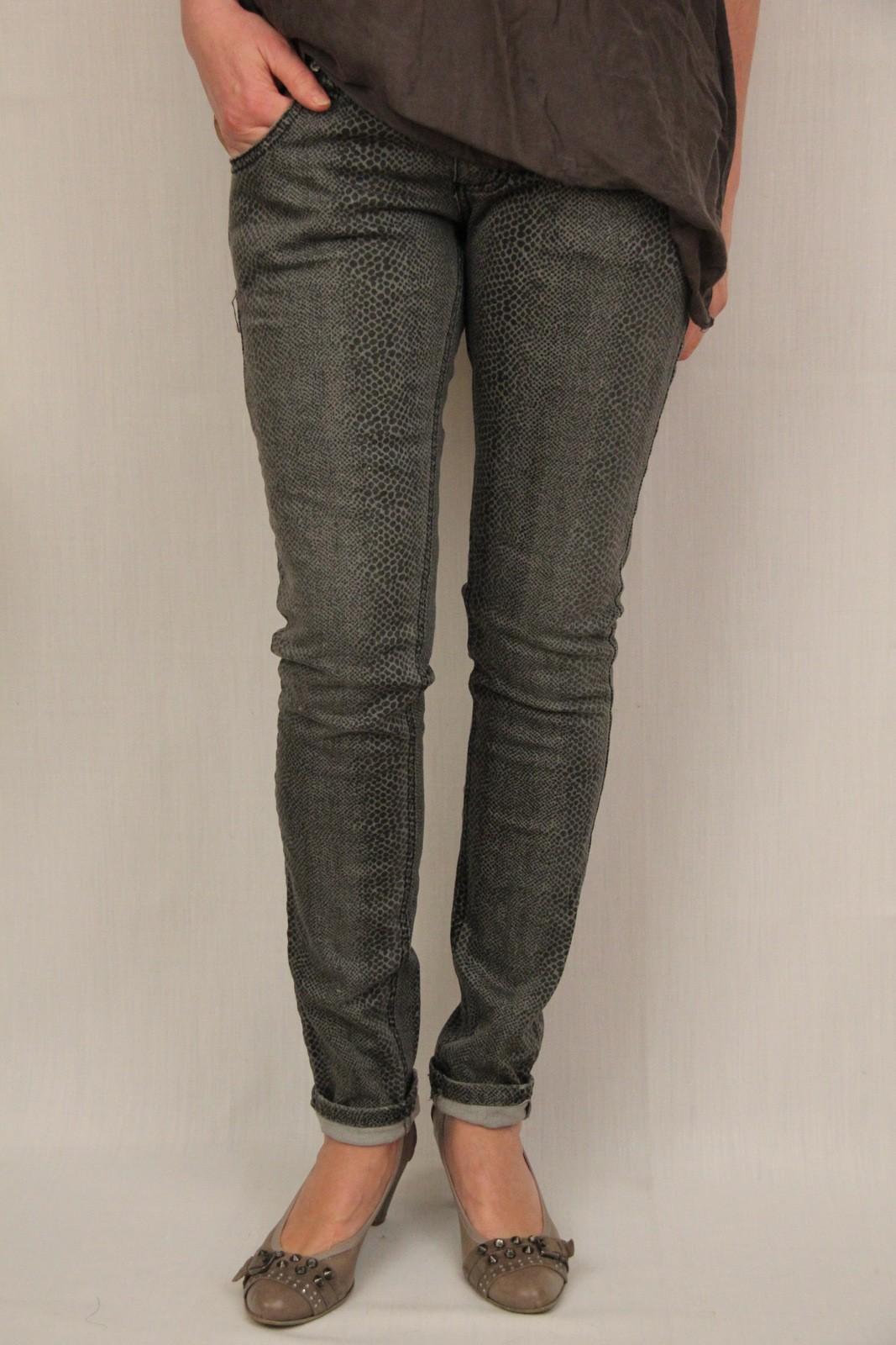 Остро модные в этом сезоне джинсы с принтом животных и пресмыкающихся. Эти брюки с принтом рептилии плотные, низкая посадка, хороший стрейч. Такие брюки комплектуются с чёрной блузкой, жакетом, кардиганом или модным объемным свитером контрастного цвета.