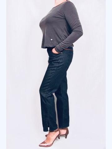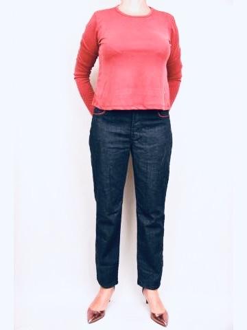 Джинсы имеют удобную среднюю посадку.Тёмно синие спокойные джинсы c отделкой по карману красным кантом, модель брюк прямая, внизу разрез.Новая коллекция от бренда Please.