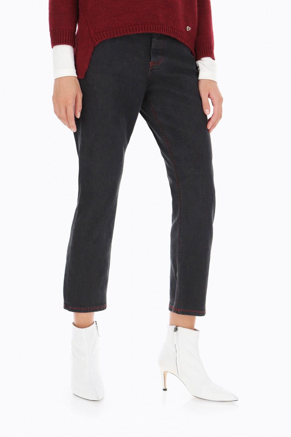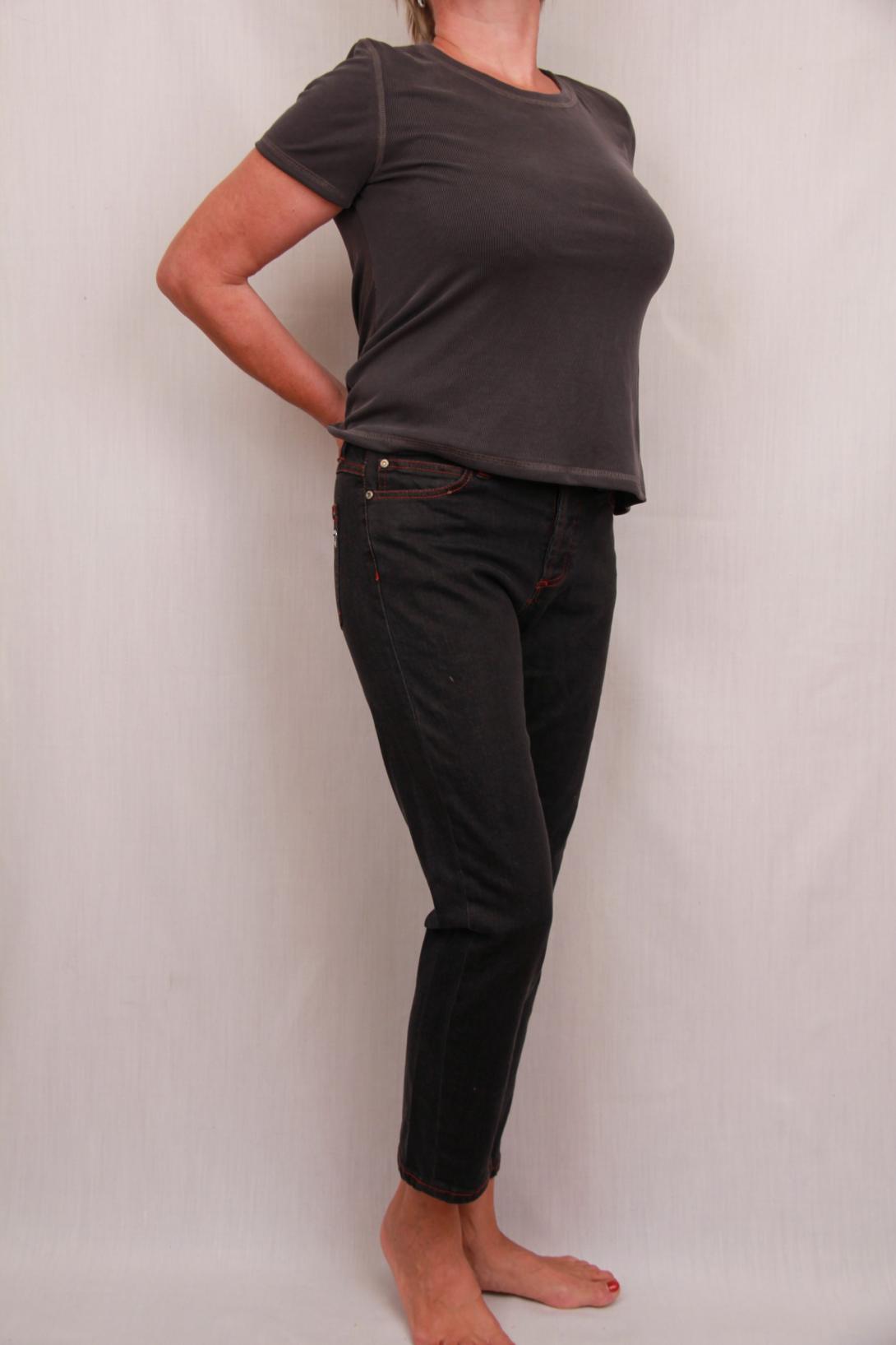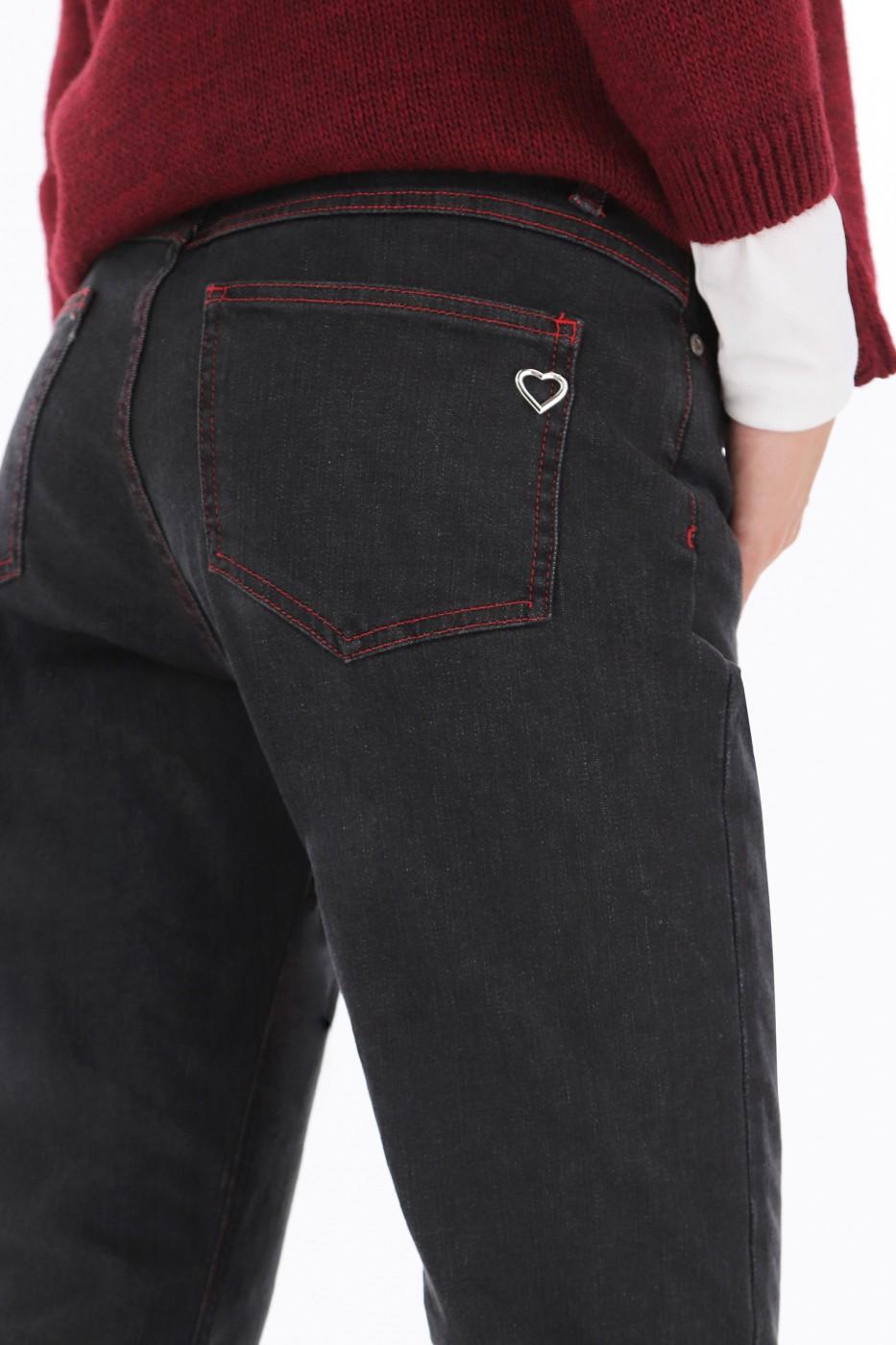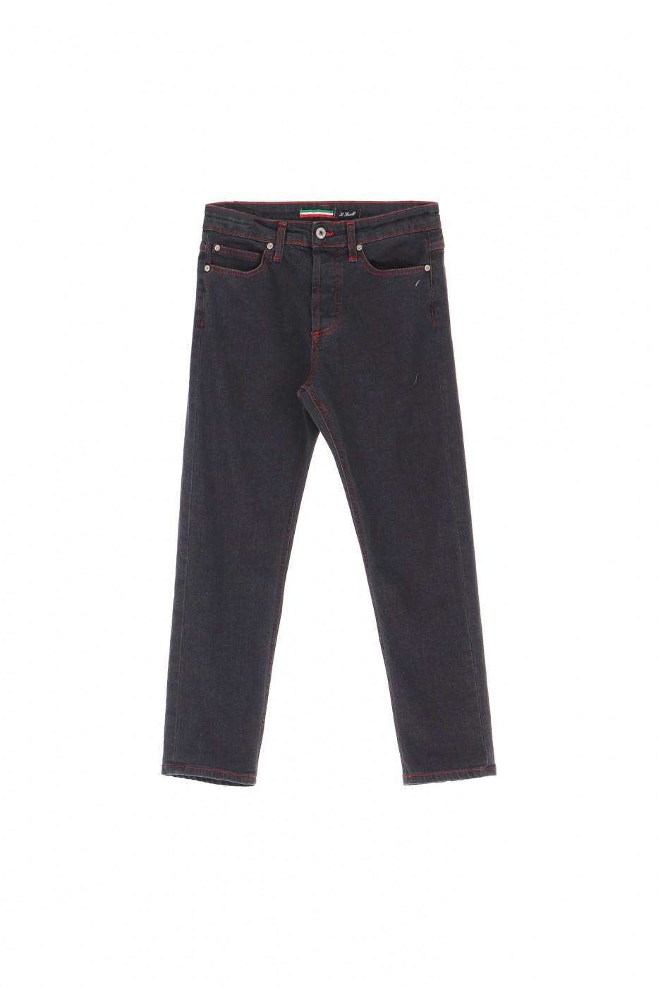 Черные плотные джинсы,швы отстрочены жёлтой нитью.