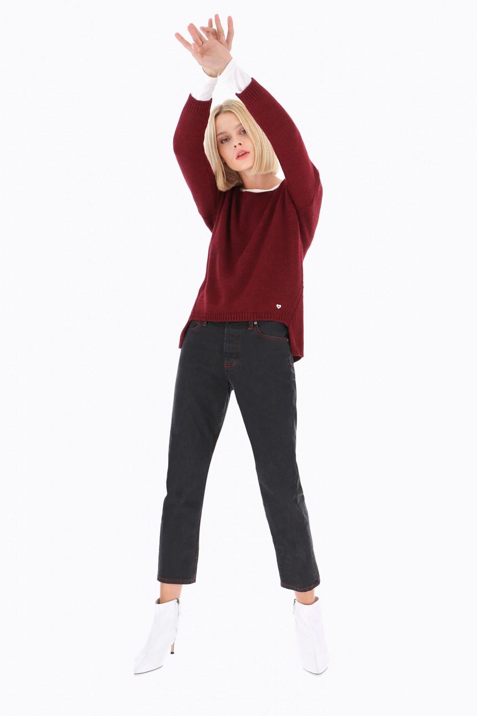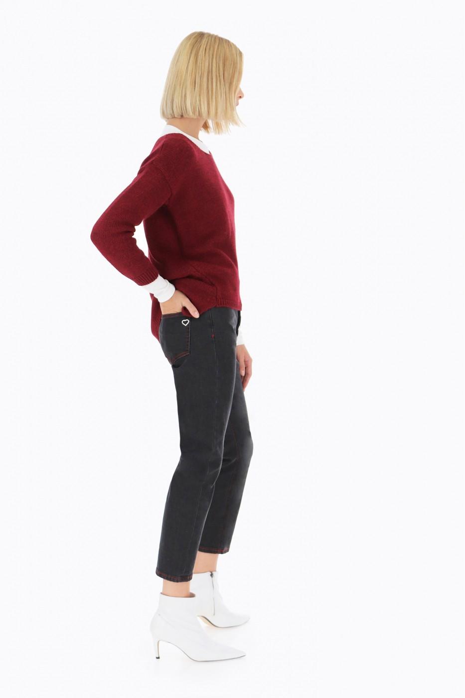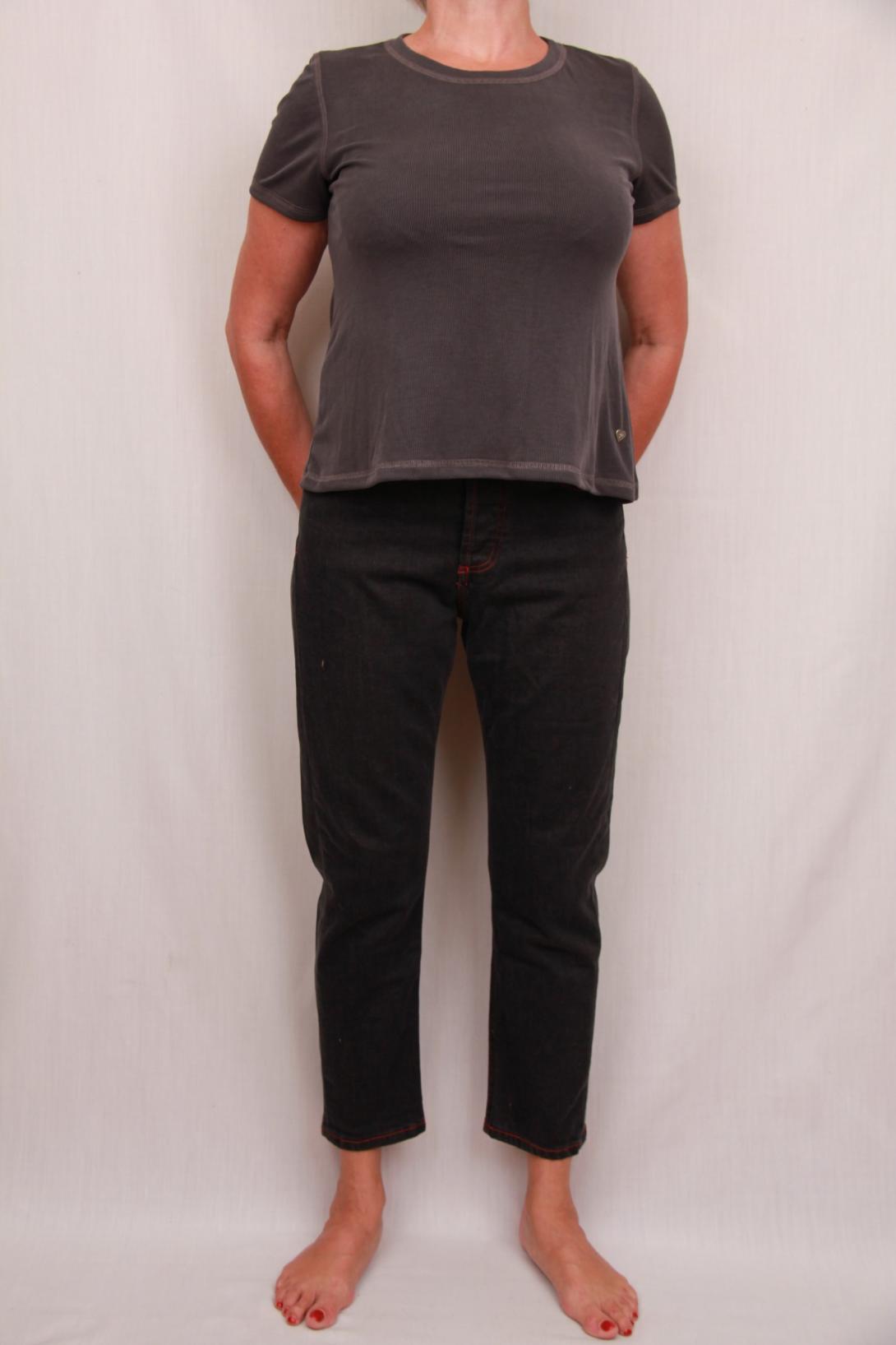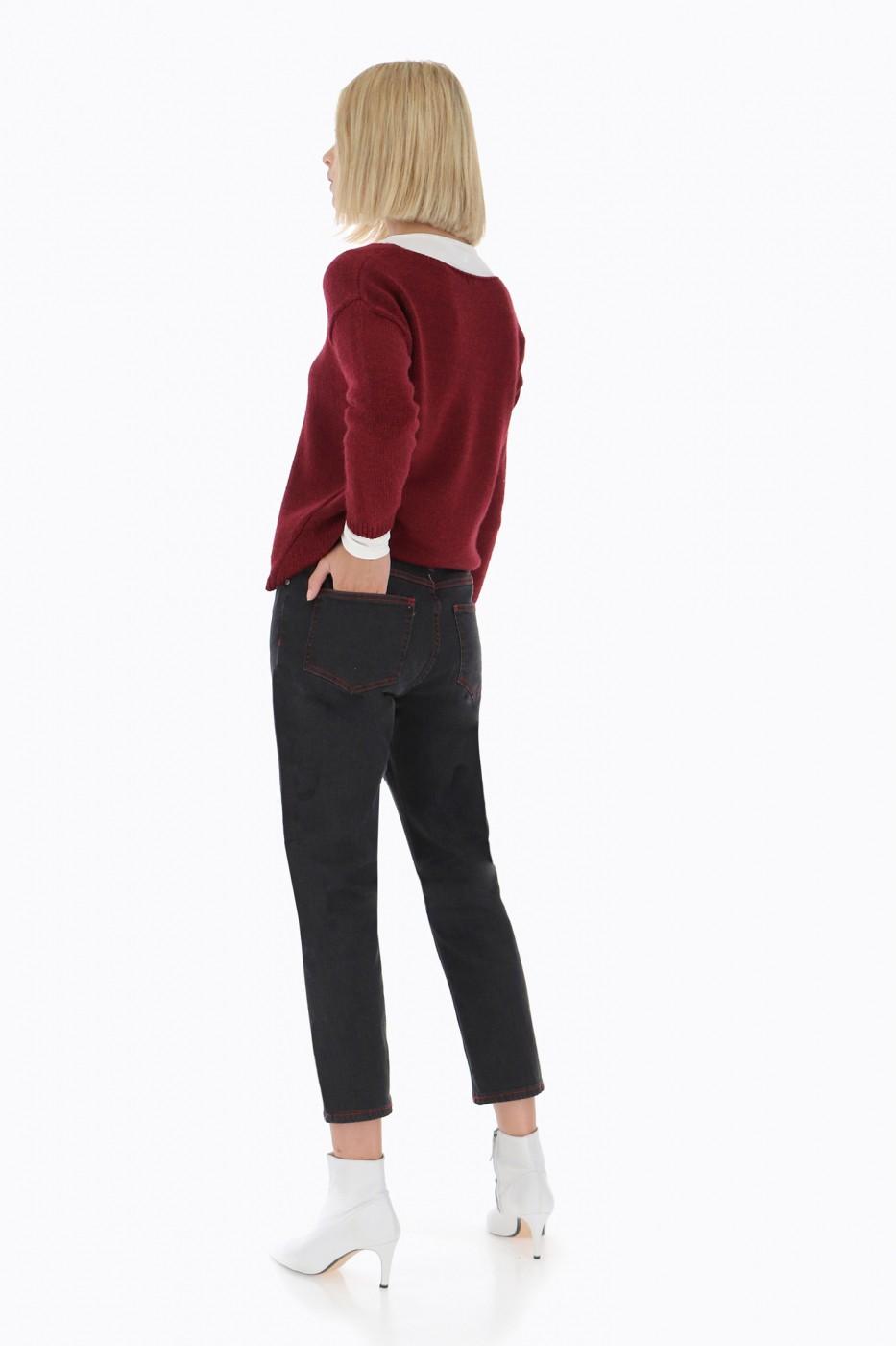 Черные плотные джинсы,швы отстрочены жёлтой нитью.