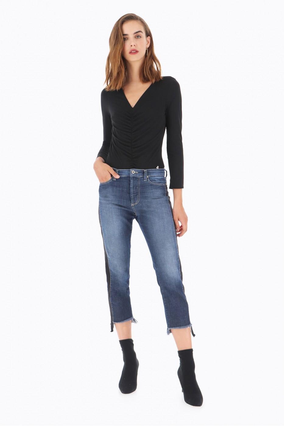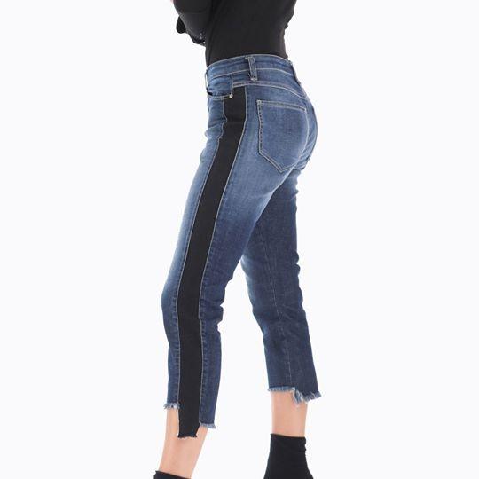 Отличные джинсы тёмной варки с чёрным лампасом очень актуальным в этом сезоне. Джинсы укороченные и слегка драненькие по низу .
