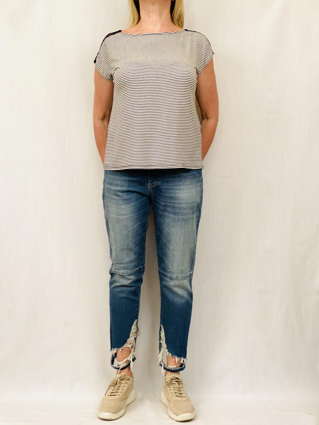 Трикотаж в мелкую полоску и гипюровой отделкой на спине.