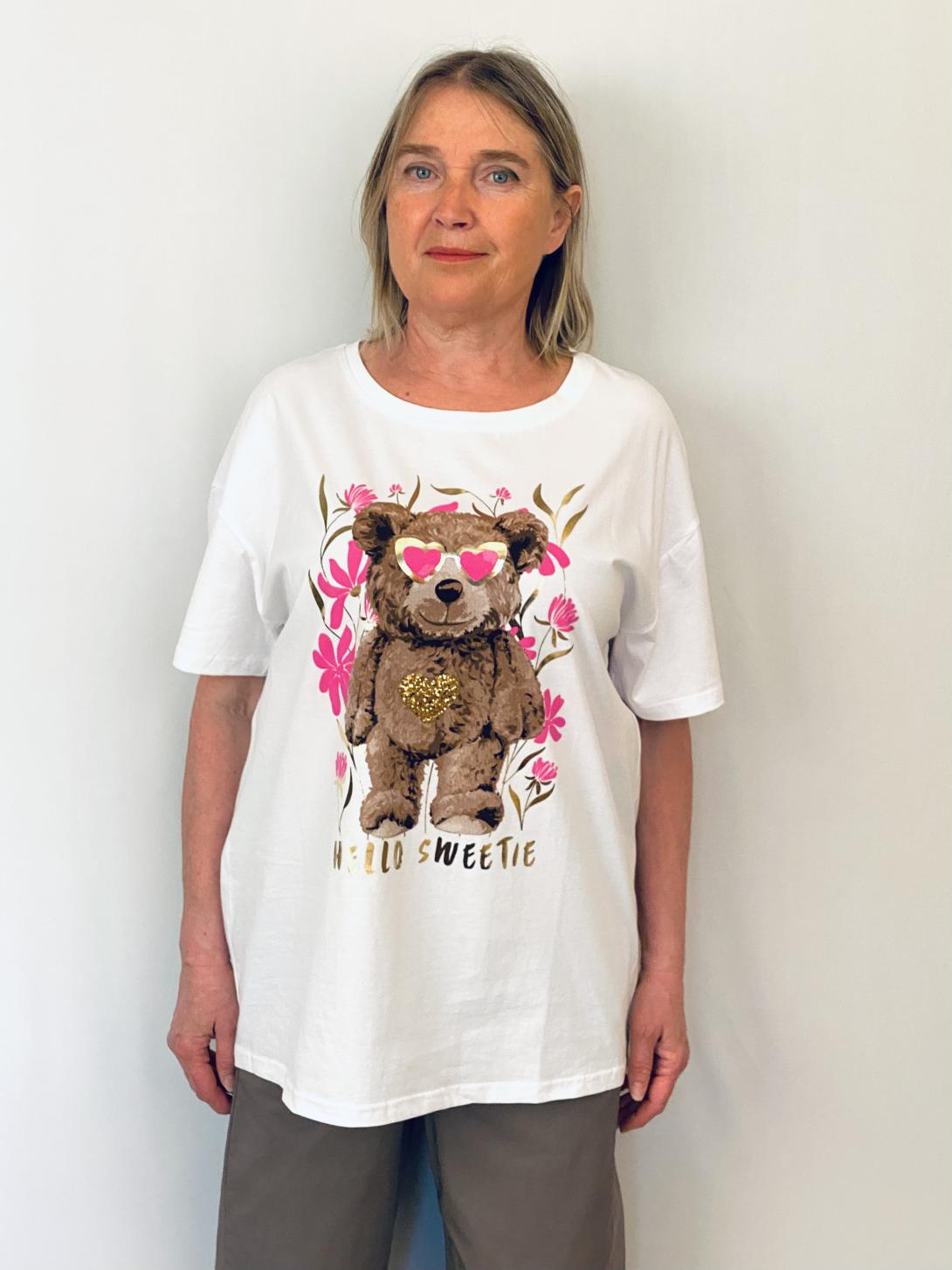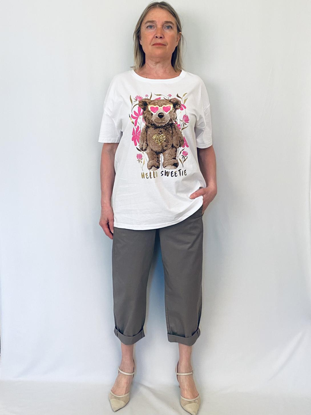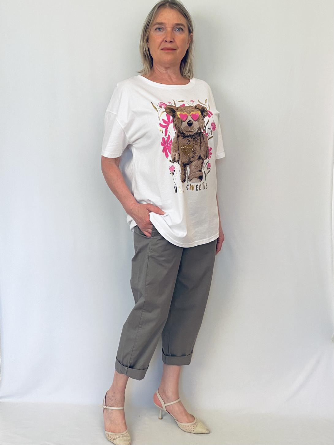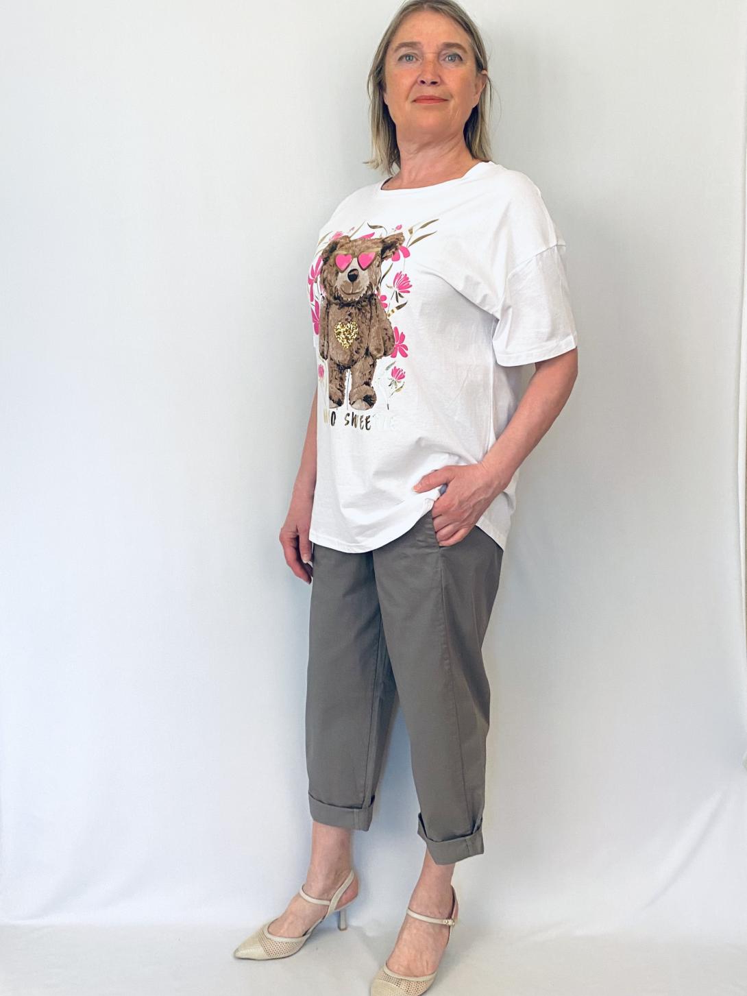 Особенностью этой модели является ее принт "мишка" в стиле "оверсайз", который выглядит очень оригинально и привлекает внимание окружающих. Футболка представлена с принтом нескольких цветах: коричневом и розовом. Это позволяет выбрать наиболее подходящий вариант для вашего образа.
