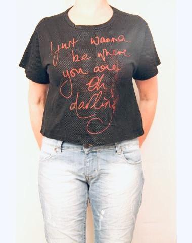 Укороченная футболка тёмно-серого цвета в мелкий горошек. Прекрасно комплектуется с итальянскими джинсами бренд Please с высокой посадкой.