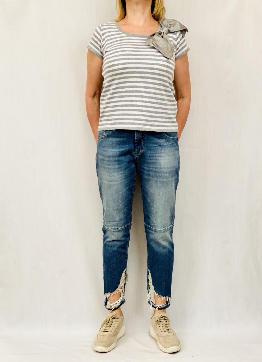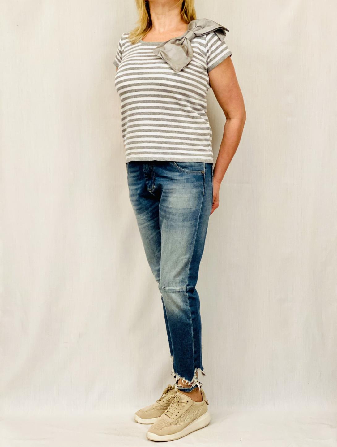 Итальянский трикотаж с морской тематикой. Эта модель напоминает классическую футболку с коротким рукавом, но очень нарядную благодаря банту.