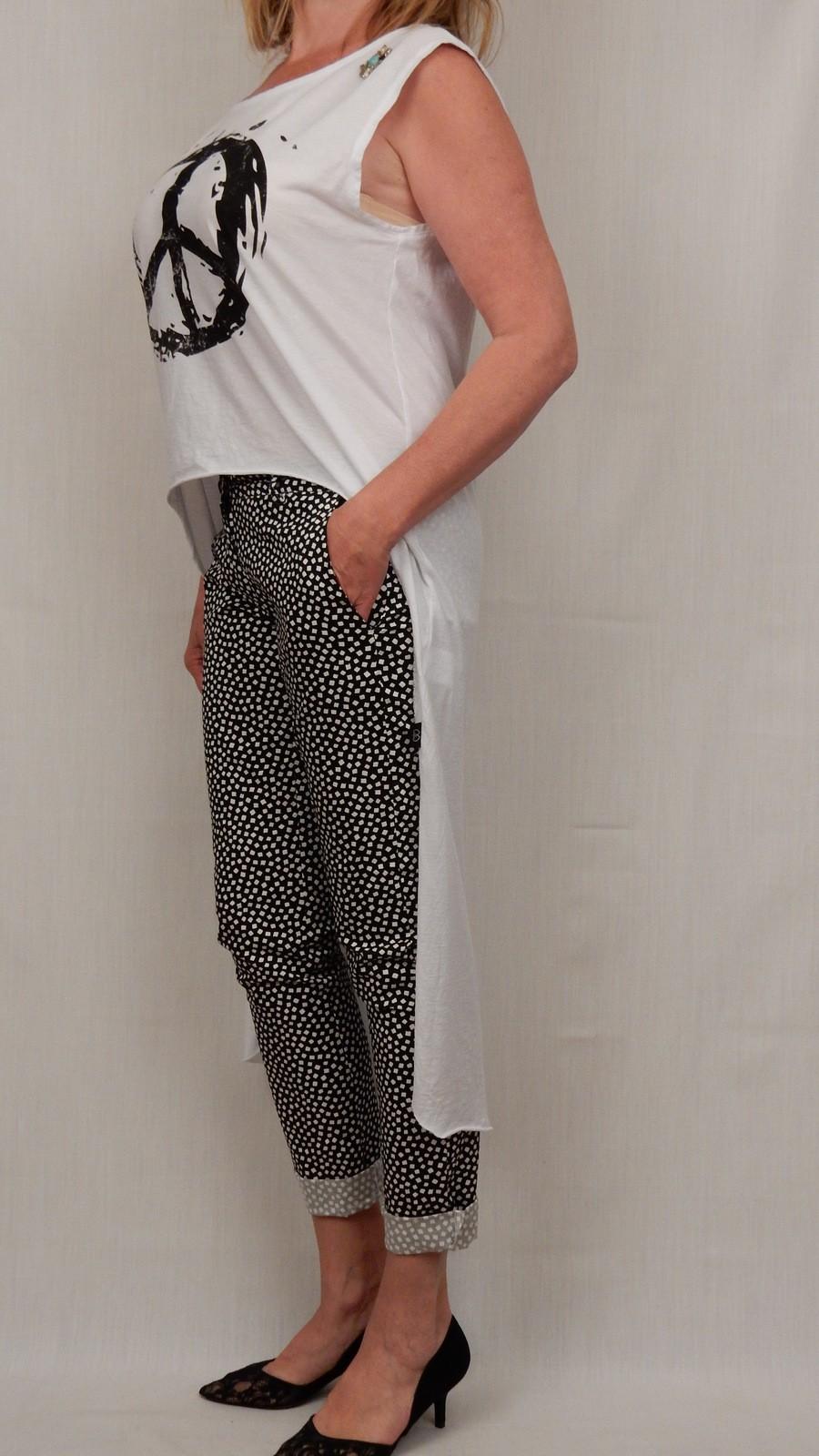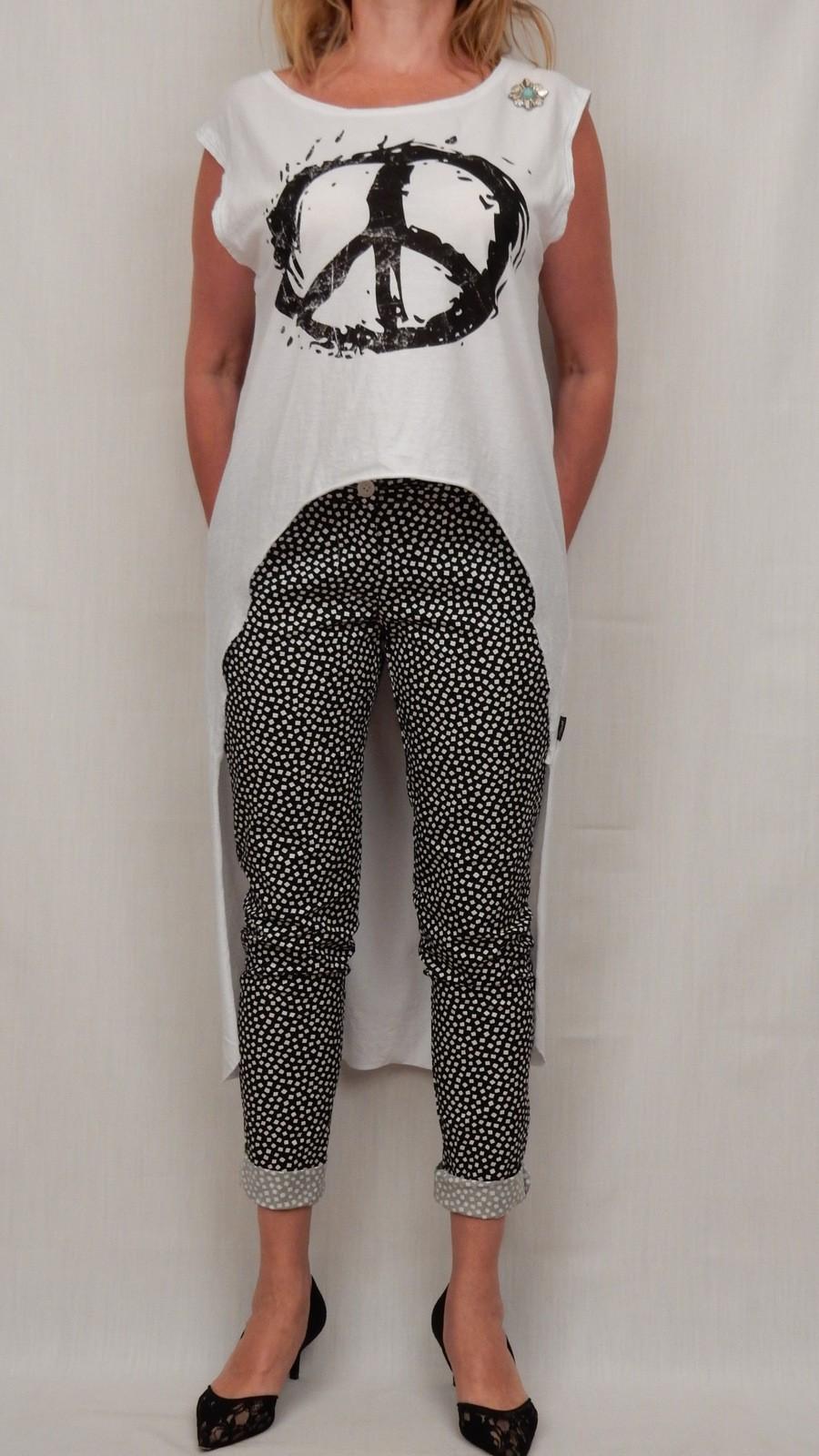 Модная белая футболка с чёрным принтом и разнополой длинной. Одежда креативная и остро модная одновременно.