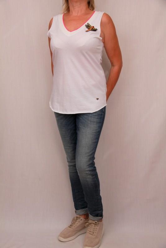 Безрукавная белая футболка +брошь СТРЕКОЗА