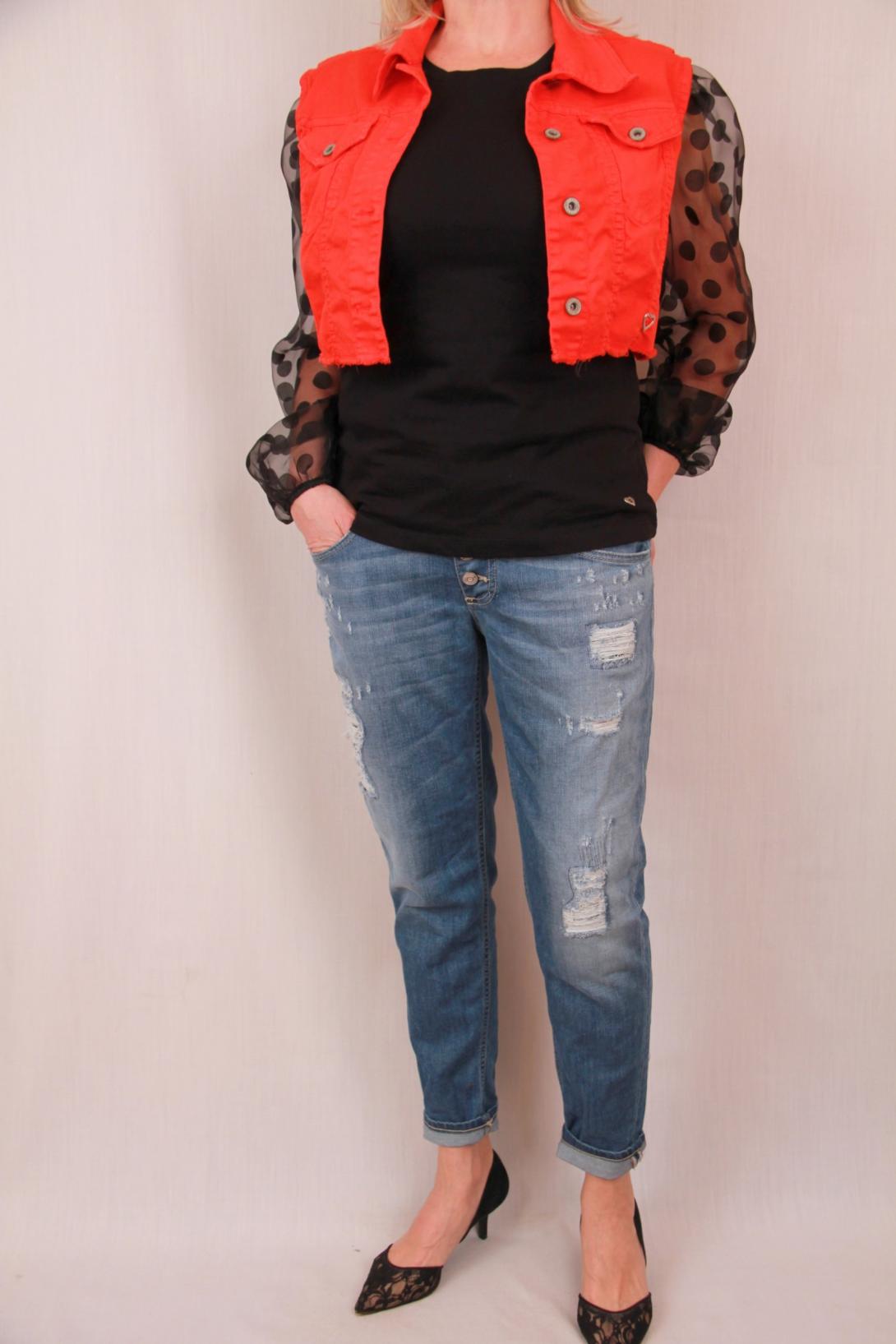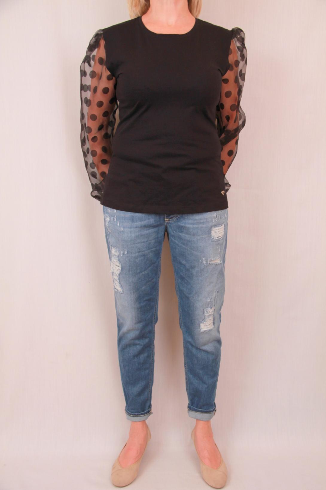 Красивая футболка с эффектным рукавом в прозрачный горох. Это нарядная вещь комплектуется и с джинсами бойфренд, и с классической юбкой. Рукав из прозрачной органзы.