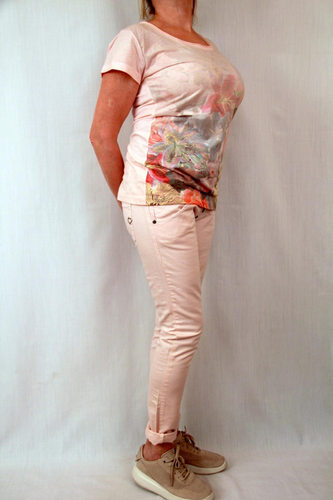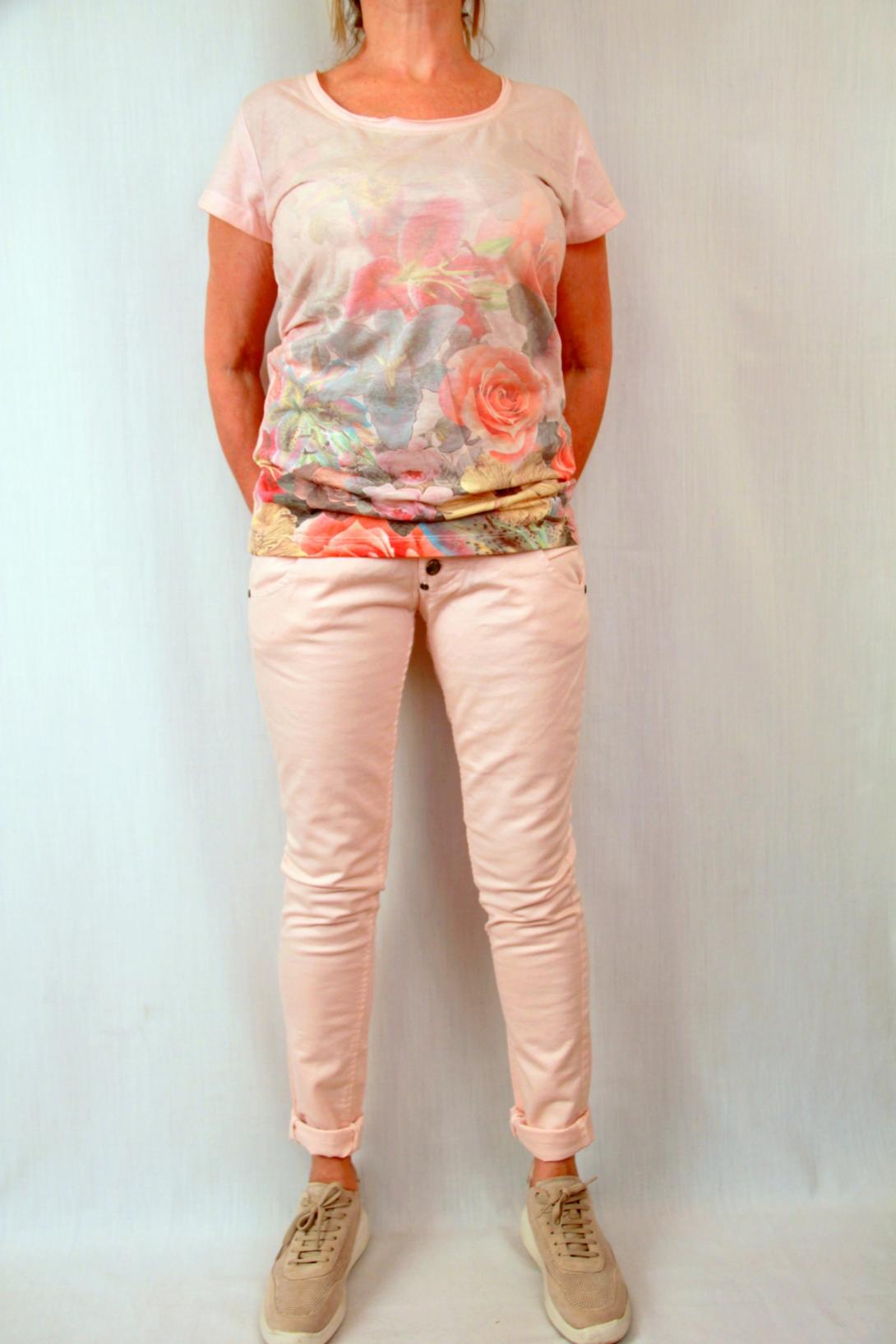Бледно-розовая футболка с цветочным принтом. Футболка с коротким рукавом,приталенная.