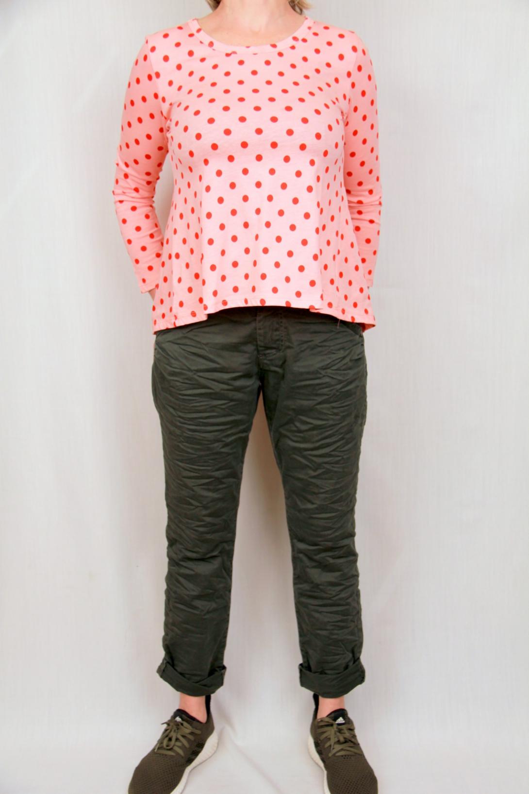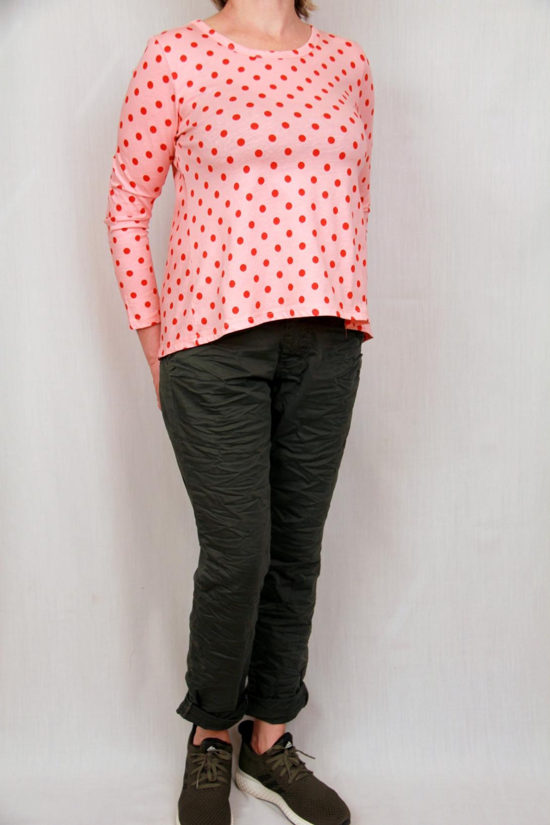 Футболка с длинным рукавом цвета пастилы в красный горох. Футболка производство Италия бренд WENDY TRENDY Вся одежда этого бренда прекрасного качества. В магазине есть в продаже красная футболка в белый, более крупный, горох.