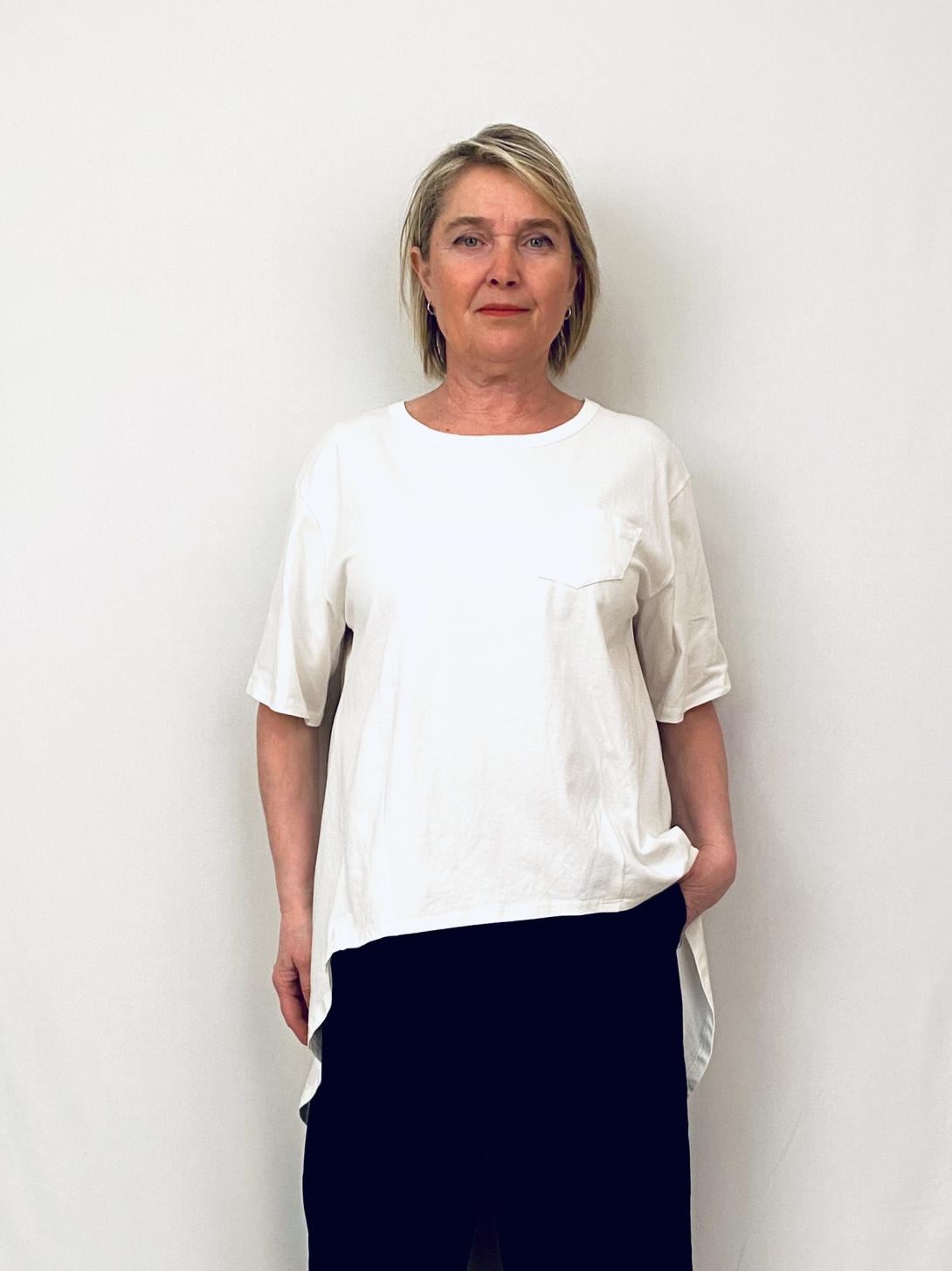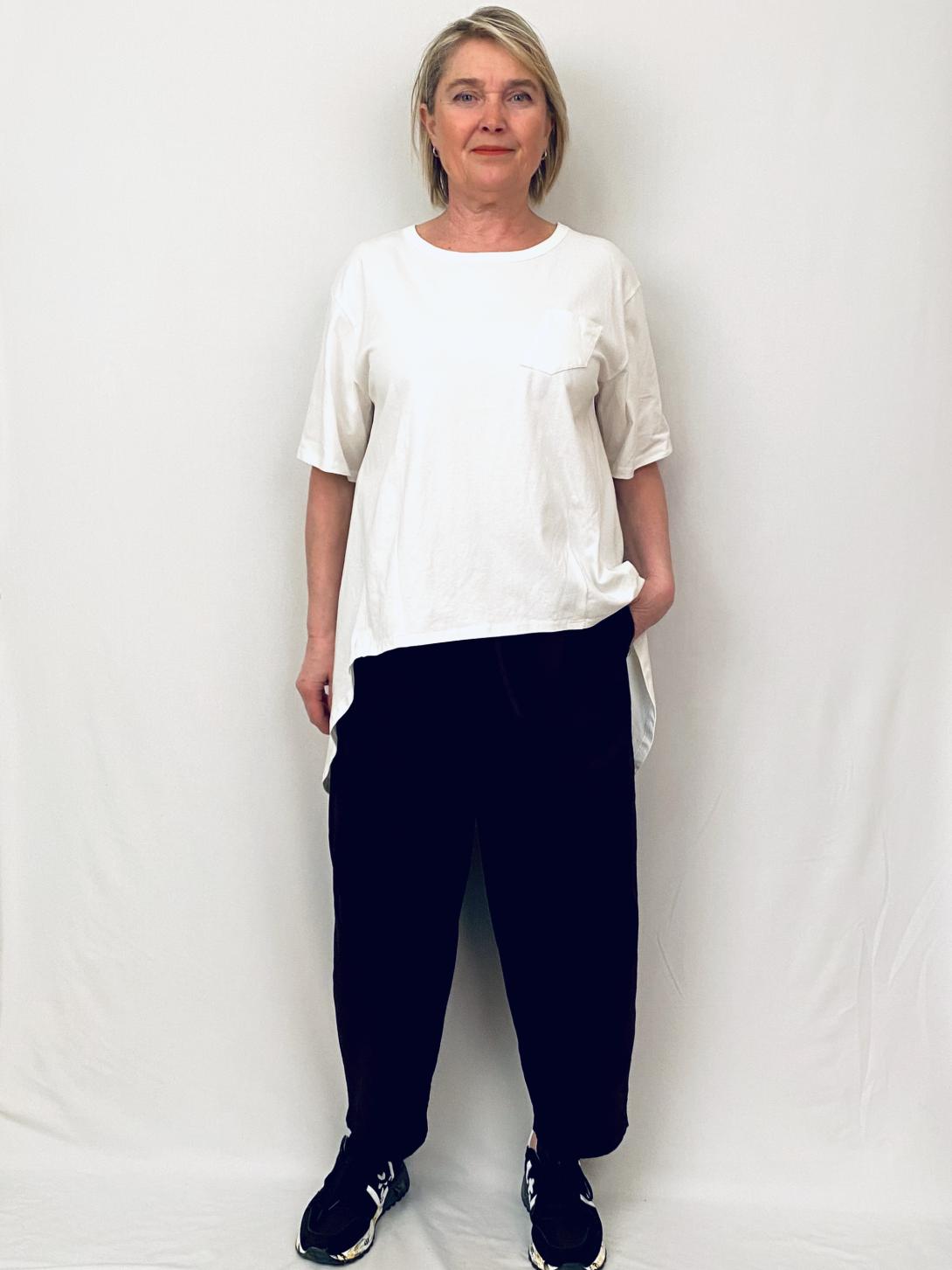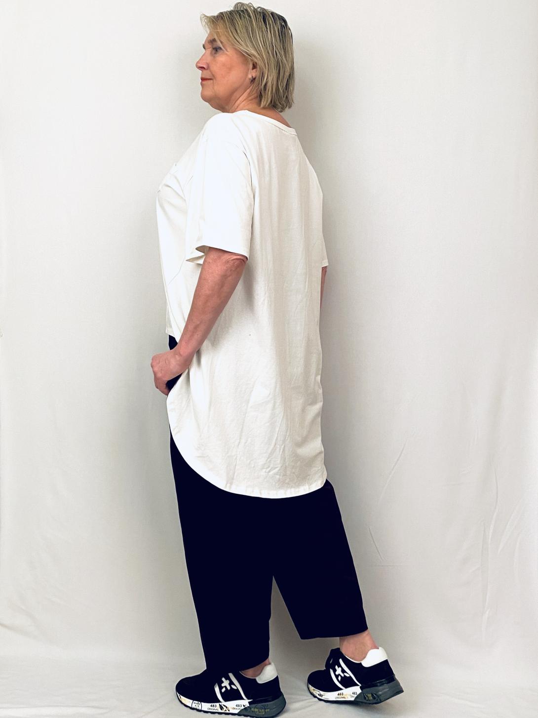 Асимметричный дизайн футболки придает ей оригинальность и неповторимость. Вырез лодочка подчеркивает линию шеи и делает образ более женственным и элегантным.