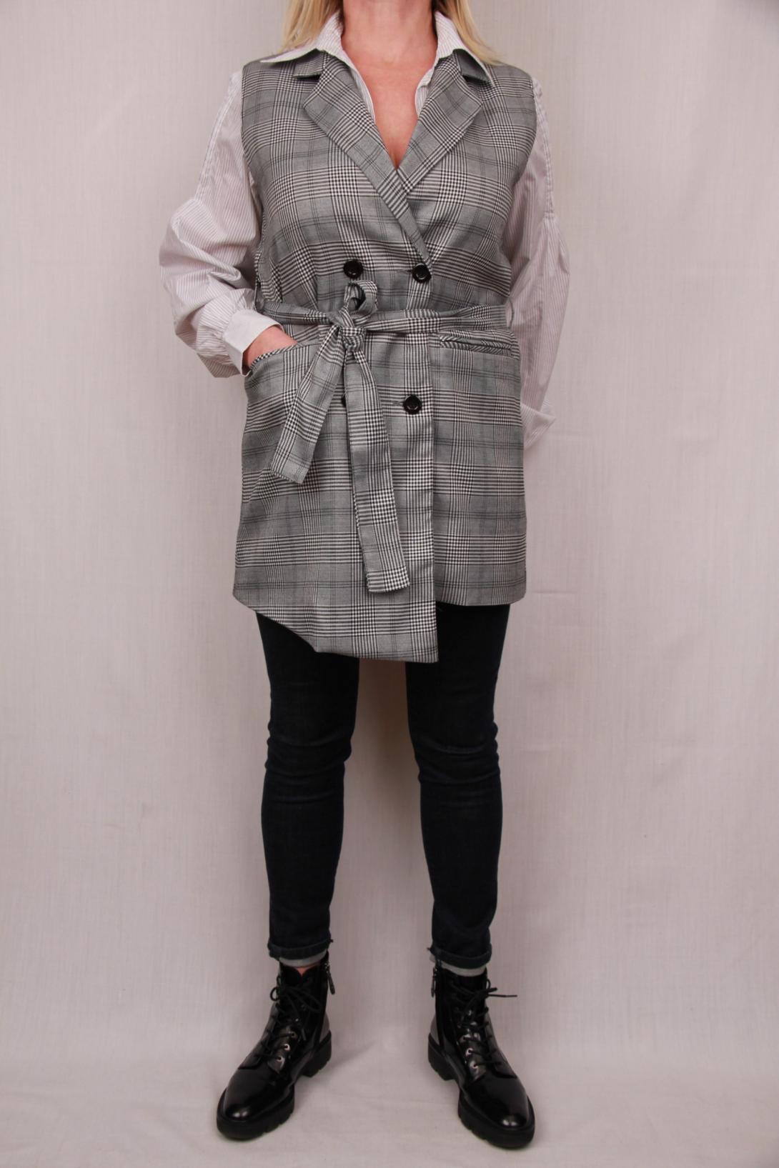 Безрукавный жакет на подкладке комплектуется с белой или чёрной блузкой.Ассиметричный крой по низу подчеркнёт Вашу индивидуальность. Такой комплект одежды подойдёт и для работы в офисе.