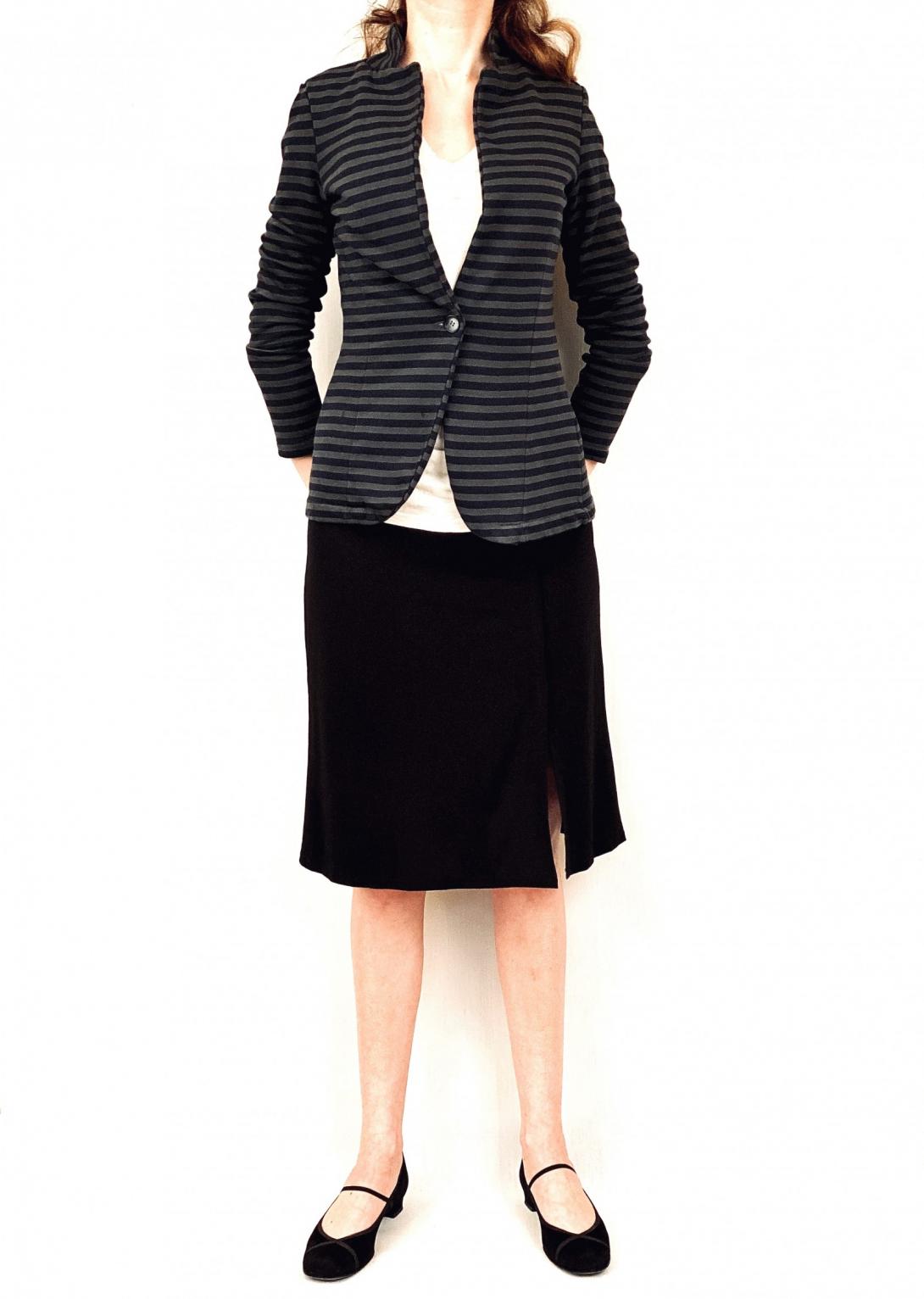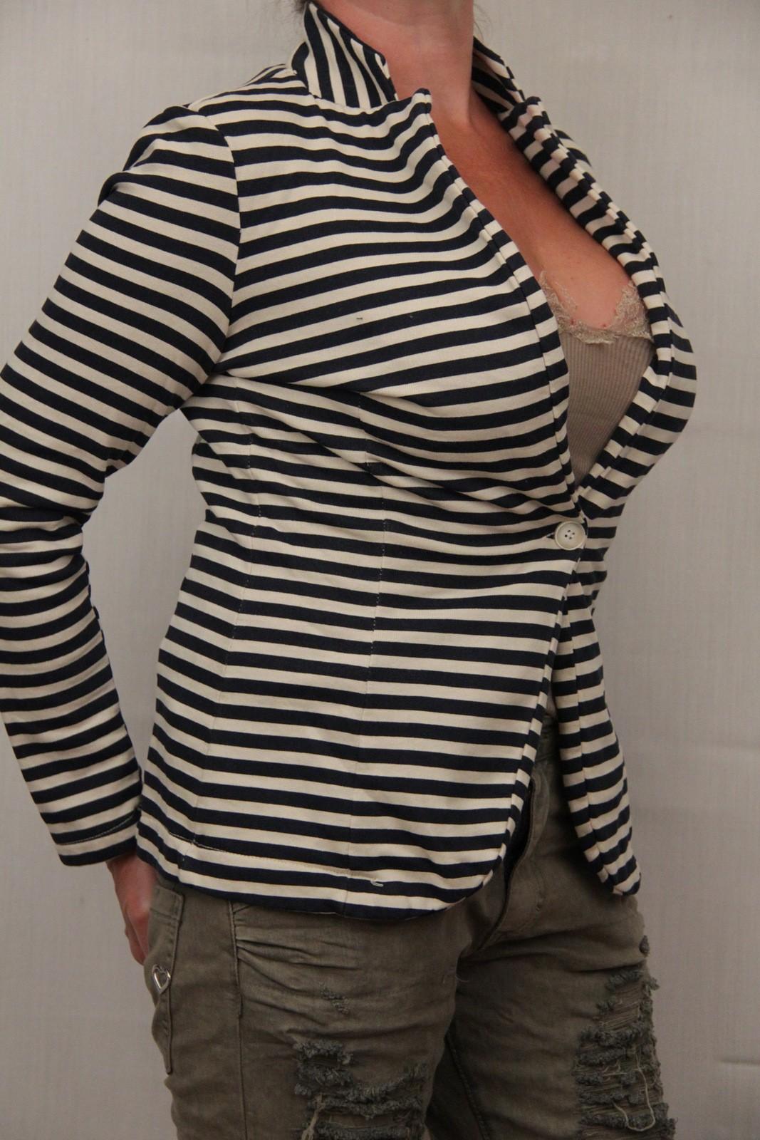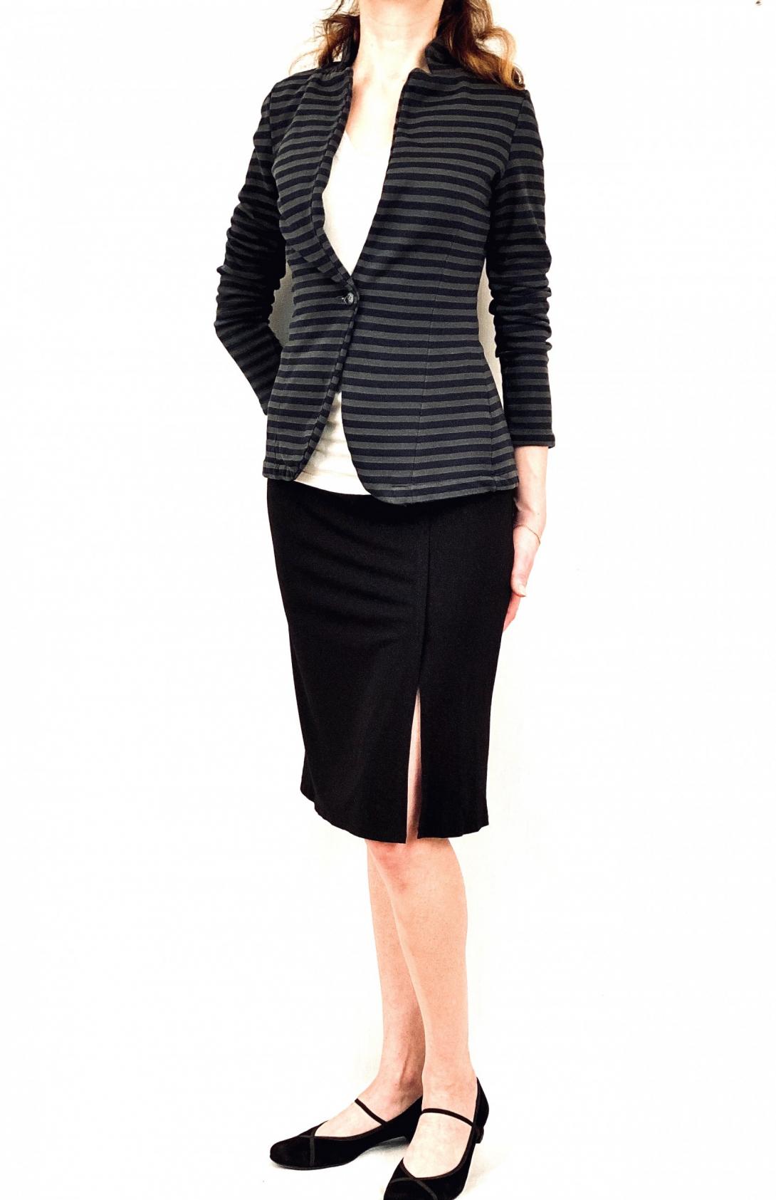 Стильный трикотажный жакет . В наличие остался только маленький размер.Цвета-темная серая полоска на сером фоне.