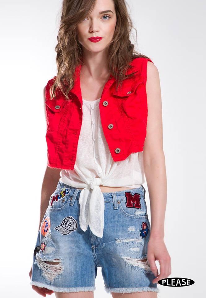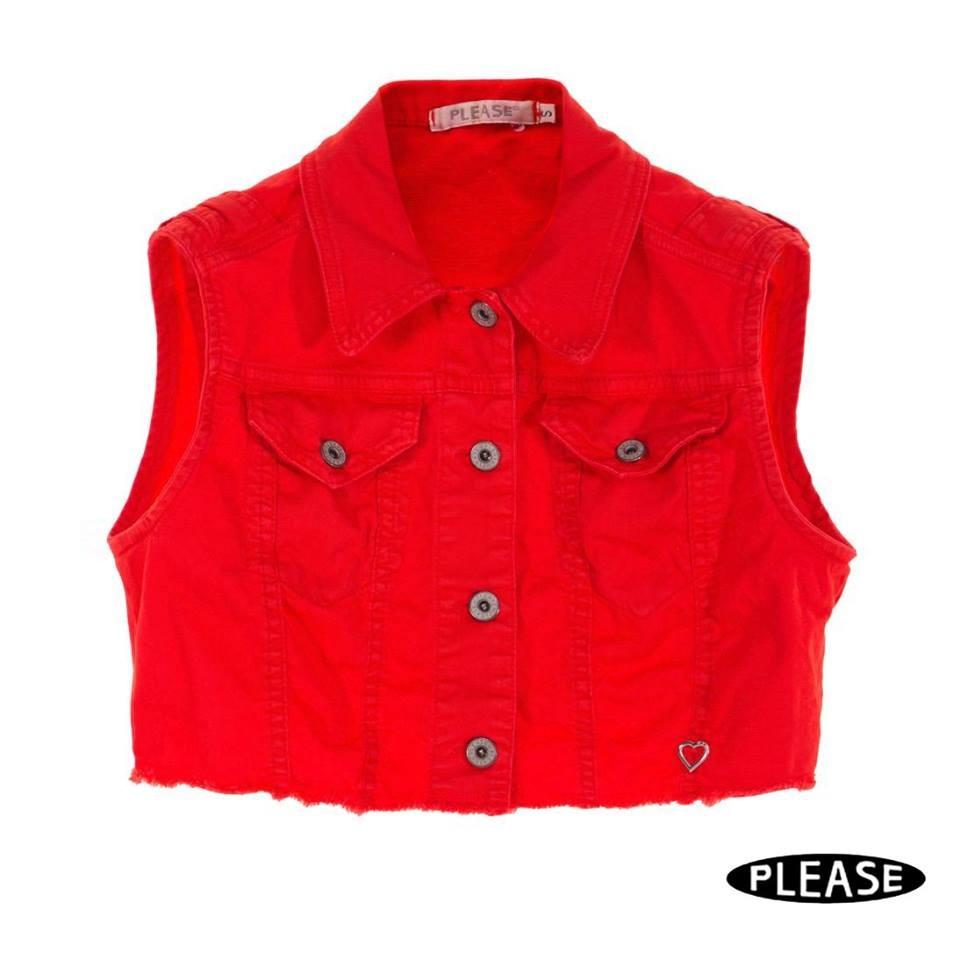 Модная красная джинсовая куртка без рукавов. Это короткая модель комплектуется идеально с юбками и джинсами или шортами высокой посадки.