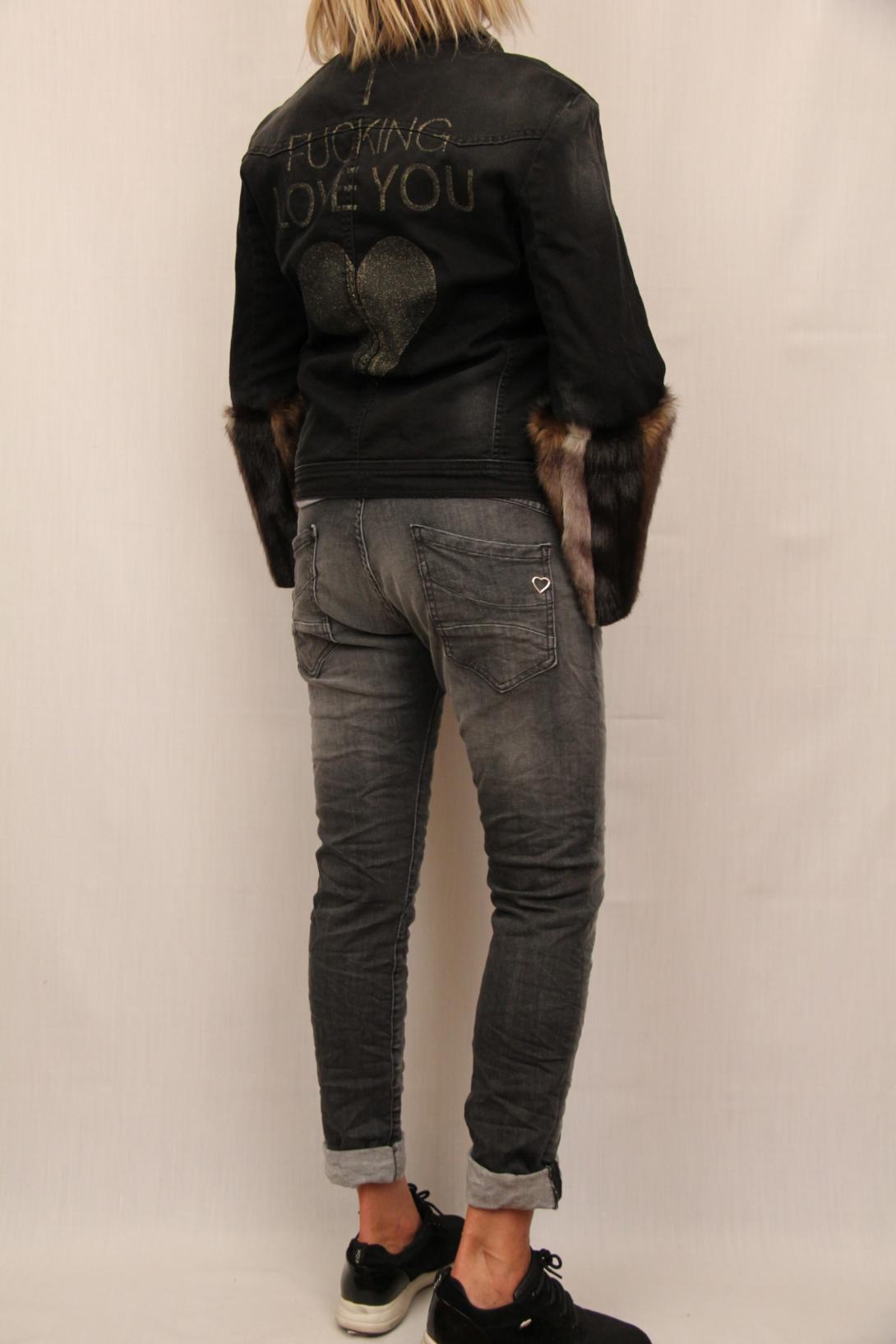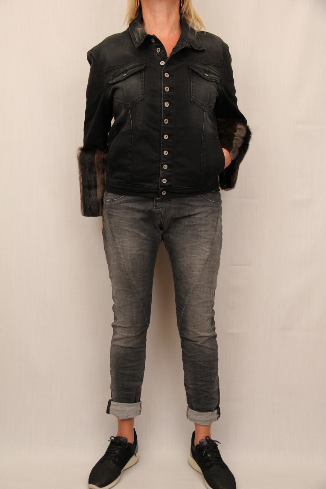 Модная джинсовая куртка с манжетами из меха от итальянского бренда Please. Меховой манжет, напоминающий норку, отстёгивается.