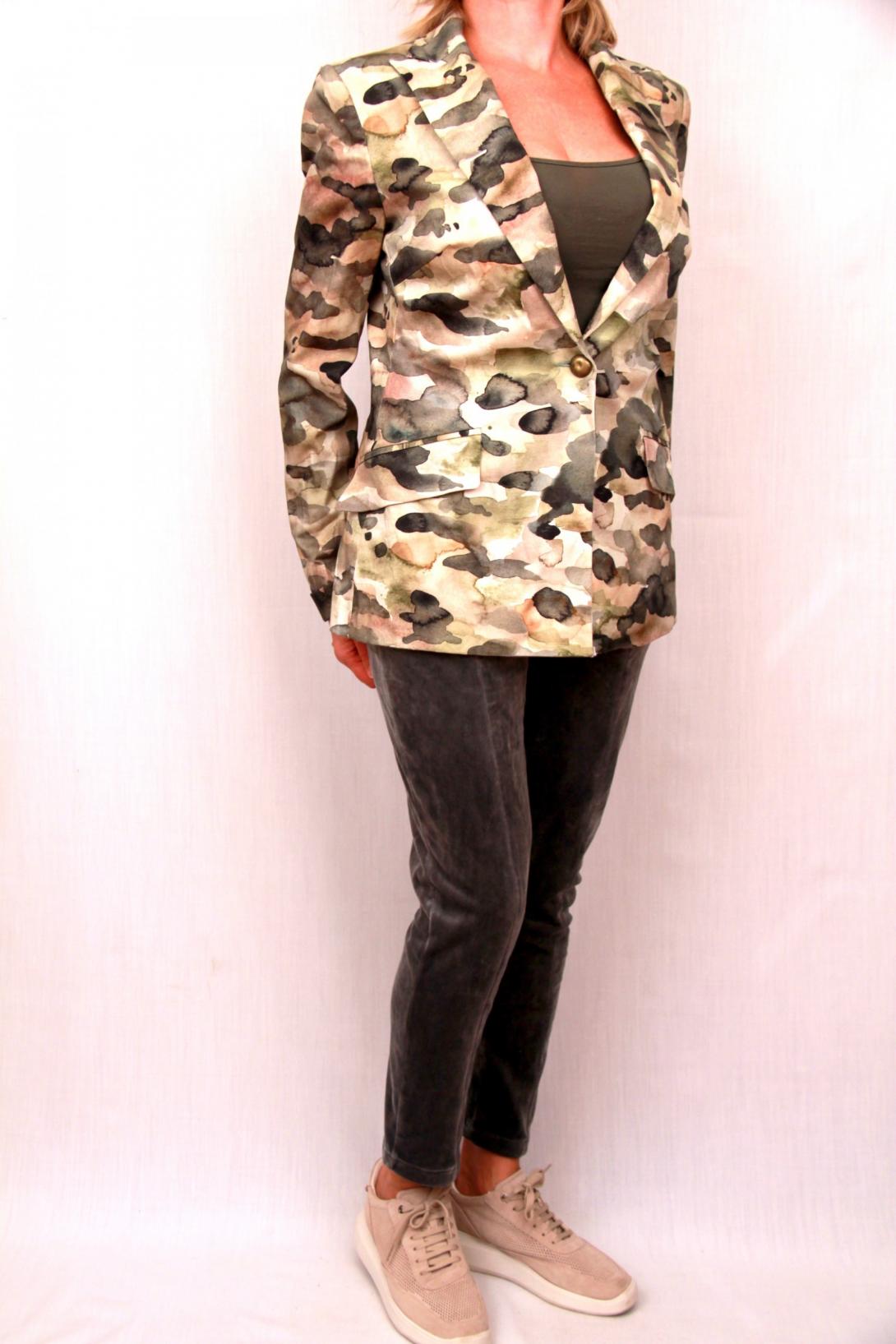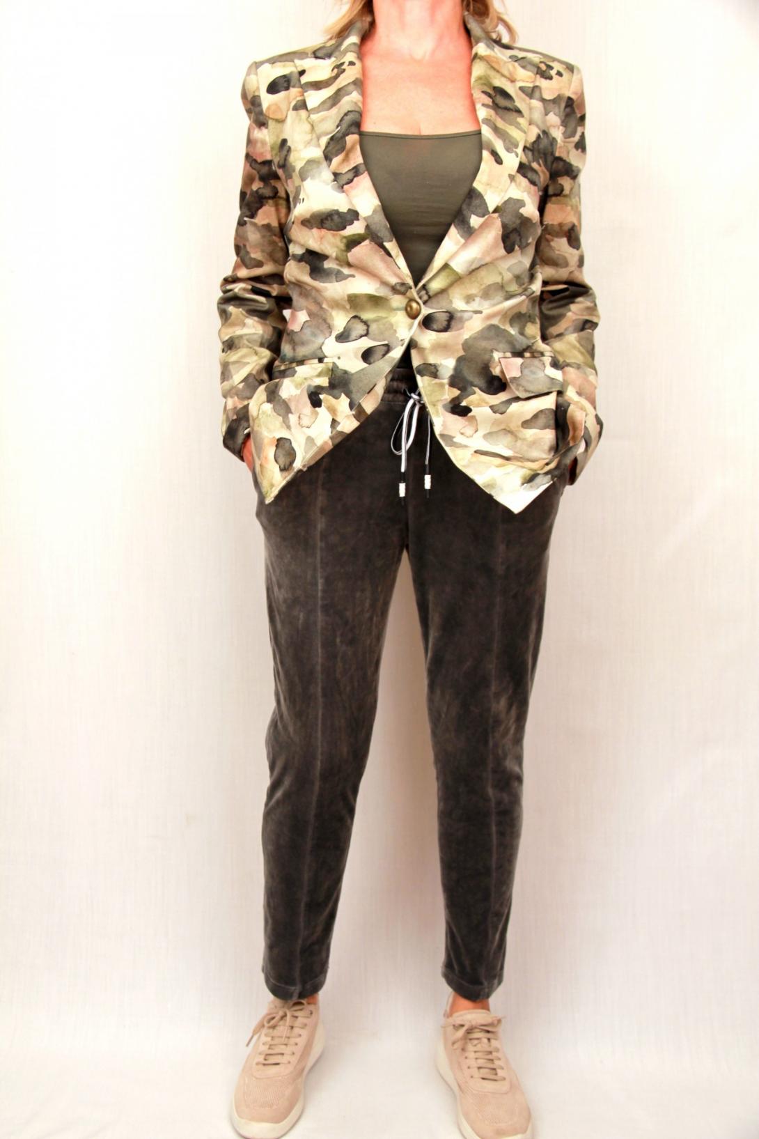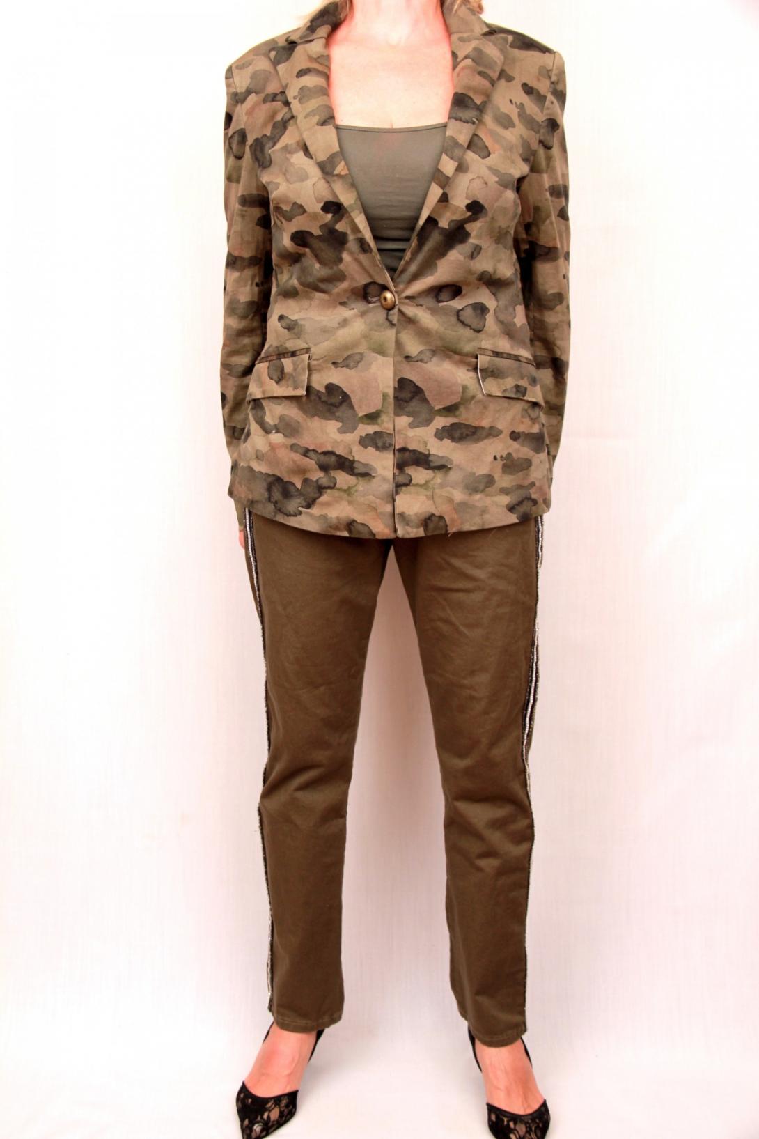 Очень модный жакет с подплечиками, стилизован в стиле милитари. Жакет комплектуется с брюками из бархата.