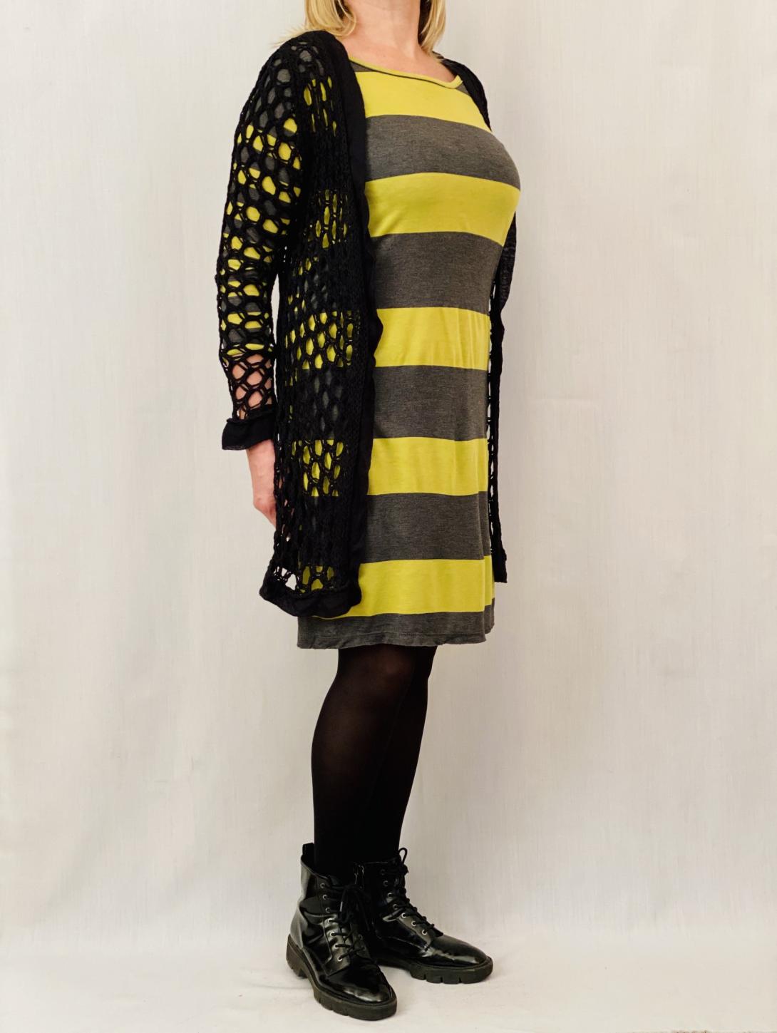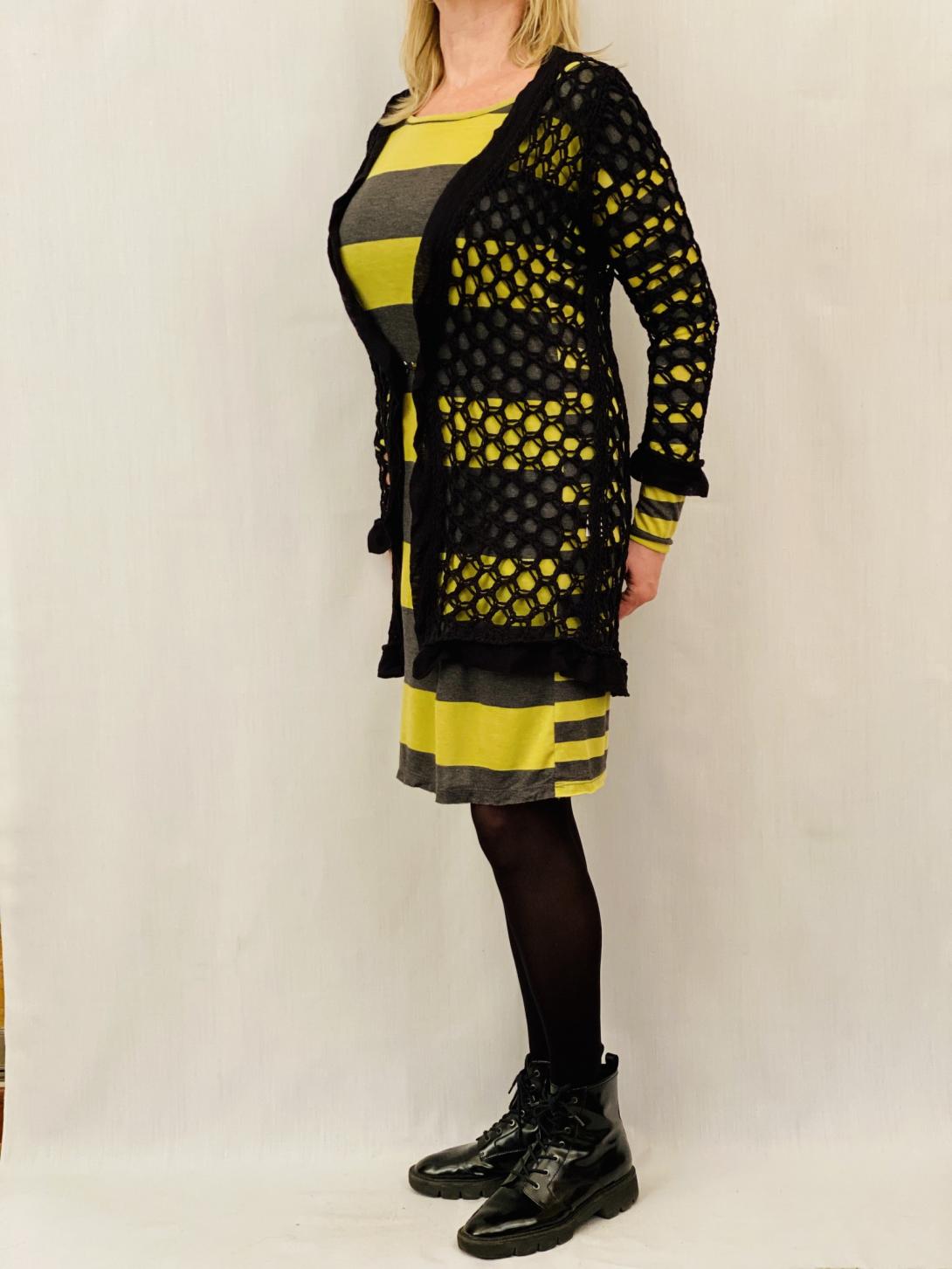 Кардиган чёрного цвета в виде крупных ячеек . Такую вещь можно накинуть на безрукавное платье . По подолу, рукавам отделка шёлком. Застёжка удобная - крючок.