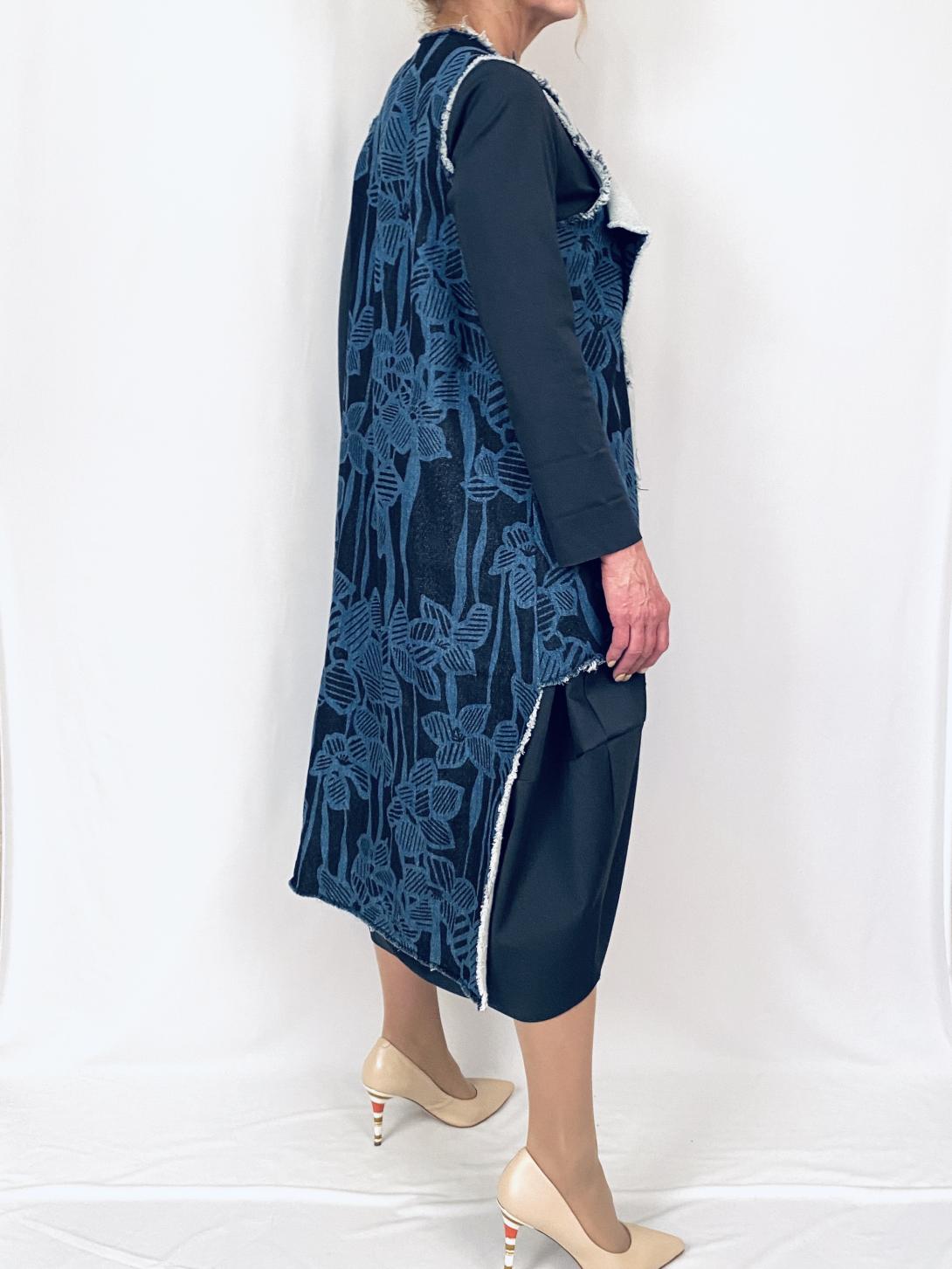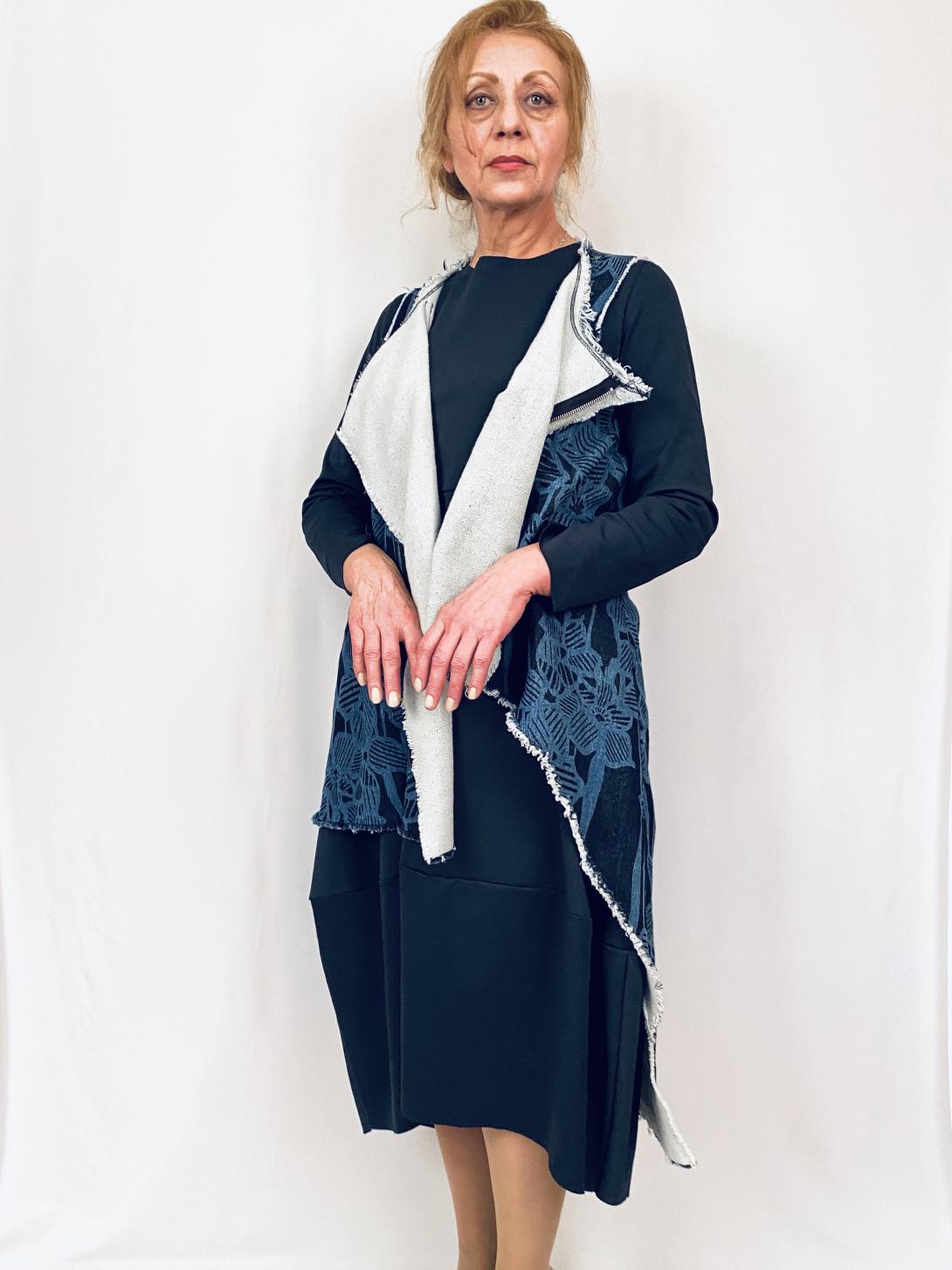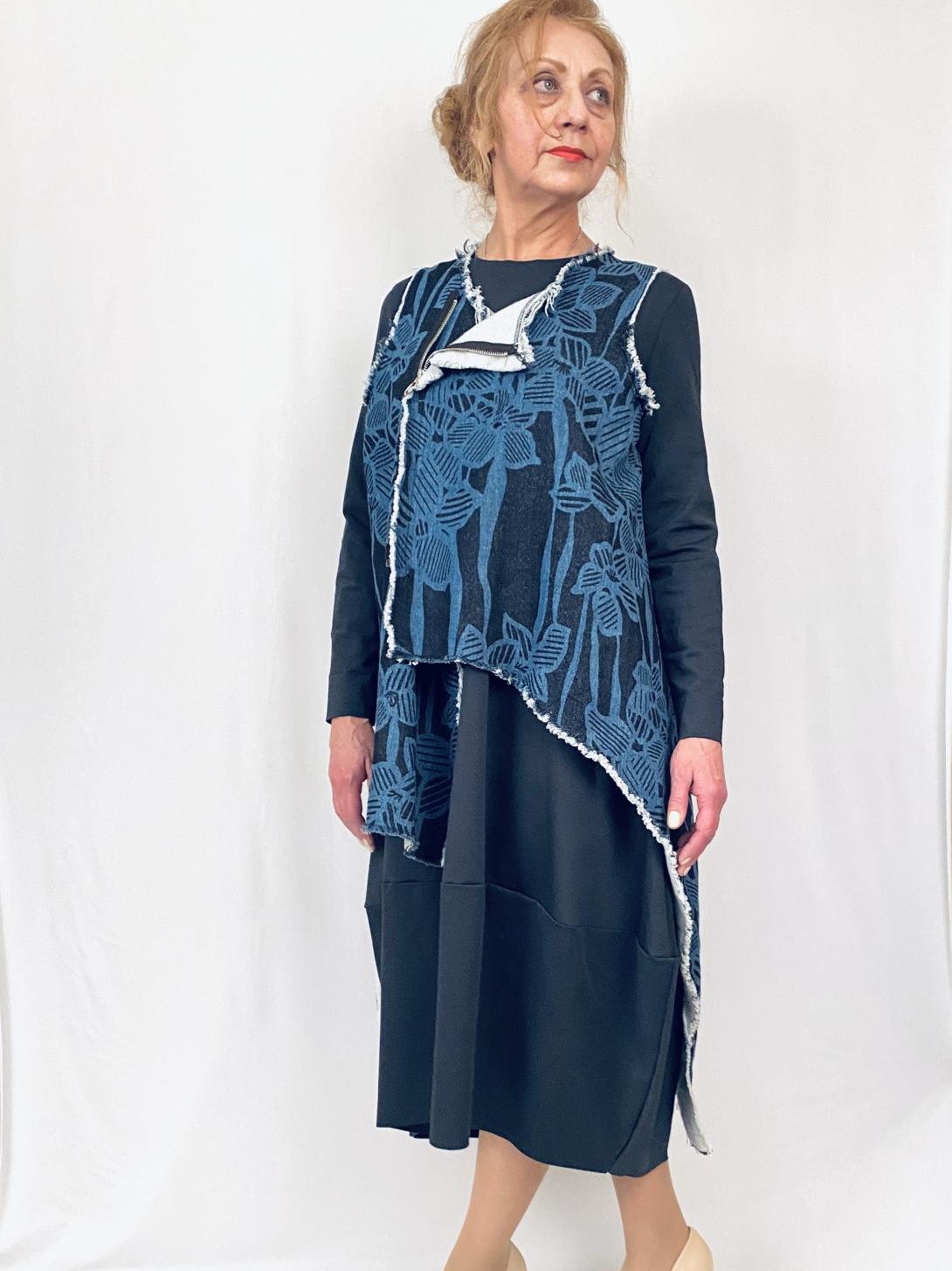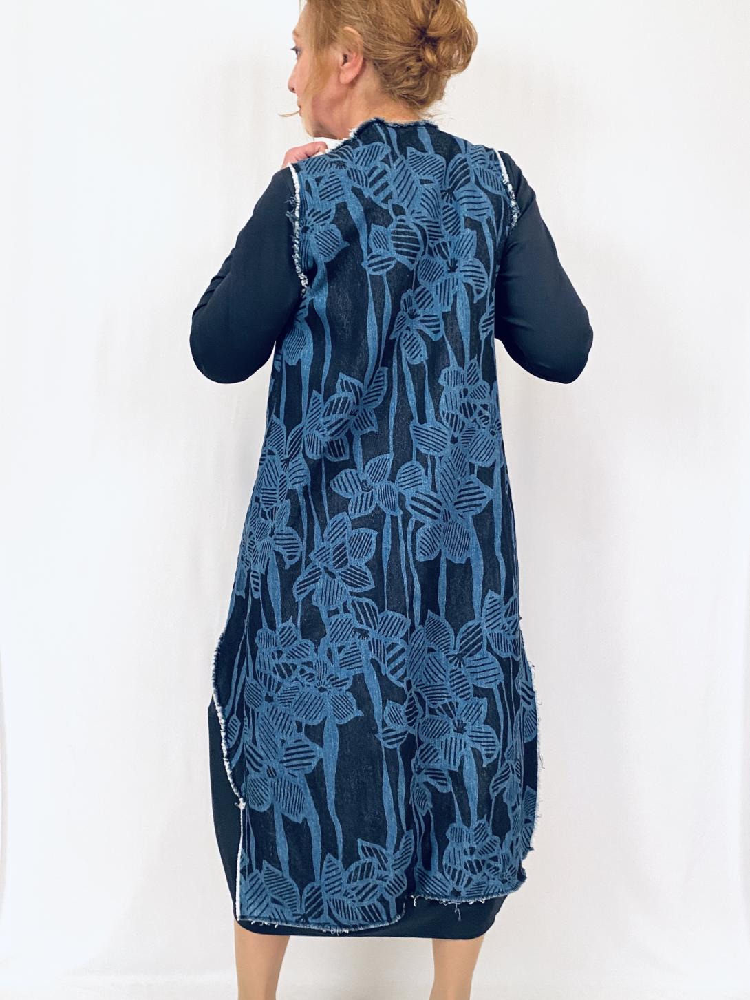 Принт в виде флористического рисунка придает жилету оригинальность и неповторимость.