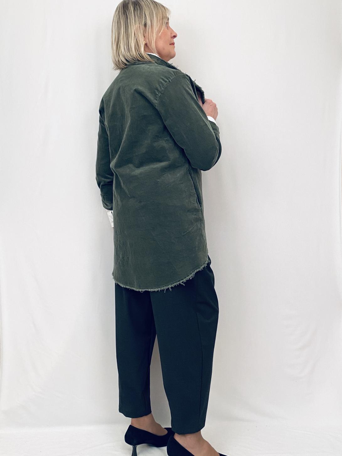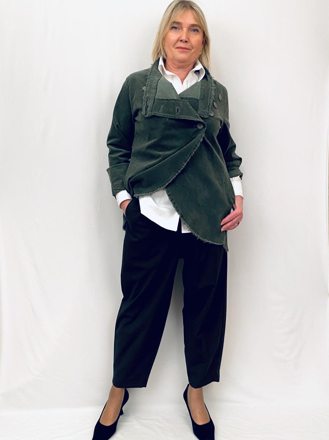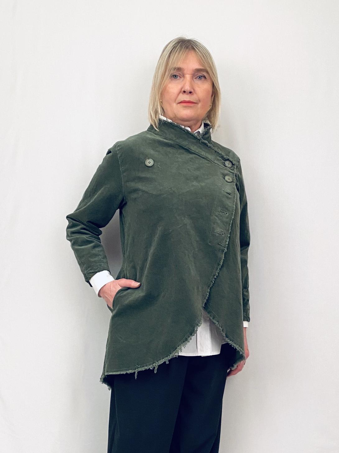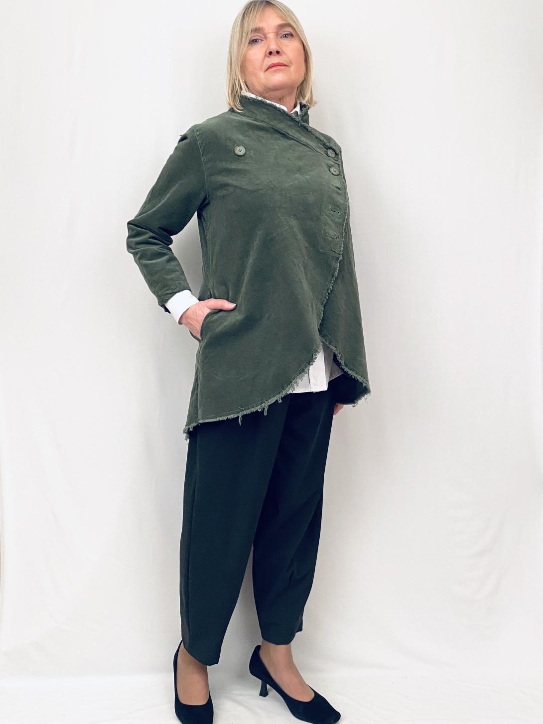Креативный жакет из велюра.Не стандартный крой, не обработанные края.Застежка по -косой.Зеленый жакет из велюра: креативный и стильный выбор