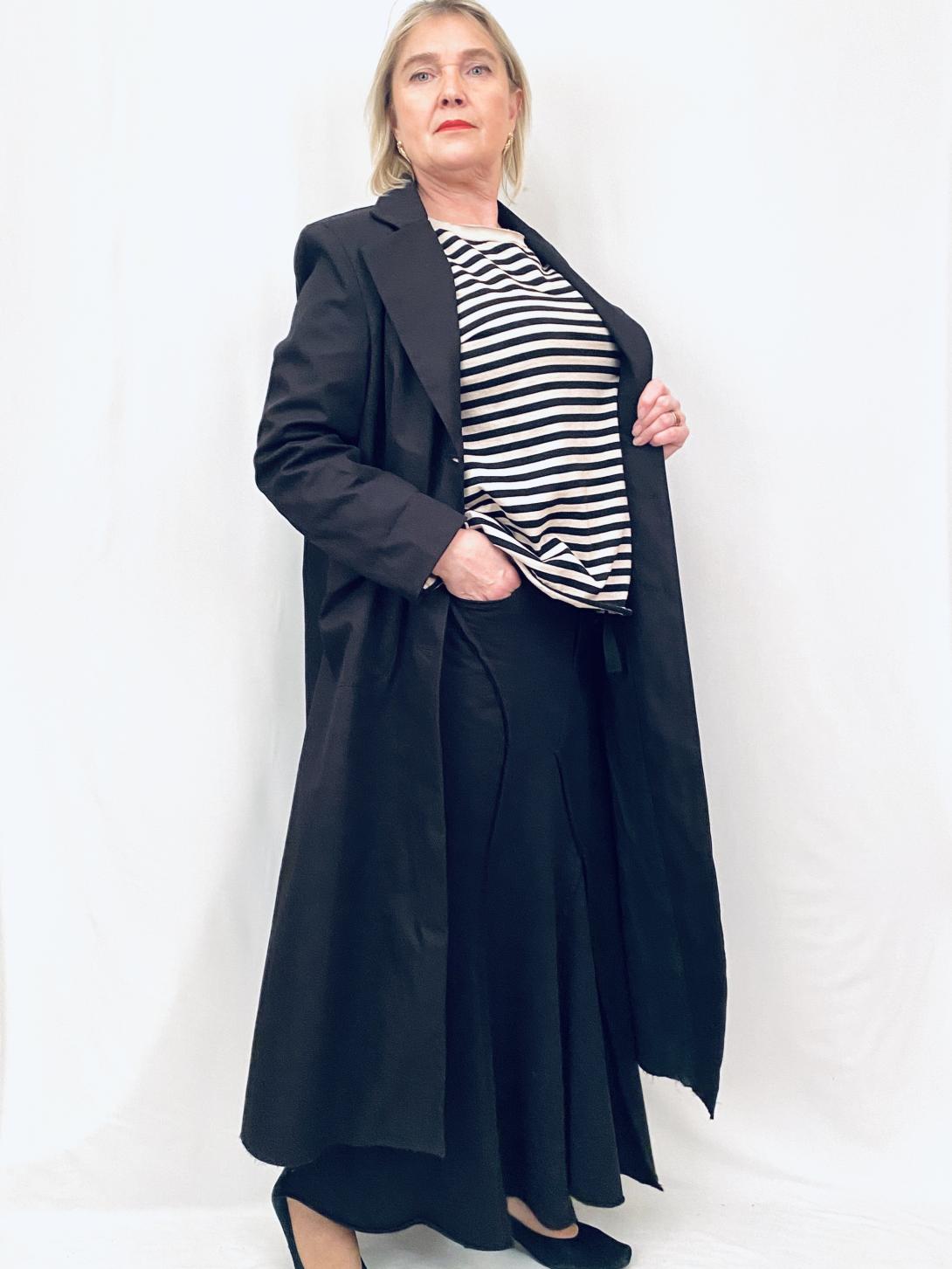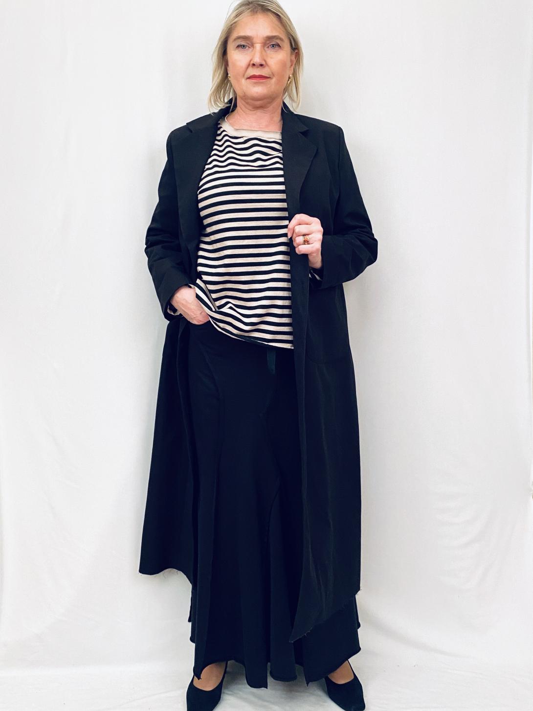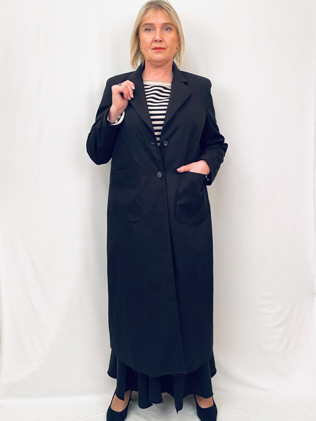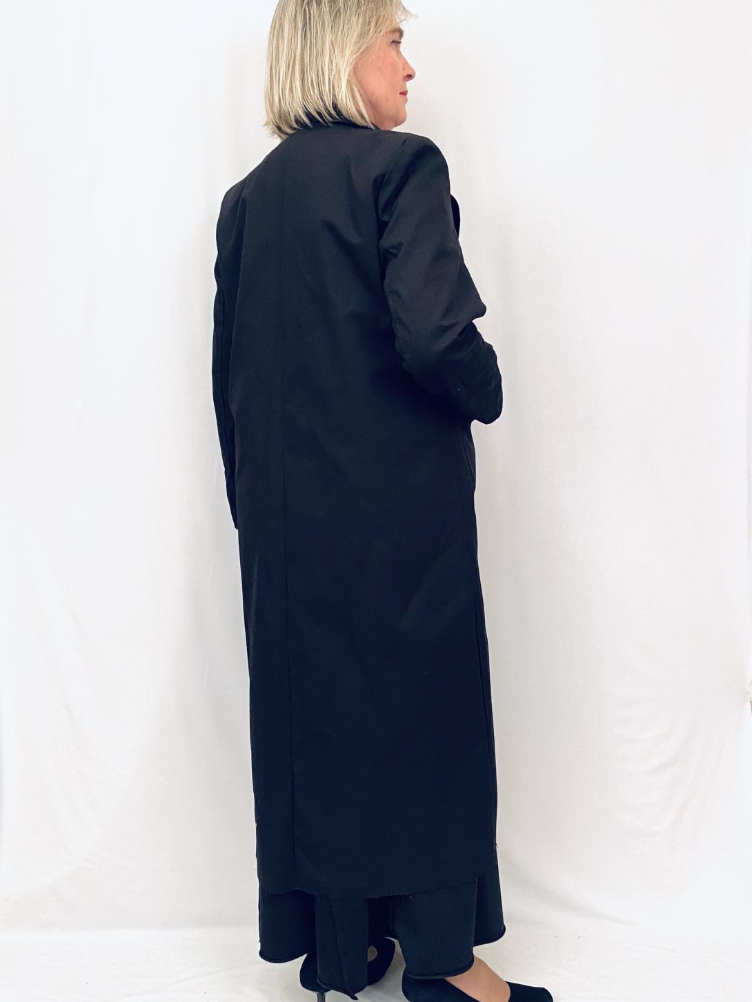 Полуприлегающий силуэт и удлиненная длина жакета подчеркивают женственность и элегантность образа.