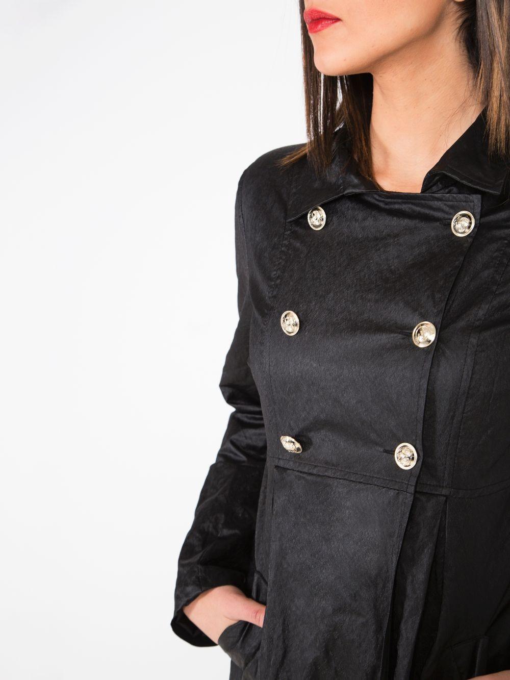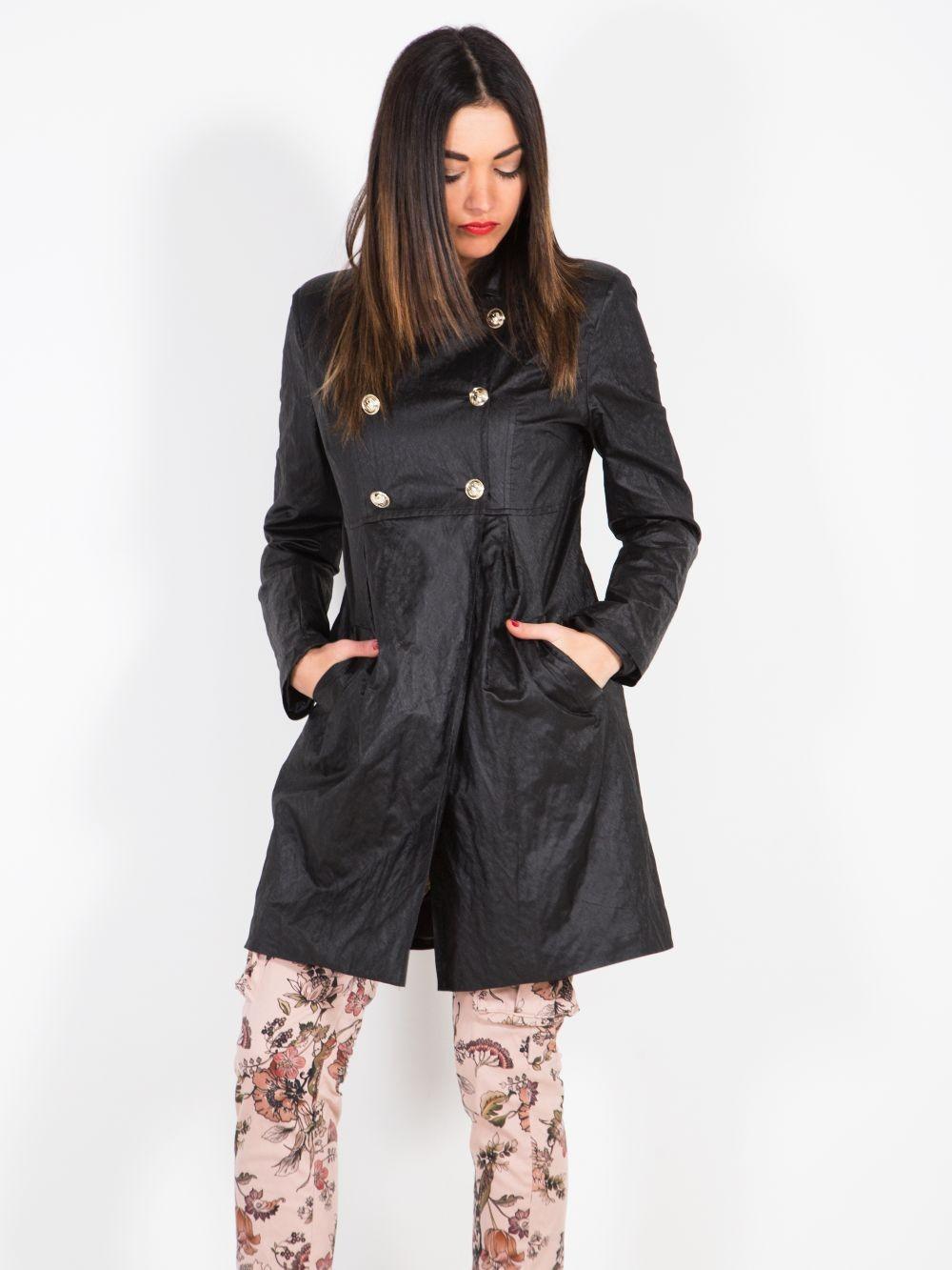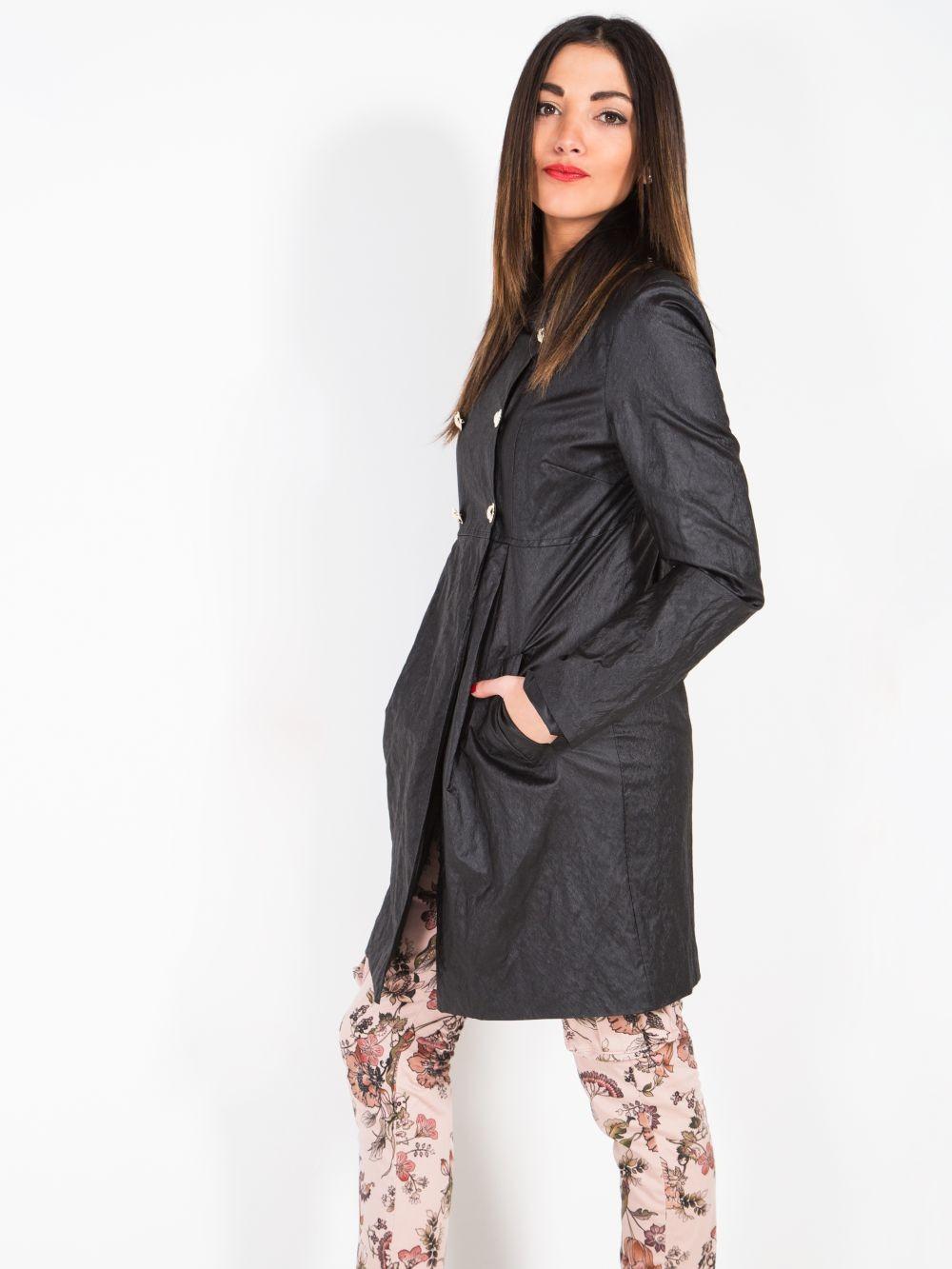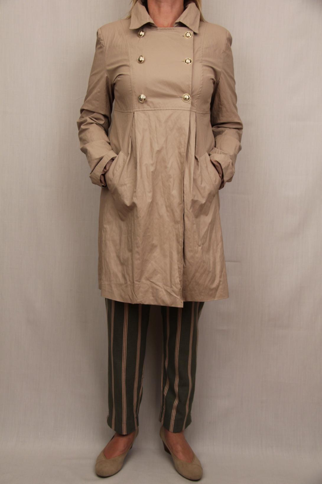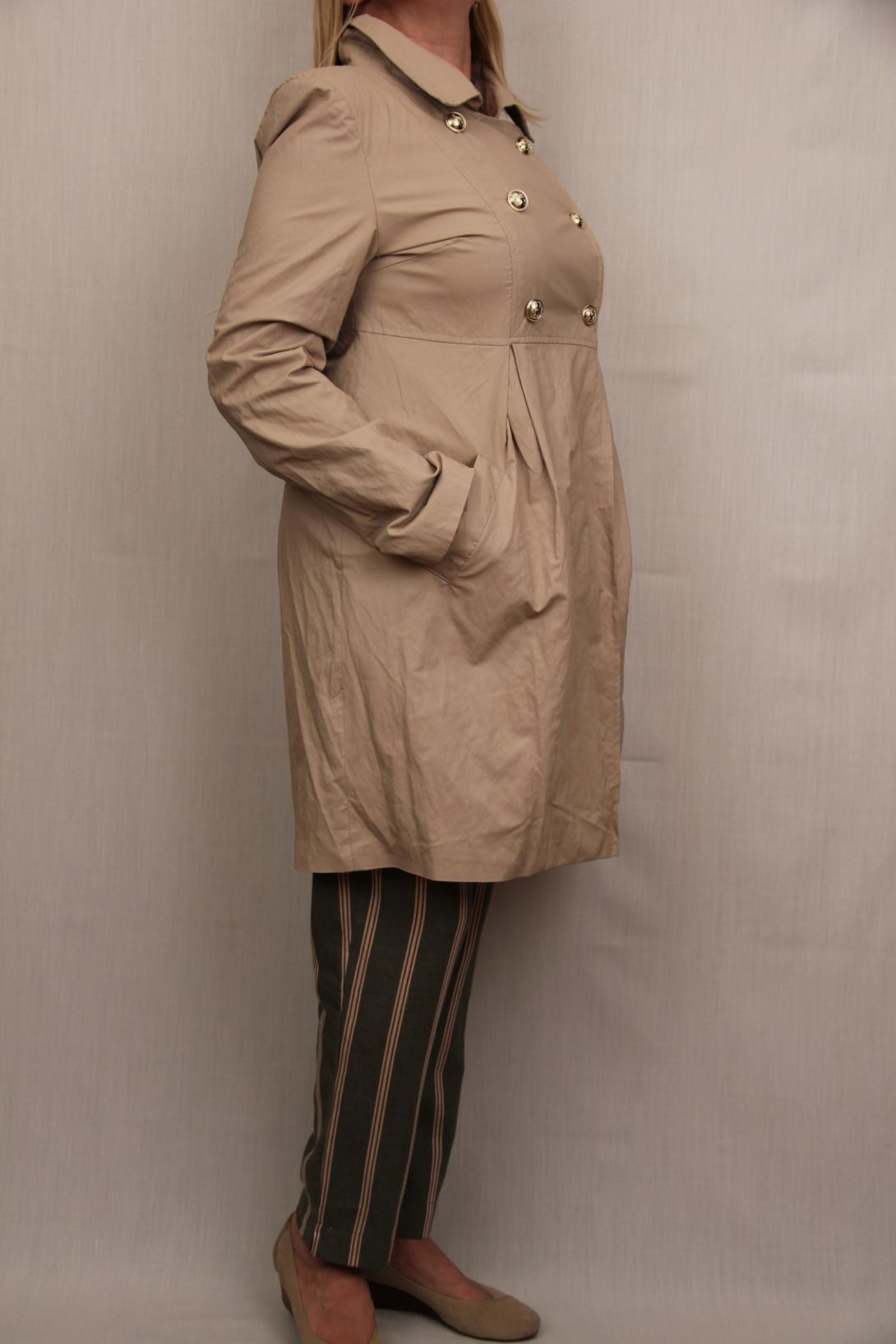 Стильный двубортный плащ с золотыми пуговицами перламутрового цвета напоминает эко кожу. Производство Италия, бренд Please.
