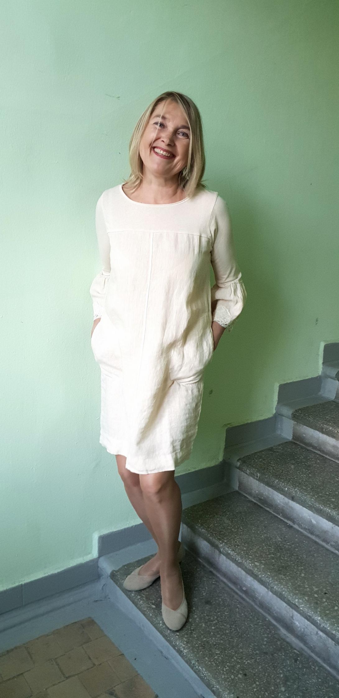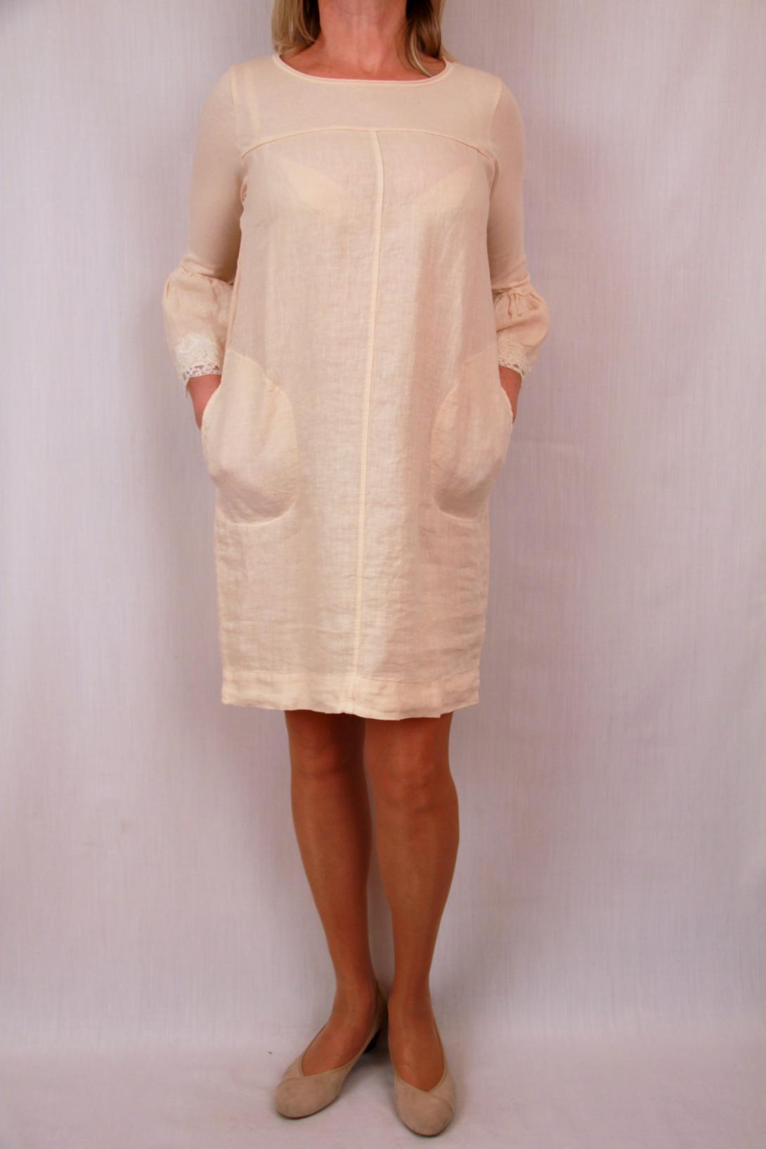 Платье из льна кремового цвета. Платье с трикотажным рукавом, с красивыми кружевом.