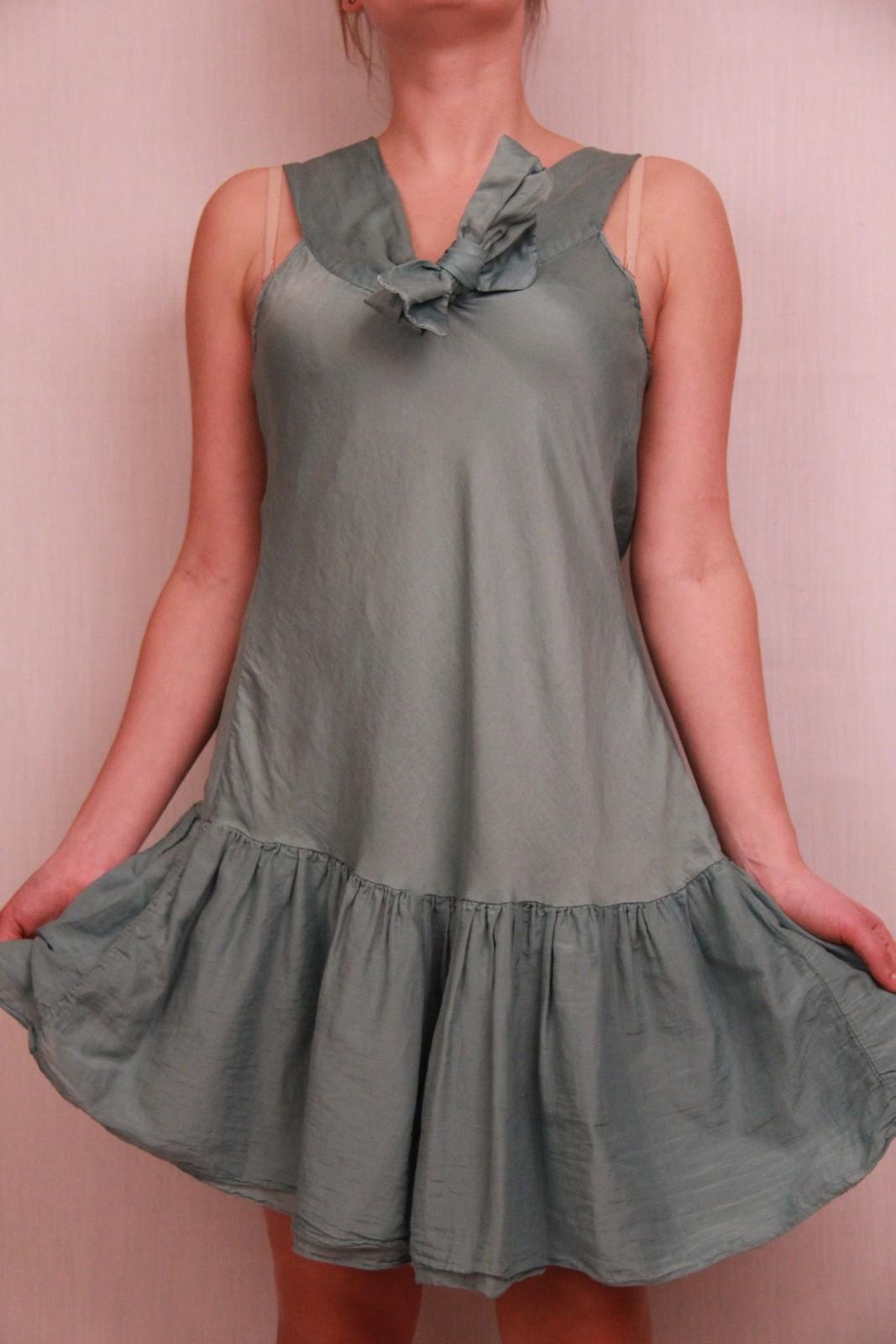 Сарафанчик скроен по косой линии. Модель выше колена. Для лета прекрасная модель платья без рукавов. Цвет нежно бирюзовый.