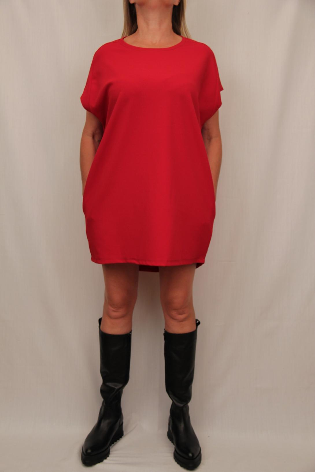 Платье красного цвета свободного кроя. Можно носить самостоятельно, а можно дополнить базовой майкой или блузкой Please.На ноги одеть плотные колготы, брюки или джинсы узкого кроя.